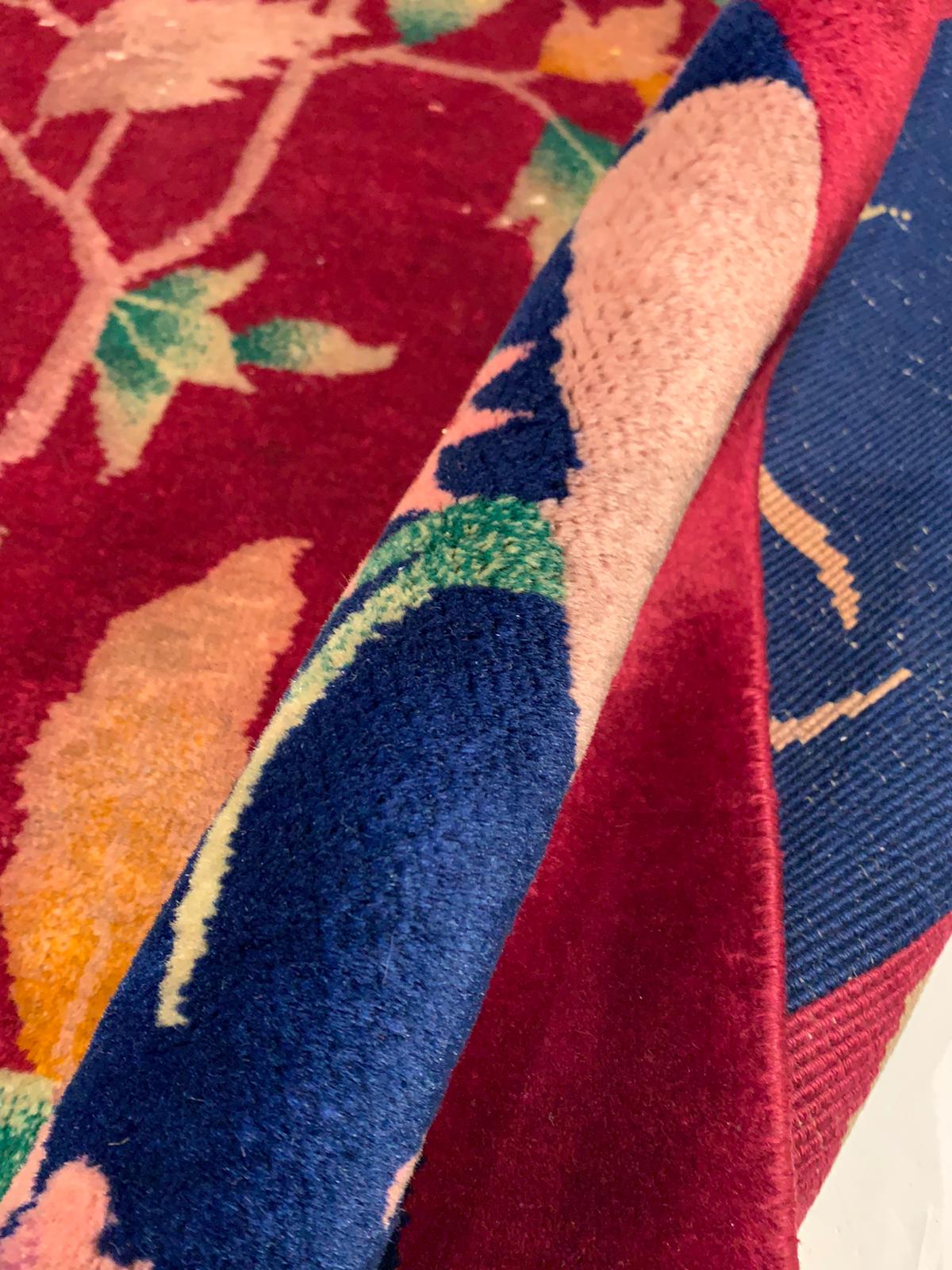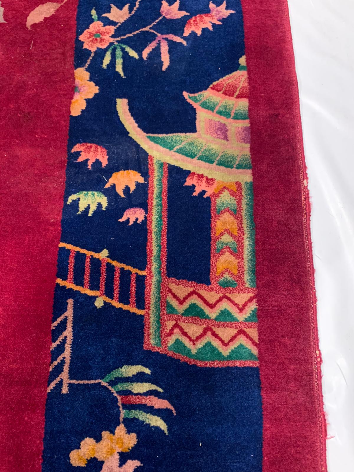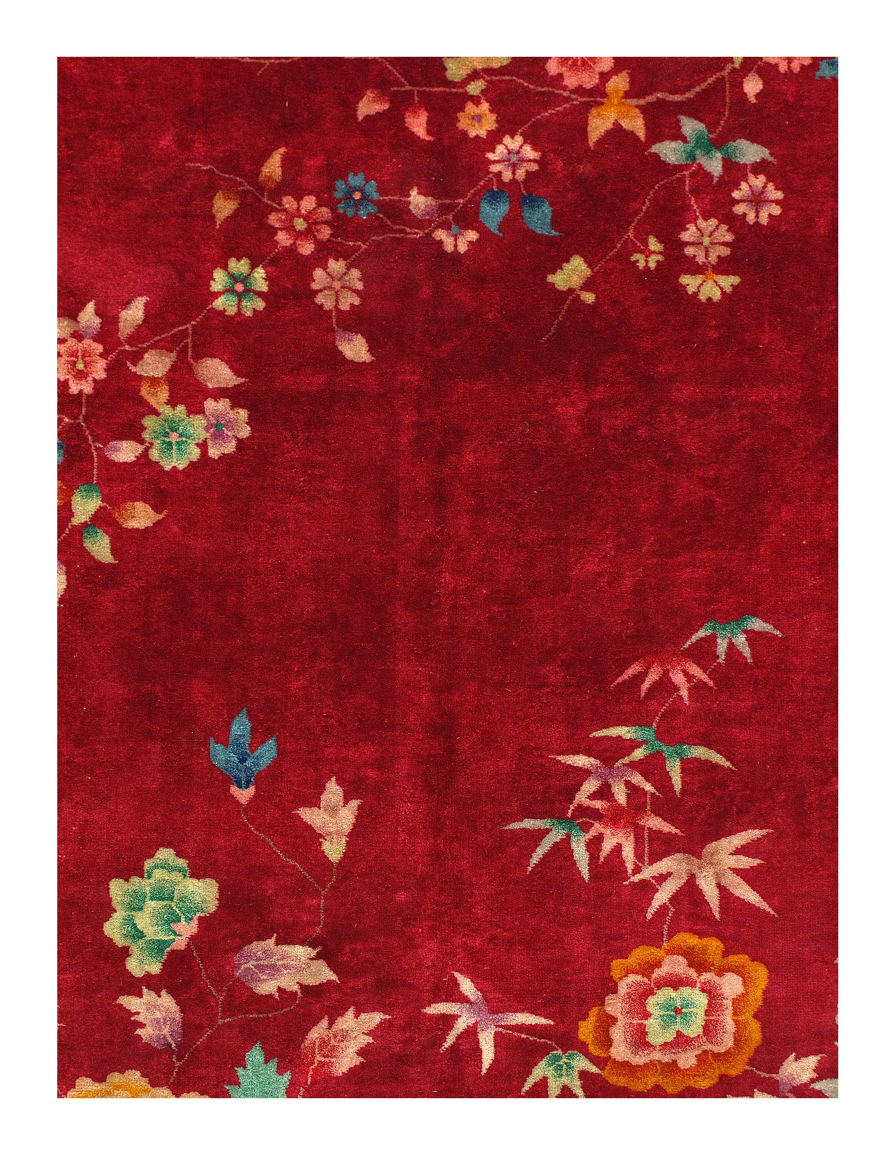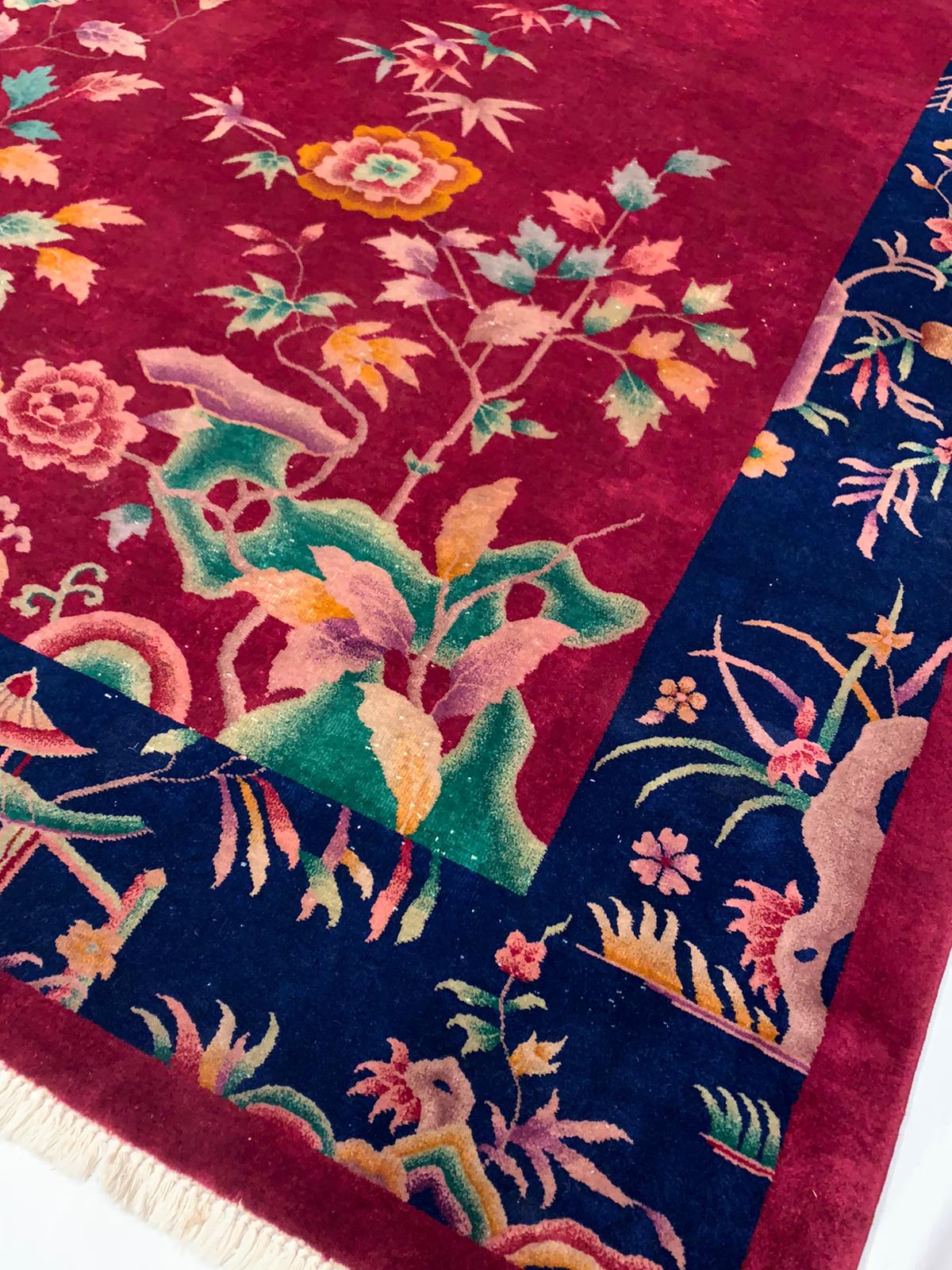 Chinese Deco Rug, Origin: China, Circa: Early 20th Century β Here is an exciting and appealing antique Oriental carpet β an antique Art Deco rug that was designed and woven in China during the early years of the twentieth century. Heavily informed by the aesthetic inclinations of the Art Deco period, this unique carpet is a compelling and thought-provoking example. A scalloped border of Blue enclose Red / Navy sand field on this exquisitely subtle and restrained antique Chinese Art Deco. At first the field appears empty or open, but it is actually covered by a tone-on-tone design of scrolls and cloud-bands emanating inward from the outer edges. In their sinuous rhythms they echo the scalloped forms of the border and continue its visual effects across the carpet in a more subdued manner. This carpet testifies to the masterful design sensibilities of Chinese weavers as they made the transition into the modern world. The Art Deco movement had an outside influence on the world of art and design, and some of the most important qualities and characteristics of that movement may be found in this fine rug.