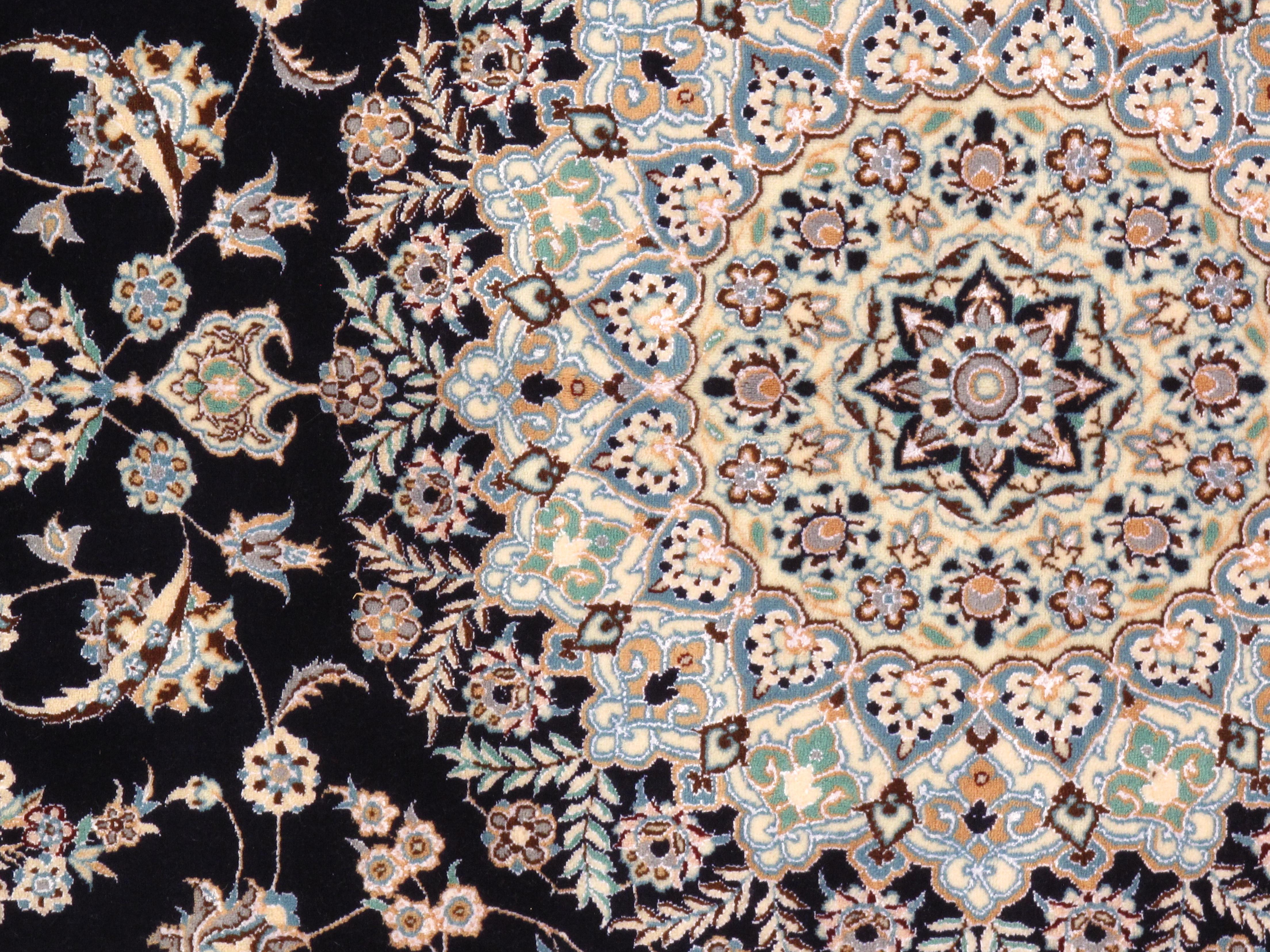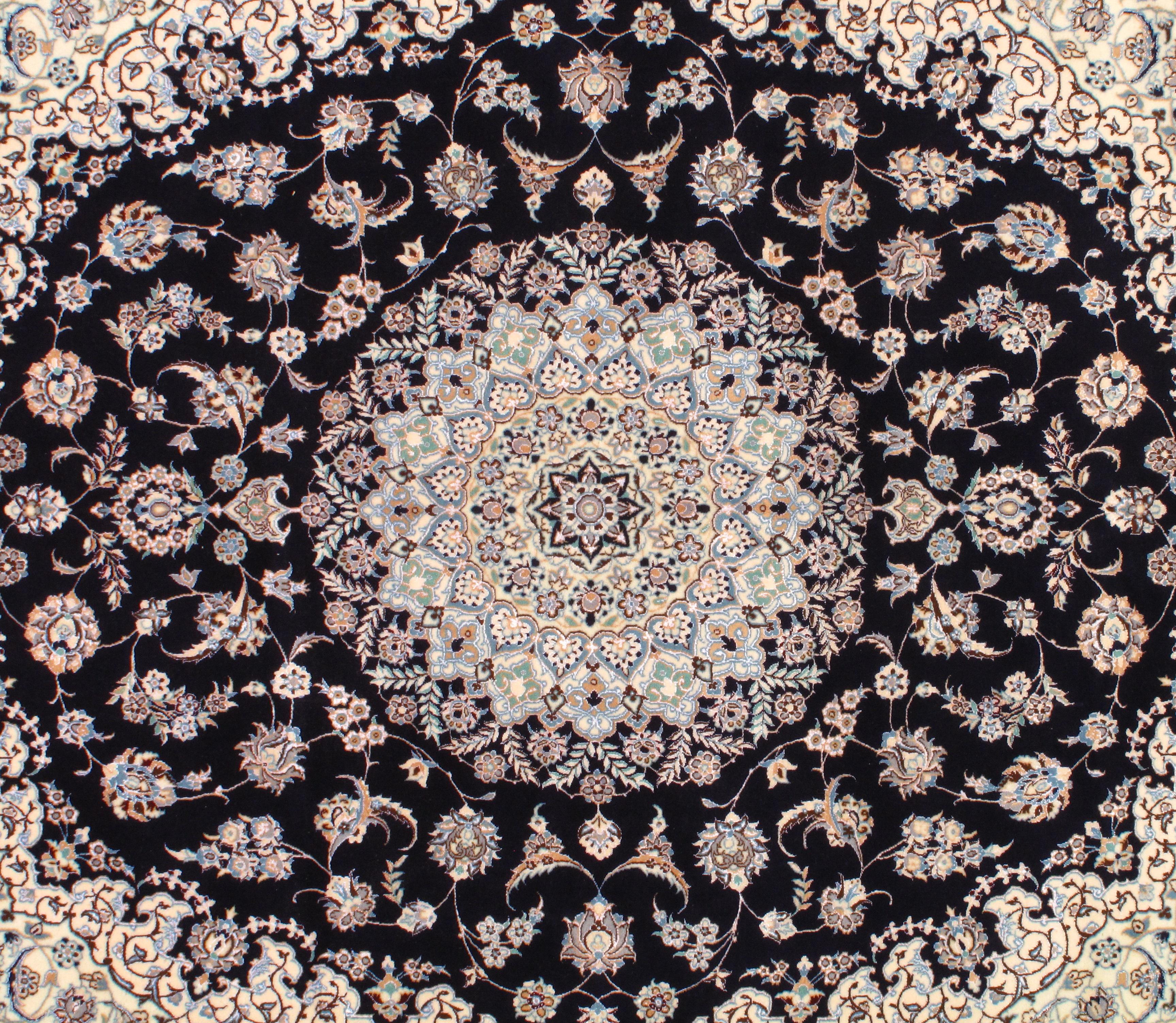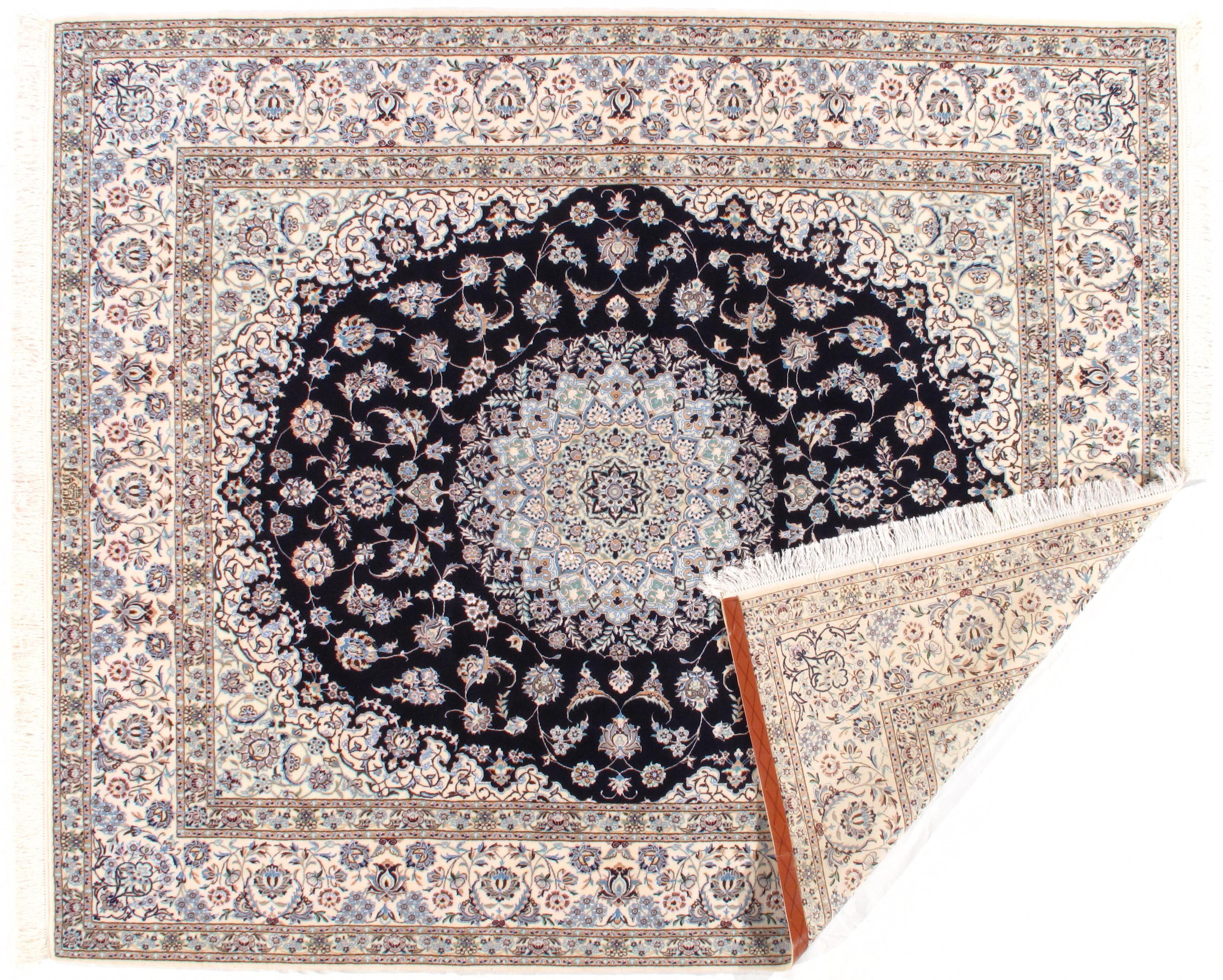 Woven by skilled artisans, Persian Nain rugs are highly sought after. They are made with beautiful muted colors, predominantly beige and navy. Light blue, burgundy, and green are used occasionally. They are woven using the Persian knot. Iranian Nains usually have a cotton warp, however, sometimes silk warps are used. The pile is characteristically wool, but weavers may use silk or accent with silk. A featured characteristic is a central medallion, which is at times adorned with floral motifs and animals, mostly birds.