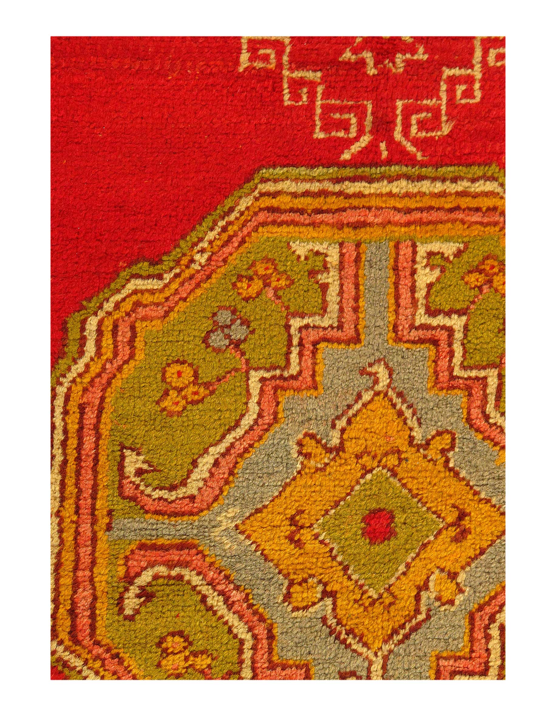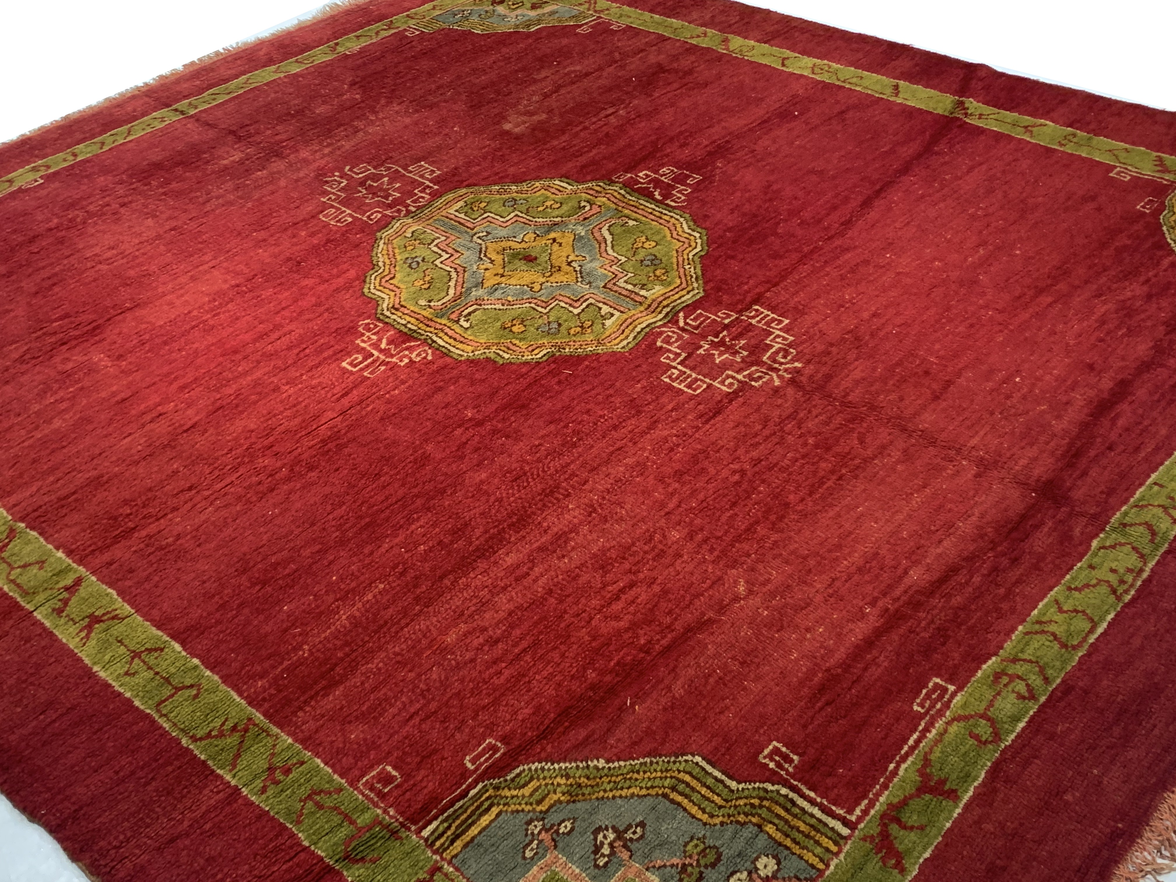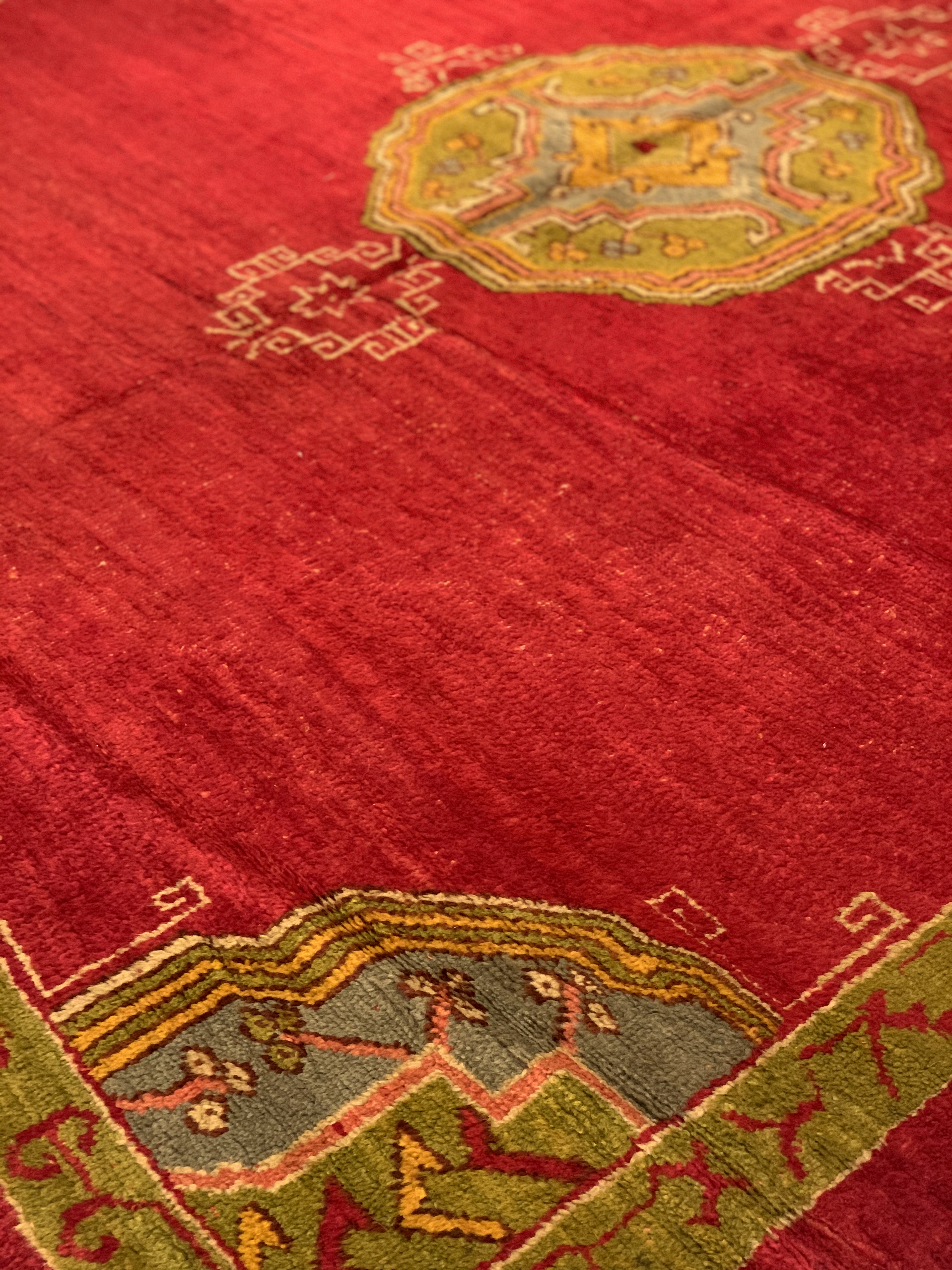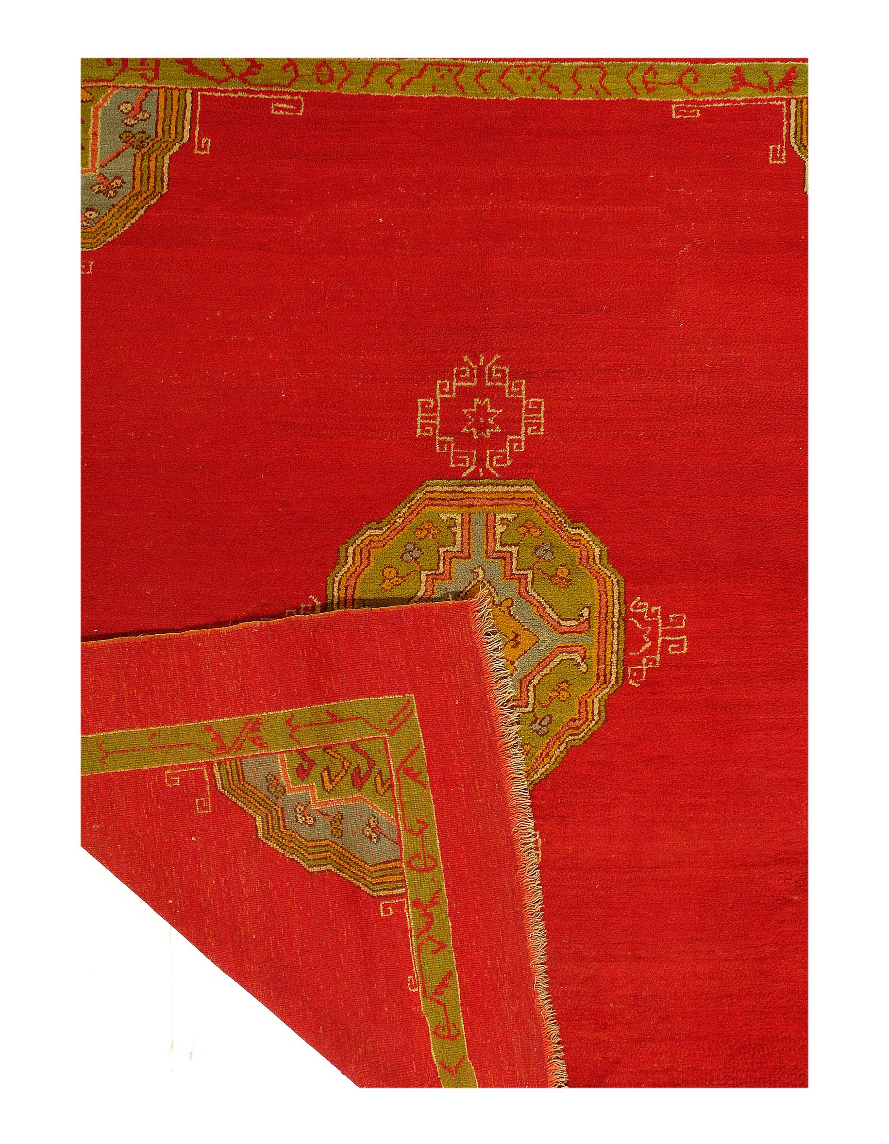 This antique Oushak rug. The viewer is immediately taken on a journey through an almost dessert-hued landscape. From soft, red/ Gold to sweet shades of , beige all aspects of the antique rug are unified in an attractive display of color. Angular, leafy motifs decorate the inside of the largest border encircling the work. Between the framework of this border, at the center of the rug, is a whimsical collection of blooms and petals. These elements seem to be carelessly cast around the beige field, as if done by nature, despite the symmetry present.