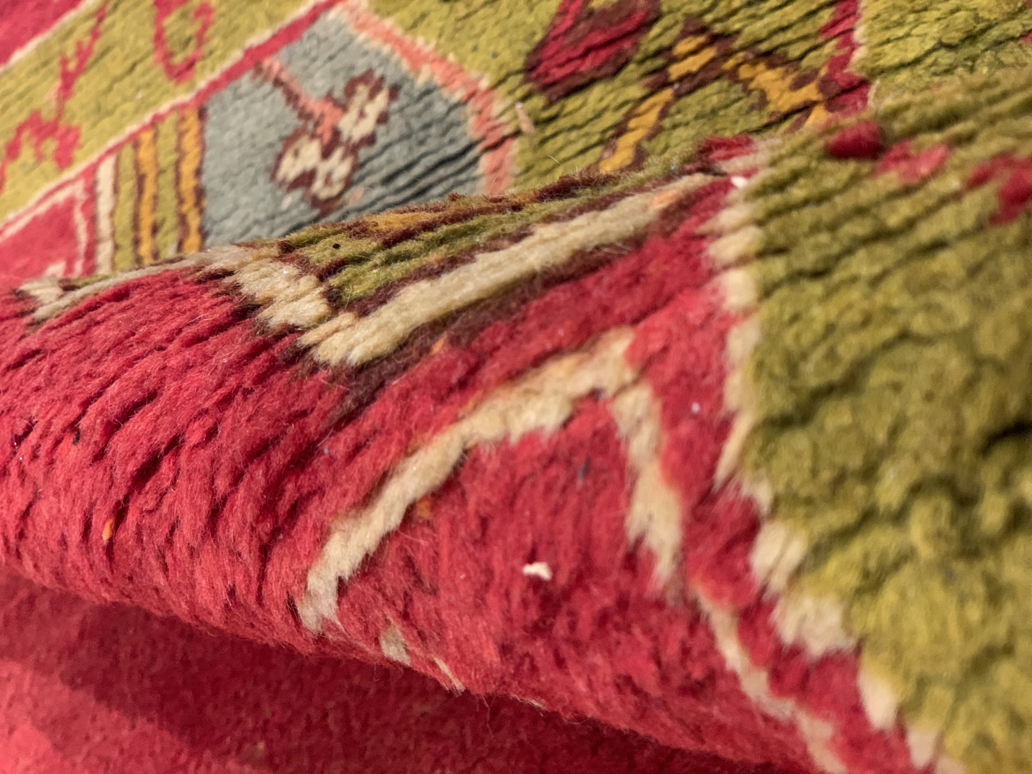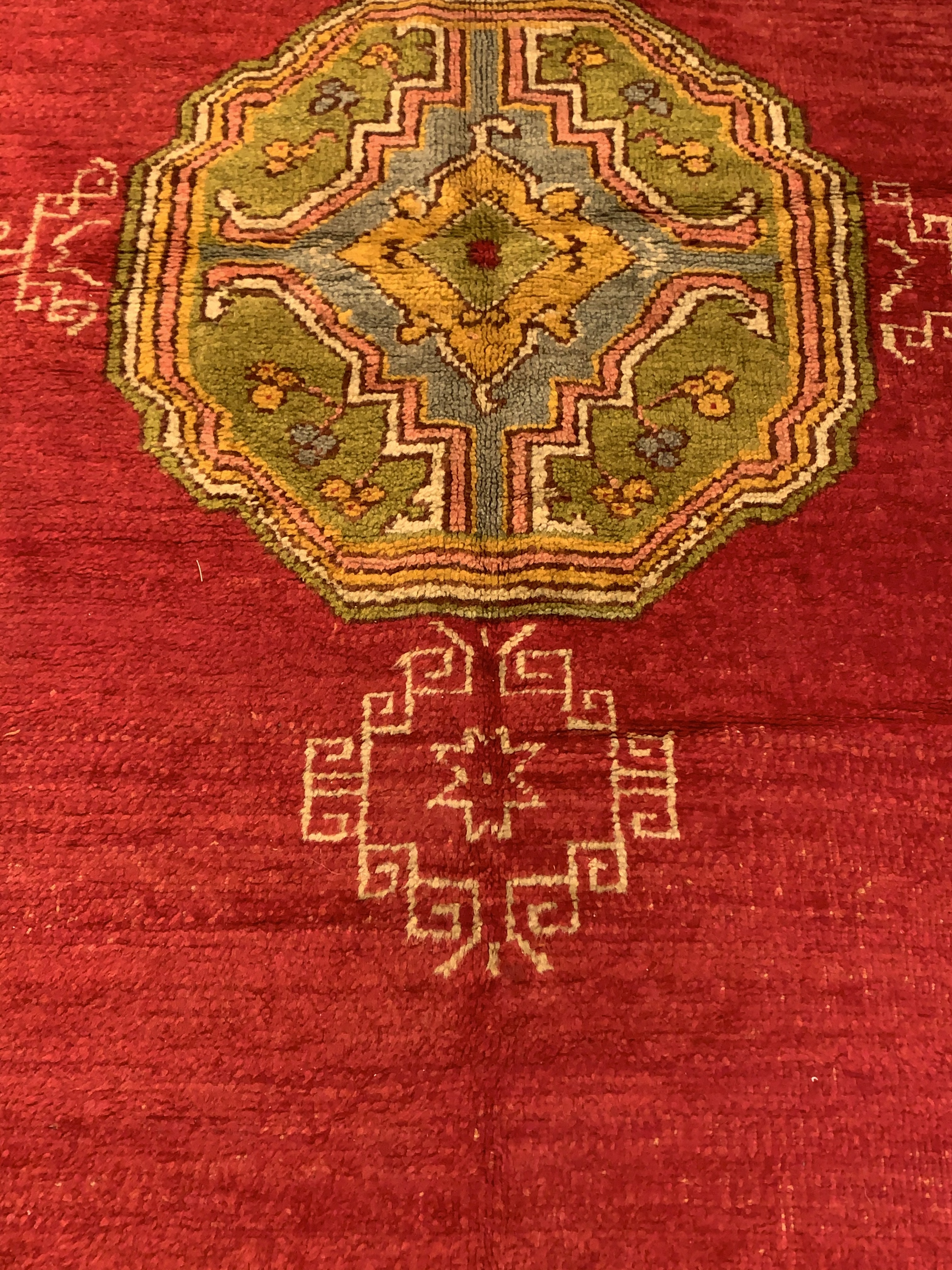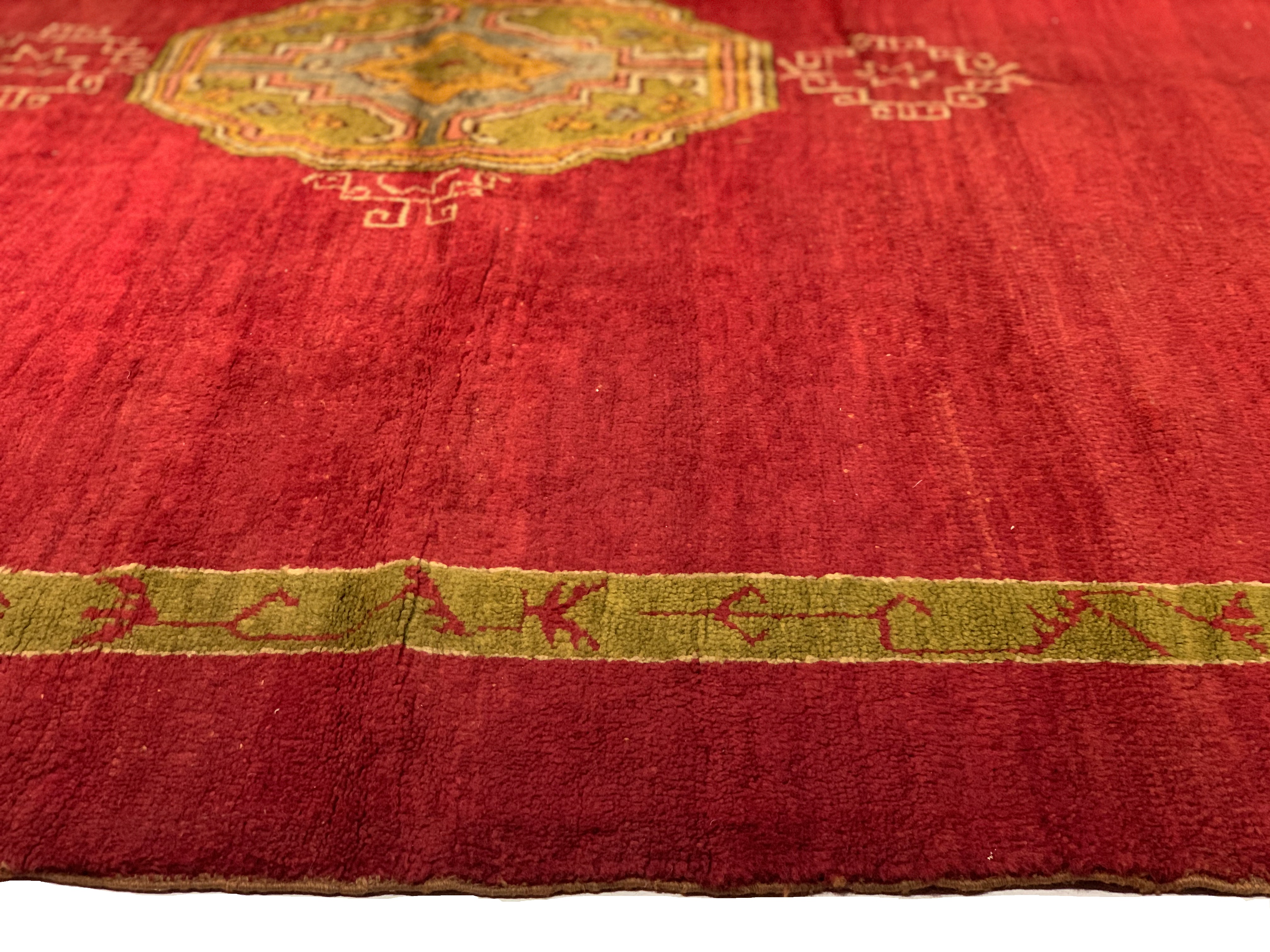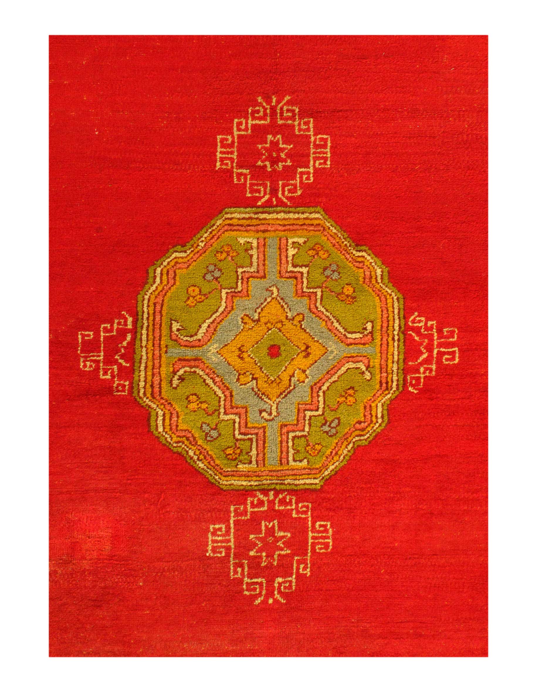 This antique Oushak rug. The viewer is immediately taken on a journey through an almost dessert-hued landscape. From soft, red/ Gold to sweet shades of , beige all aspects of the antique rug are unified in an attractive display of color. Angular, leafy motifs decorate the inside of the largest border encircling the work. Between the framework of this border, at the center of the rug, is a whimsical collection of blooms and petals. These elements seem to be carelessly cast around the beige field, as if done by nature, despite the symmetry present.