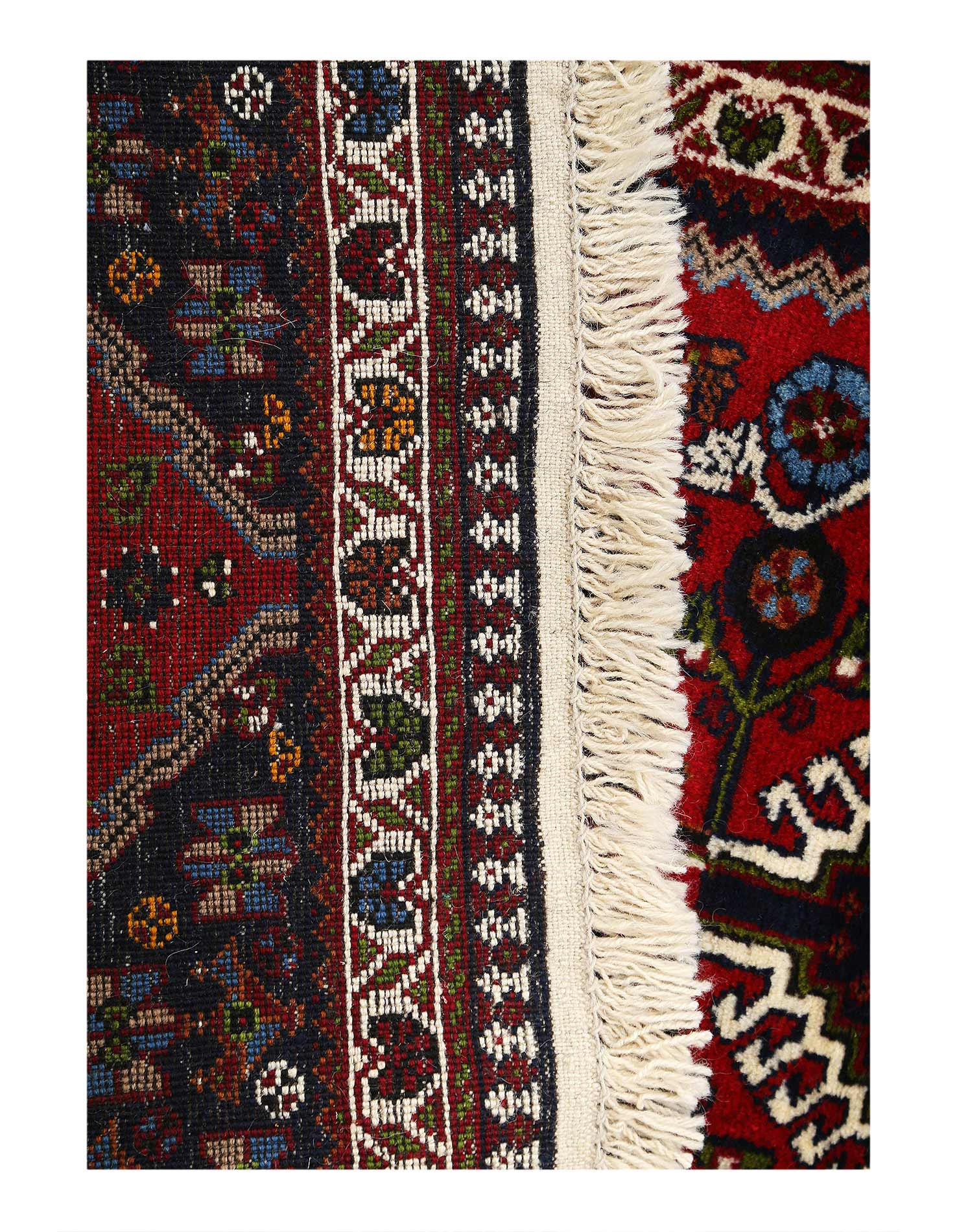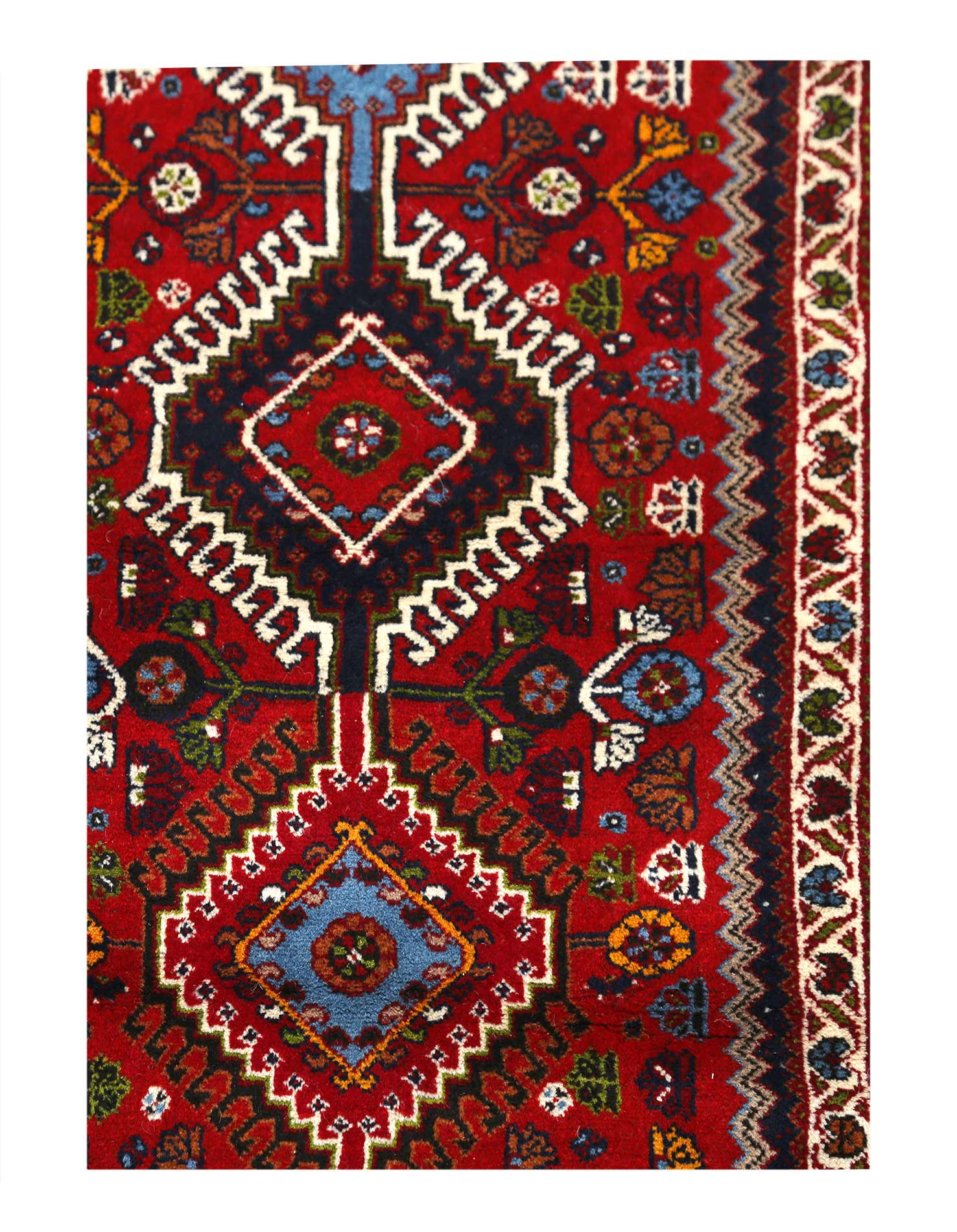he pile used in Yalameh rugs is very fine, particularly in comparison to other tribal designs, using soft wool based on a Wool foundation. The pattern is distinctive with large repeated diamonds in a straight line down the carpet, often with geometrical animal or human prints scattered across the field. Dark red or light brown on a blue or orange background is most common for Yalameh, similar to Shiraz rugs, the rugs compliment modern or minimalist furniture beautifully, giving the living space an aura of luxurious style and warm.