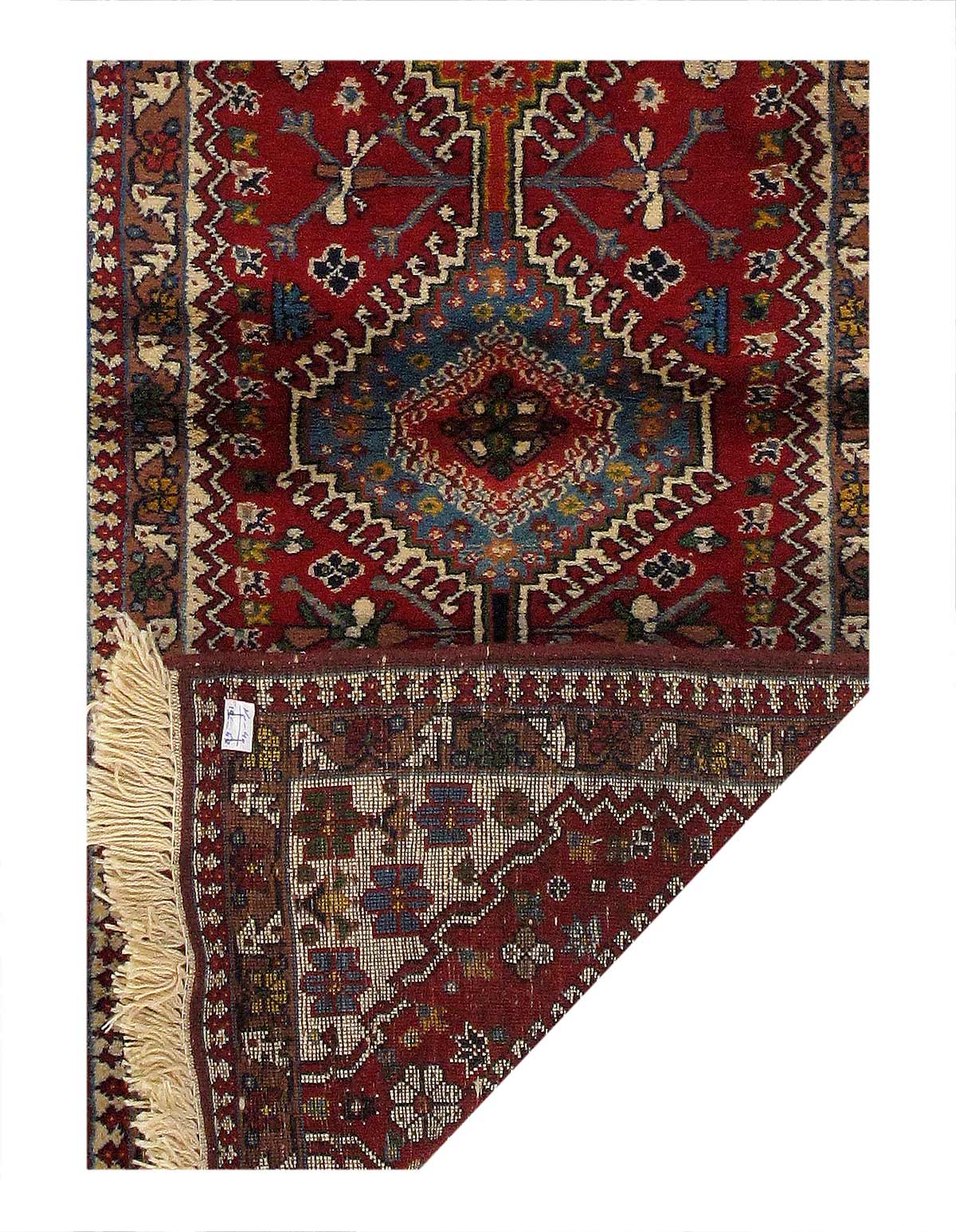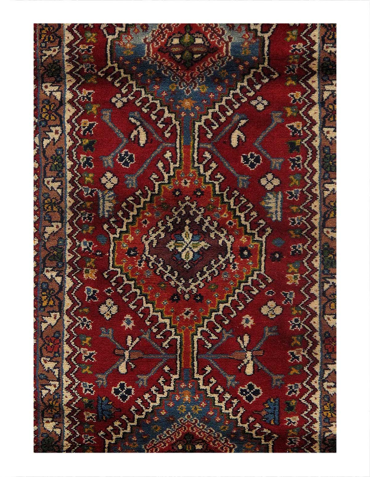 The pile used in Yalameh rugs is very fine, particularly in comparison to other tribal designs, using soft wool based on a Wool foundation. The pattern is distinctive with large repeated diamonds in a straight line down the carpet, often with geometrical animal or human prints scattered across the field. Dark red or light brown on a blue or orange background is most common for Yalameh, similar to Shiraz rugs, the rugs compliment modern or minimalist furniture beautifully, giving the living space an aura of luxurious style and warm.