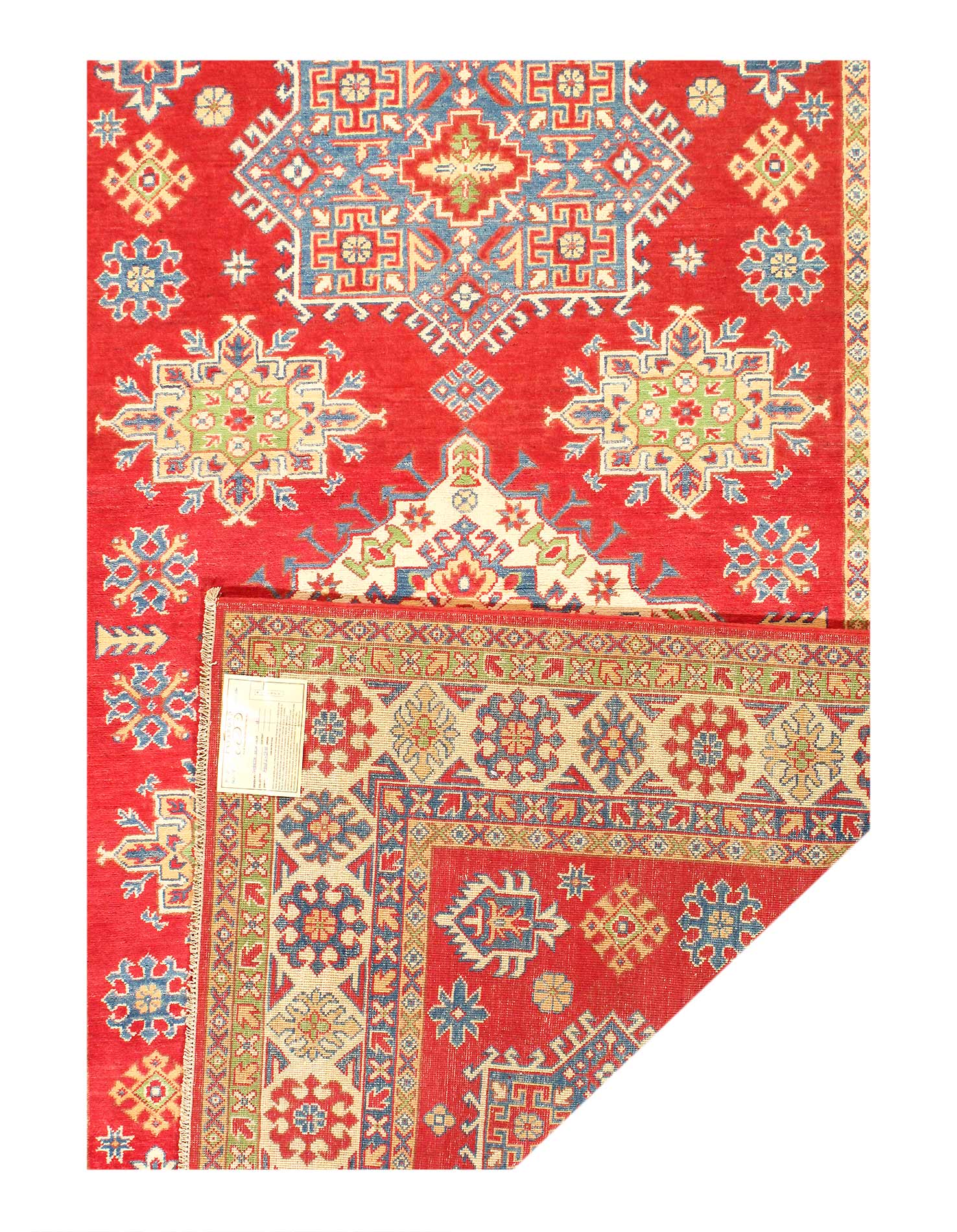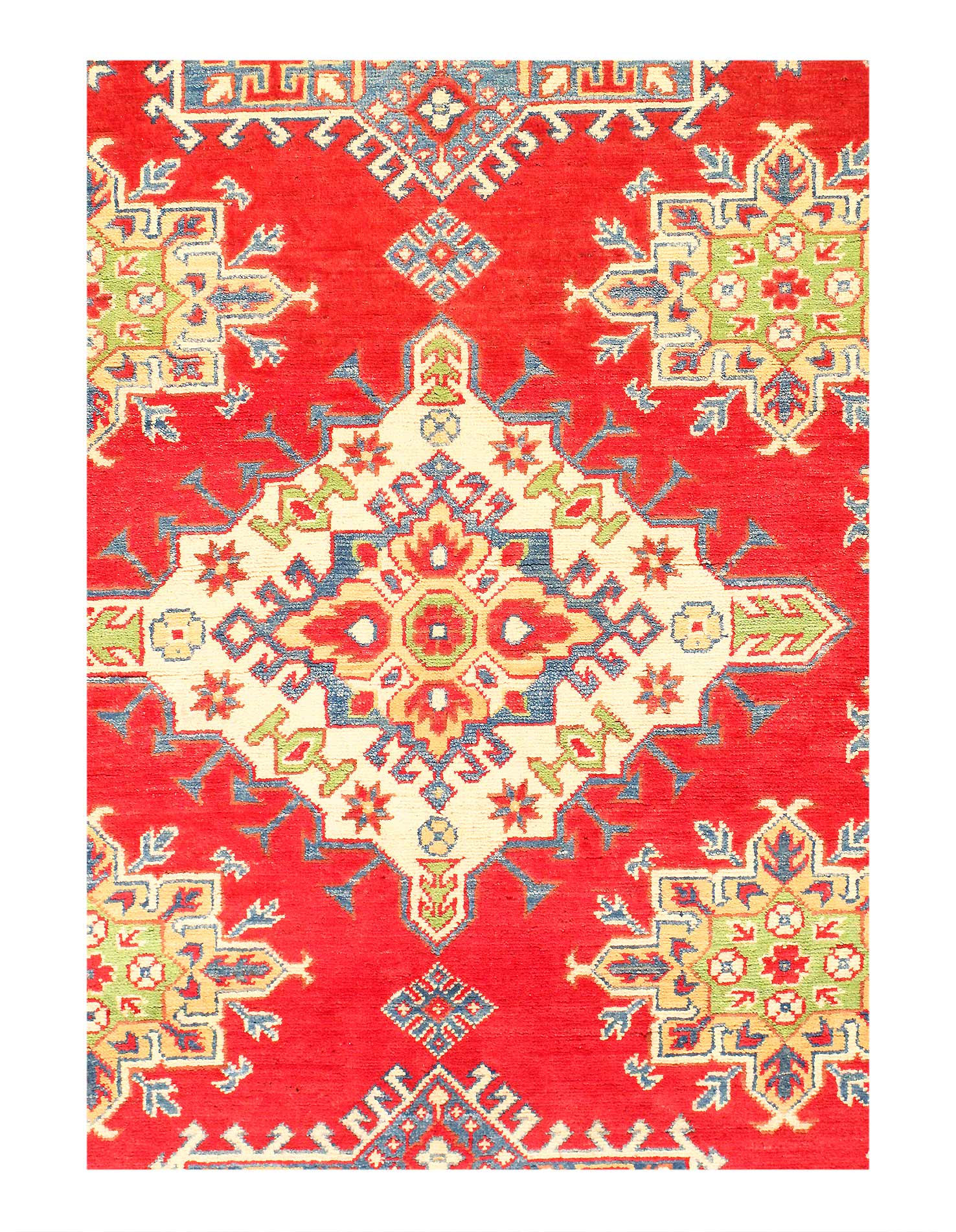 Original Super Kazak Rug. Handmade Hand-knotted,Very Practical for High Traffic,Hand-Spun Lamb's Wool on a Cotton Foundation,Vegetable Dyed,This rug is handmade from 100-percent premium, hand-spun wool, and employ ancient pot-dying techniques to give them their authentic look.Kazak is a modern shape of old Caucasian rugs which strictly adheres to traditional design elements of the Caucasus. It has elements such as the stepped hooked polygons, geometrical medallions and rosettes, presented in more stylized manner and with a new dimension. Natural dyes produce soft luminous shades and abrashes causing a beautiful sheen. Hand spun wool yarn is normally used in the variety of vibrant warm colors. Kazaks rugs in our collection are all fine quality pieces from Pakistan made with Ghazni hand spun wool and natural dyes