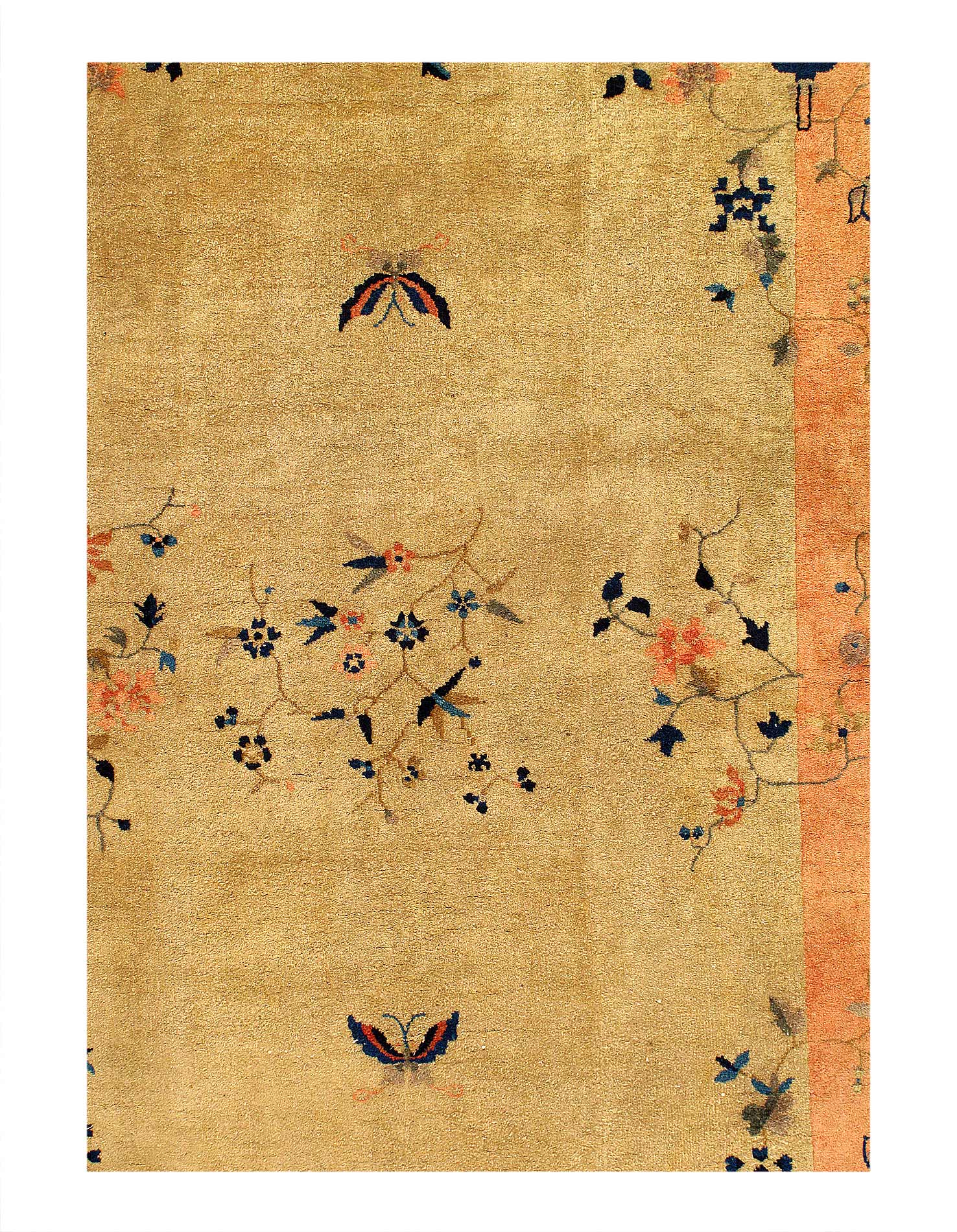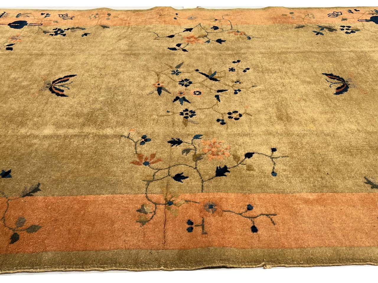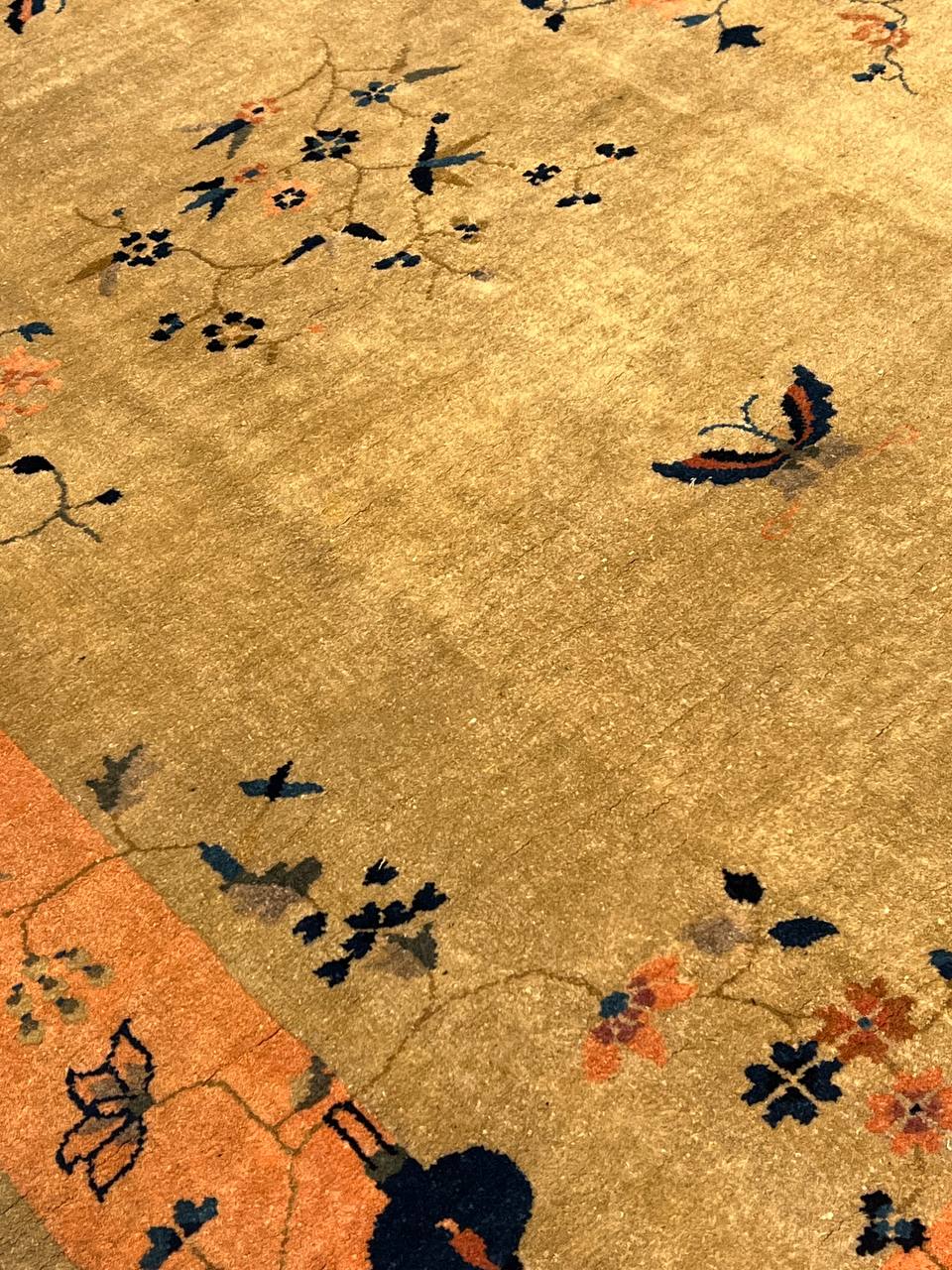 Chinese Deco Rug, Origin: China, Circa: Early 20th Century β Here is an exciting and appealing antique Oriental carpet β an antique Art Deco rug that was designed and woven in China during the early years of the twentieth century. Heavily informed by the aesthetic inclinations of the Art Deco period, this unique carpet is a compelling and thought-provoking example. A scalloped border of Gold encloses a Beige / Blue sand field on this exquisitely subtle and restrained antique Chinese Art Deco. At first the field appears empty or open, but it is actually covered by a tone-on-tone design of scrolls and cloud-bands emanating inward from the outer edges. In their sinuous rhythms they echo the scalloped forms of the border and continue its visual effects across the carpet in a more subdued manner. This carpet testifies to the masterful design sensibilities of Chinese weavers as they made the transition into the modern world. The Art Deco movement had an outside influence on the world of art and design, and some of the most important qualities and characteristics of that movement may be found in this fine rug.