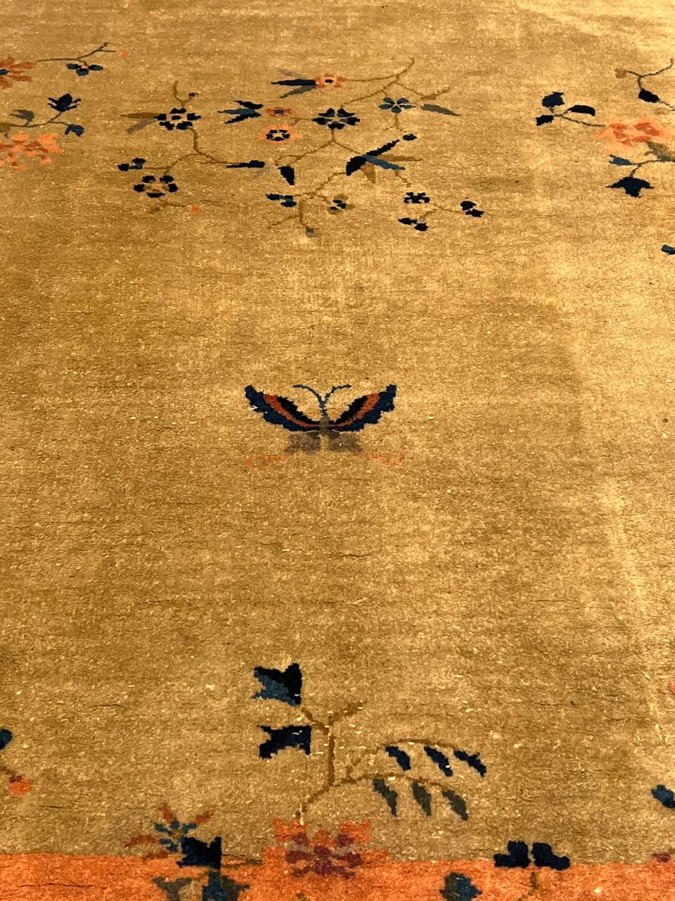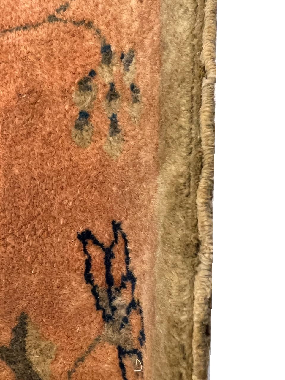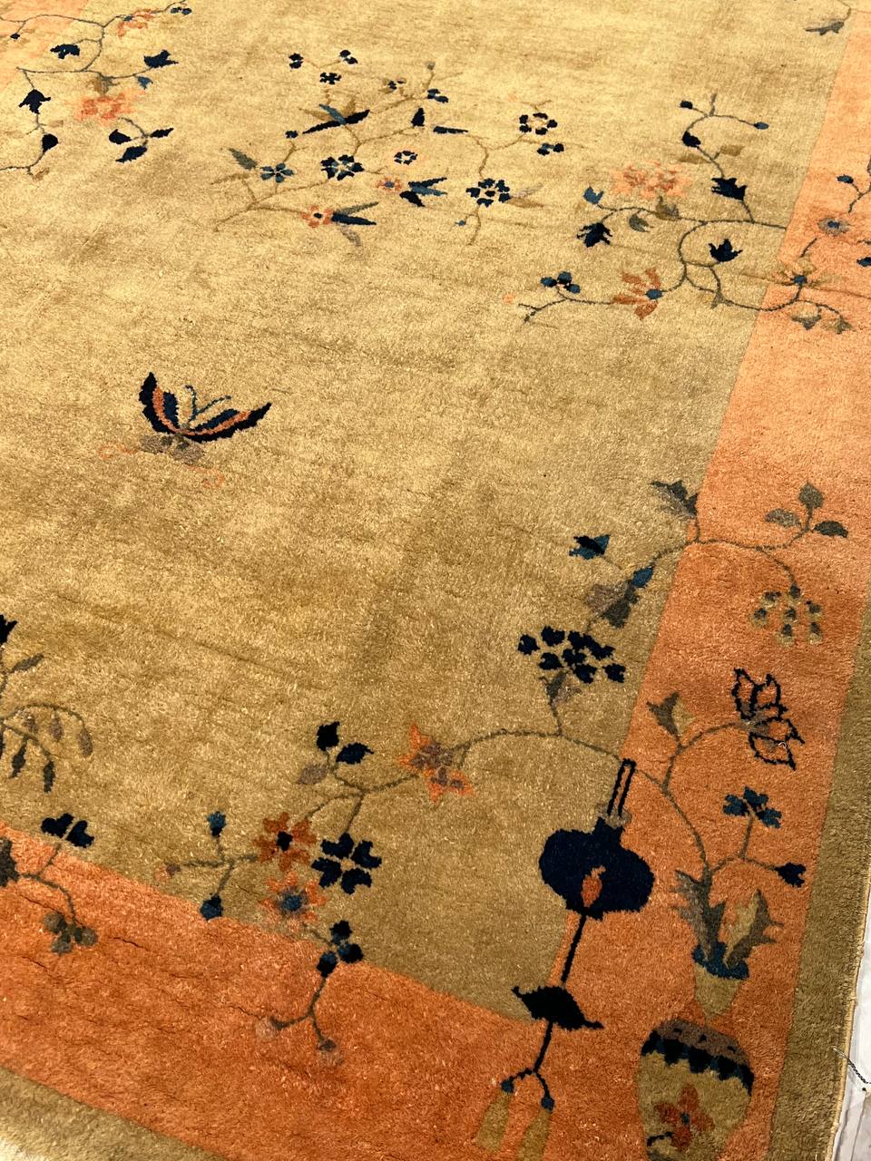 Chinese Deco Rug, Origin: China, Circa: Early 20th Century β Here is an exciting and appealing antique Oriental carpet β an antique Art Deco rug that was designed and woven in China during the early years of the twentieth century. Heavily informed by the aesthetic inclinations of the Art Deco period, this unique carpet is a compelling and thought-provoking example. A scalloped border of Gold encloses a Beige / Blue sand field on this exquisitely subtle and restrained antique Chinese Art Deco. At first the field appears empty or open, but it is actually covered by a tone-on-tone design of scrolls and cloud-bands emanating inward from the outer edges. In their sinuous rhythms they echo the scalloped forms of the border and continue its visual effects across the carpet in a more subdued manner. This carpet testifies to the masterful design sensibilities of Chinese weavers as they made the transition into the modern world. The Art Deco movement had an outside influence on the world of art and design, and some of the most important qualities and characteristics of that movement may be found in this fine rug.