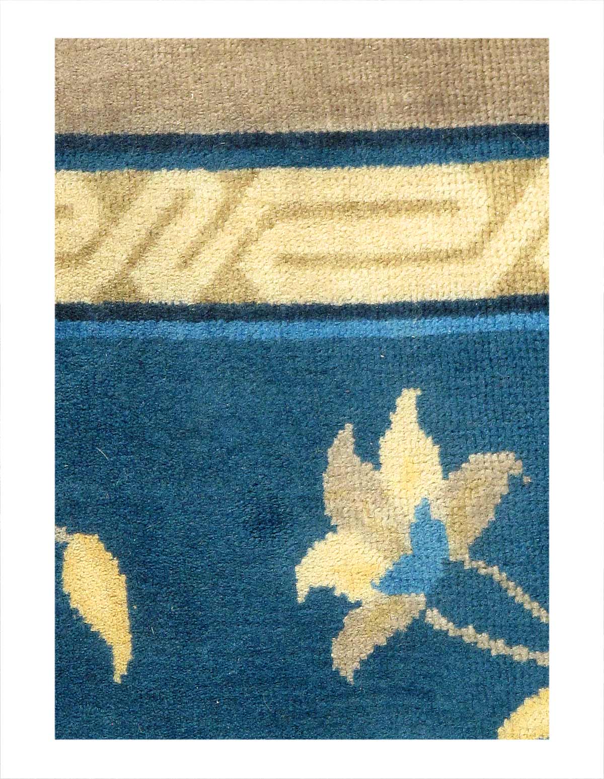 A beautiful antique Art Peking Design Sample Chinese hand-knotted wool rug with a Ivory field. This rug has a blue frame, , red, ivory accents in a gorgeous Chinese floral design. New from India.