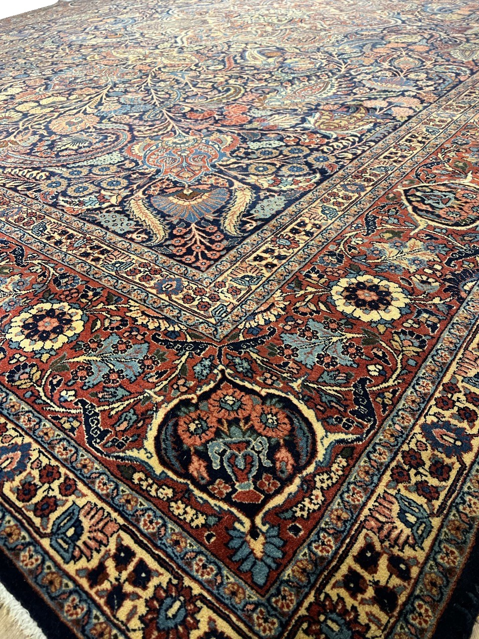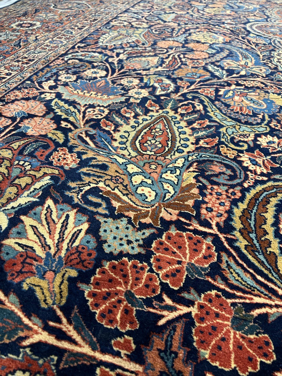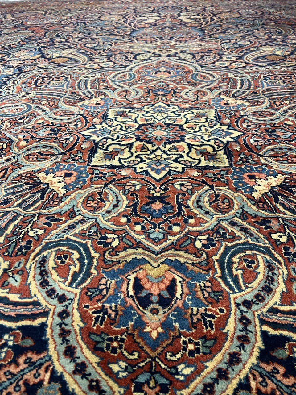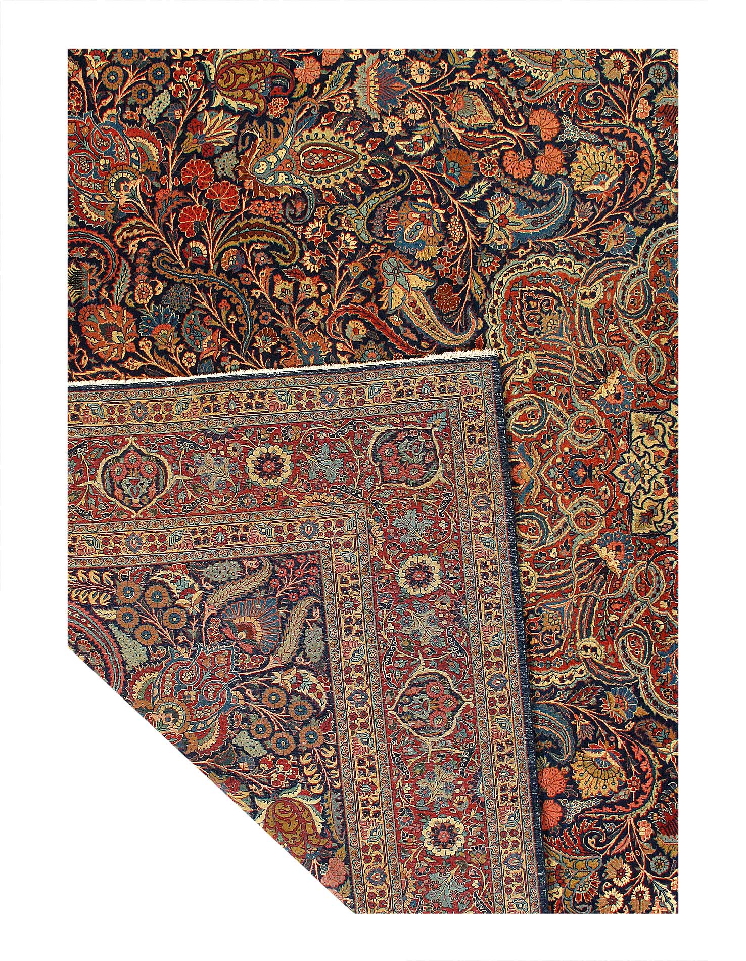 Beautiful and Finely Woven Antique Persian Kashan Rug, Country Of Origin: Persia, Circa Date: Late 19th Century – Attributed to Kashan’s elusive Mohtashem atelier, this inscribed antique Persian carpet features an incomparable medallion-and-pendant cartoon spread over an immense palace-sized field. The distinctive offered composition focuses on a superb ogival medallion embellished with re-curving calyces and undulating ribbons. An expanse of spiraling vine-scrolls adorns the fiery brick-colored ground that encircles the stunning medallion and cuts into the decorative inner borders, which are filled with a lush network of millennium forests that complement the superlative borders. Ogival arches and ornamental niches give the regal composition an architectural formality infused with Persian geometry. The expansive field of this beautiful antique Persian Kashan rug is framed by outstanding flower head borders that are drawn with an extraordinary level of finesse and detail. Subtle color changes, minute outlines and expert compositional details exaggerate the extreme beauty of this antique rug from Kashan.