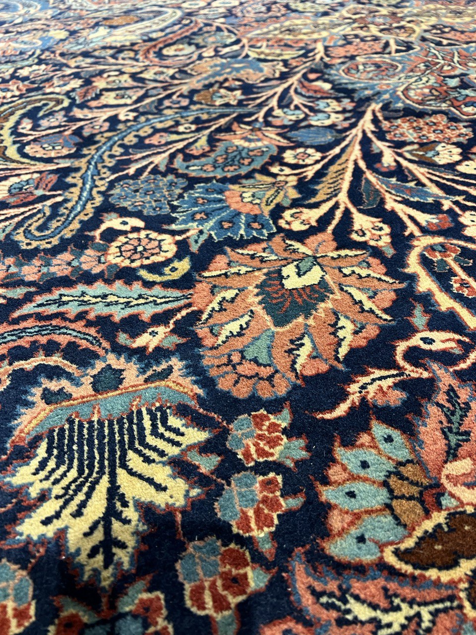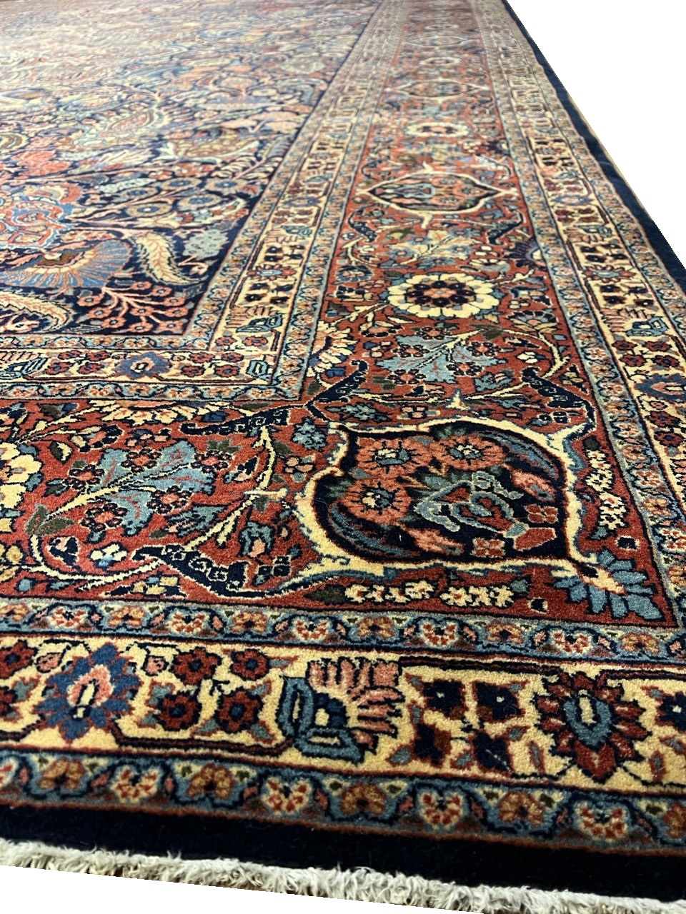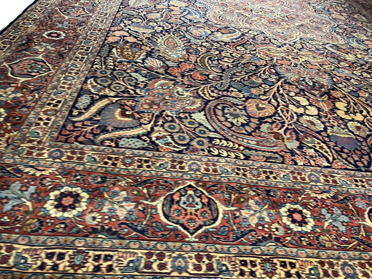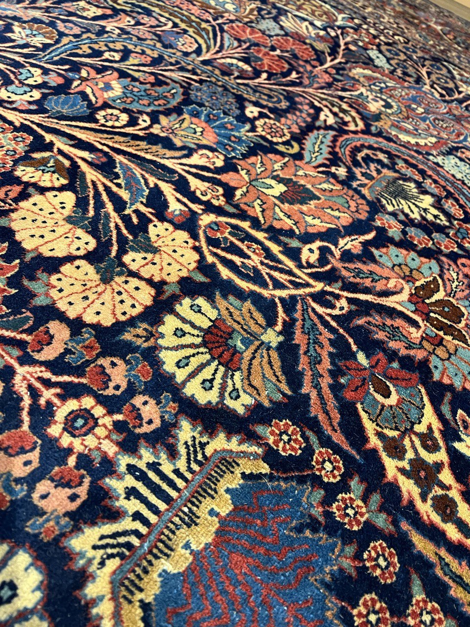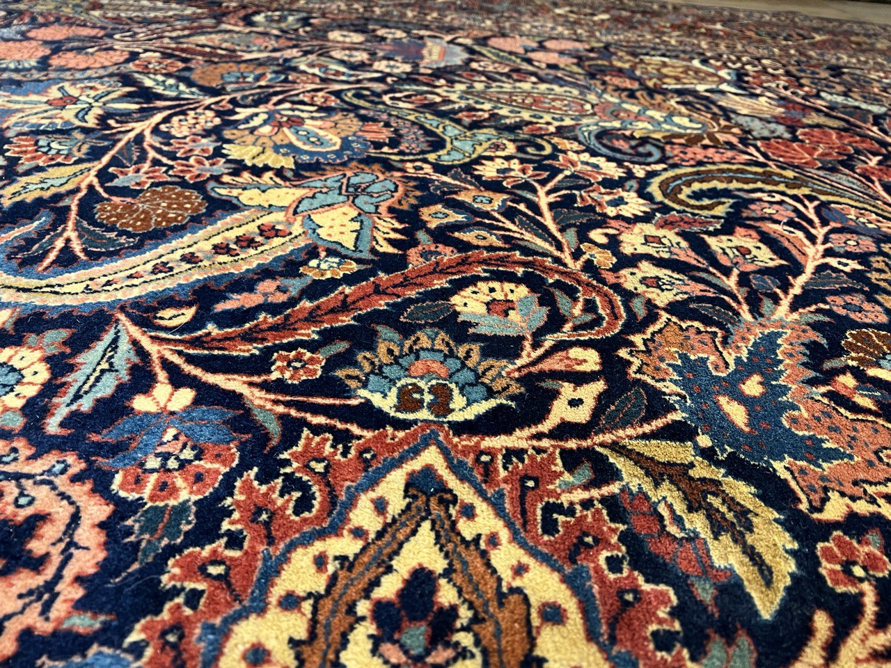 Beautiful and Finely Woven Antique Persian Kashan Rug, Country Of Origin: Persia, Circa Date: Late 19th Century – Attributed to Kashan’s elusive Mohtashem atelier, this inscribed antique Persian carpet features an incomparable medallion-and-pendant cartoon spread over an immense palace-sized field. The distinctive offered composition focuses on a superb ogival medallion embellished with re-curving calyces and undulating ribbons. An expanse of spiraling vine-scrolls adorns the fiery brick-colored ground that encircles the stunning medallion and cuts into the decorative inner borders, which are filled with a lush network of millennium forests that complement the superlative borders. Ogival arches and ornamental niches give the regal composition an architectural formality infused with Persian geometry. The expansive field of this beautiful antique Persian Kashan rug is framed by outstanding flower head borders that are drawn with an extraordinary level of finesse and detail. Subtle color changes, minute outlines and expert compositional details exaggerate the extreme beauty of this antique rug from Kashan.
