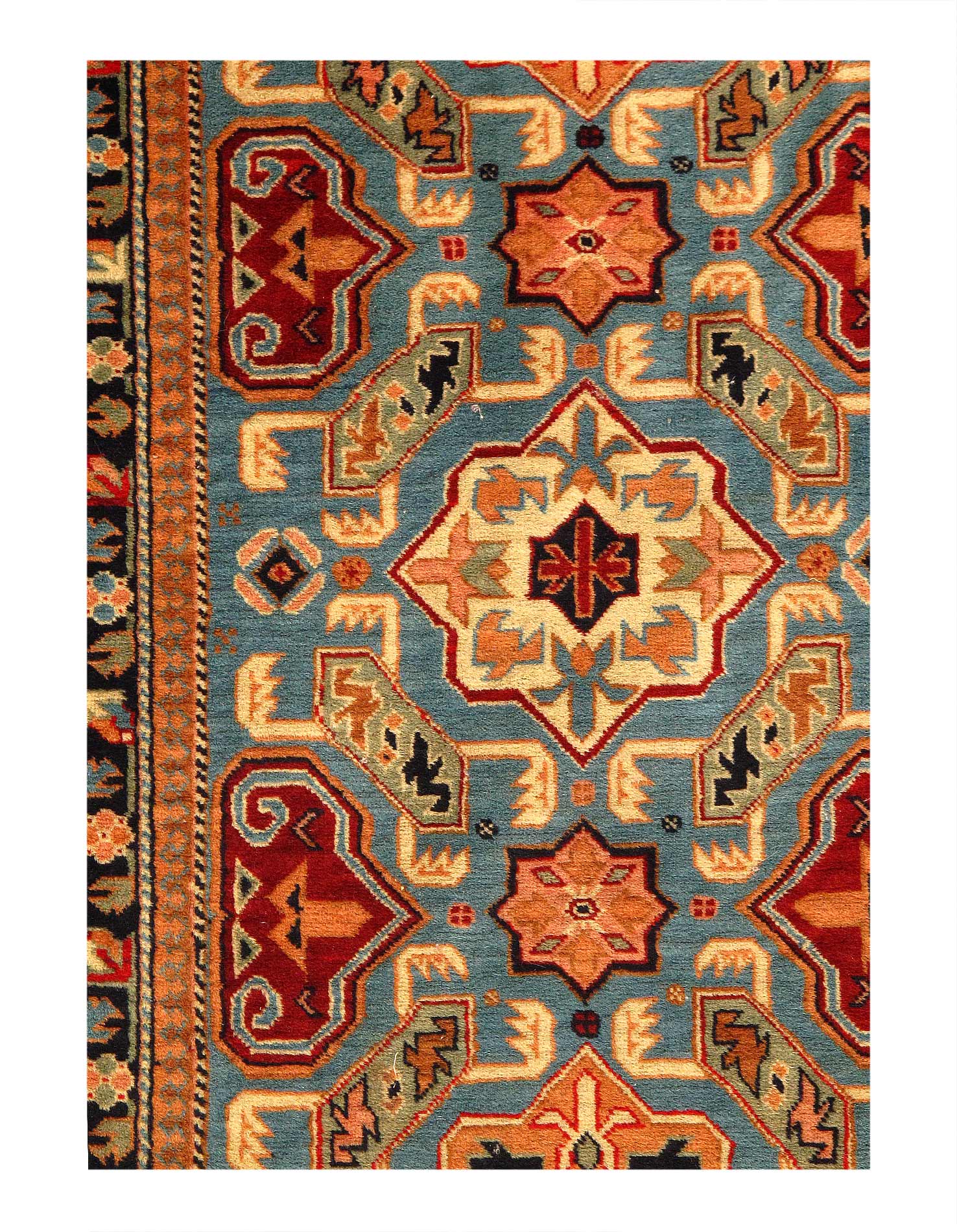 Kazak is a modern shape of old Caucasian rugs which strictly adheres to traditional design elements of the Caucasus. It has elements such as the stepped hooked polygons, geometrical medallions and rosettes, presented in more stylized manner and with a new dimension. Natural dyes produce soft luminous shades and abrashes causing a beautiful sheen. Handspun wool yarn is normally used in the variety of vibrant warm colors.