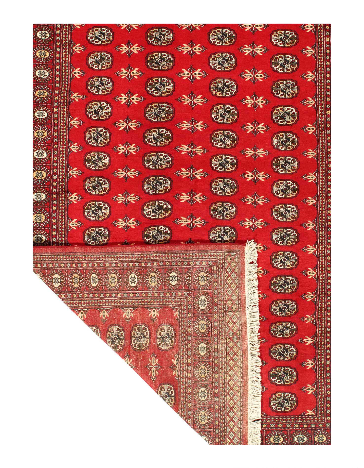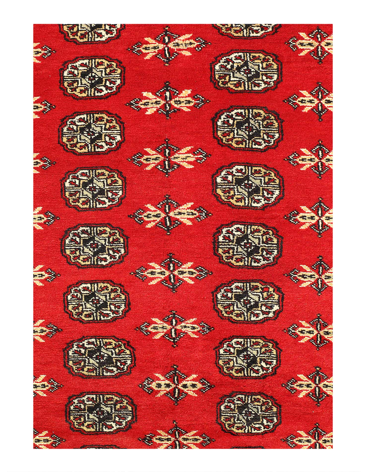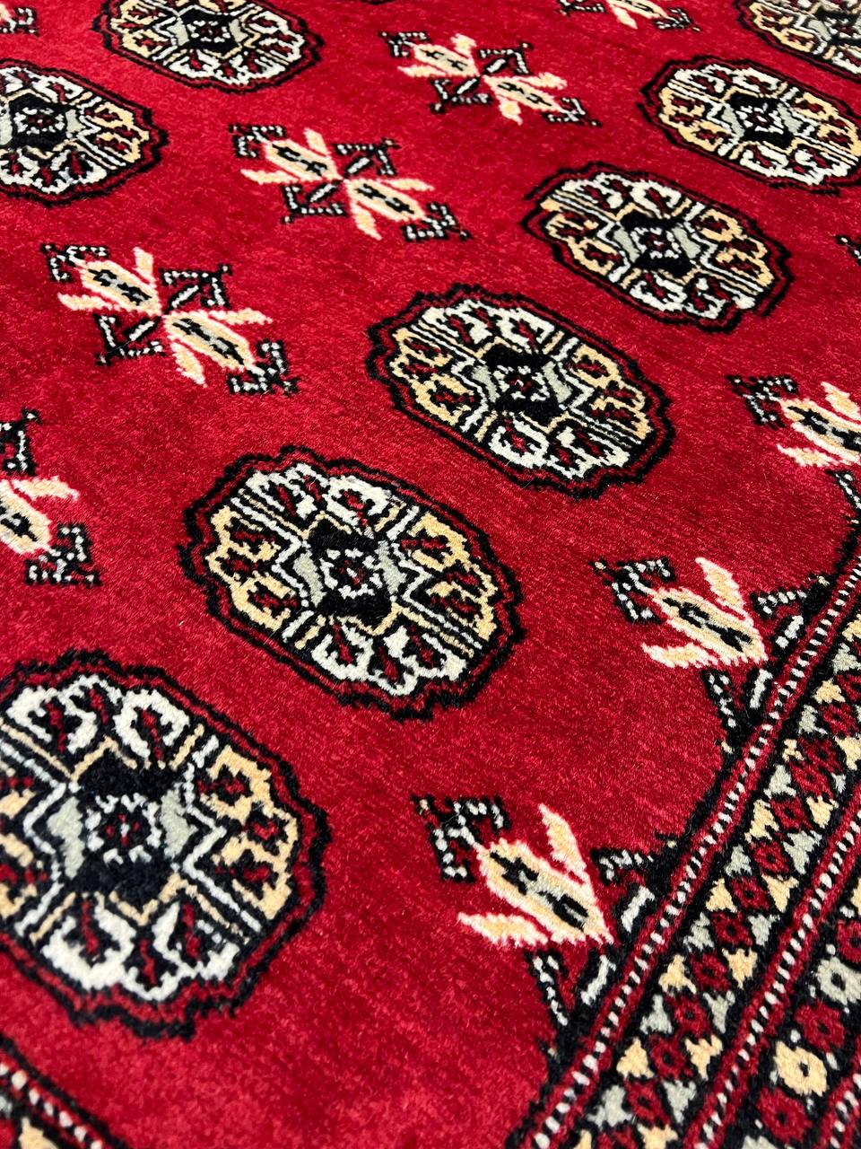 Bokhara Rugs are classic Turkoman designs originally created by nomadic tribes in India. Bokhara Rugs are among the most popular handmade rugs widely produced in Pakistan, India & Afghanistan. There foundation and heavy pile consist of wool, and have a soft luxurious feel. There unique designs consist of repeating geometric designs and vary from one tribe to another. Designs are commonly dark blue/navy, black, brown, or red with ivory accents.