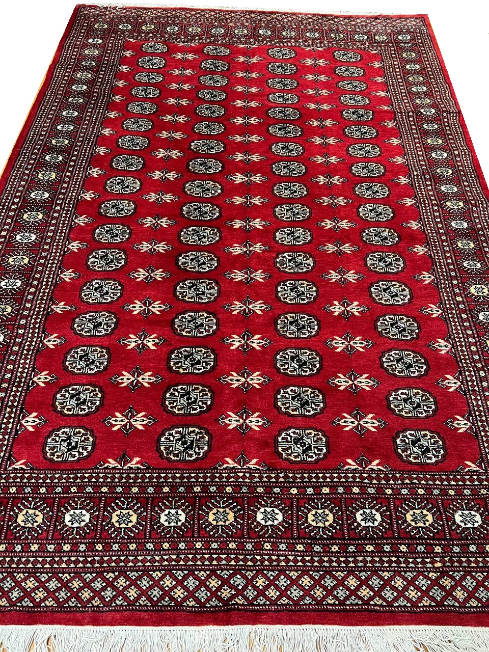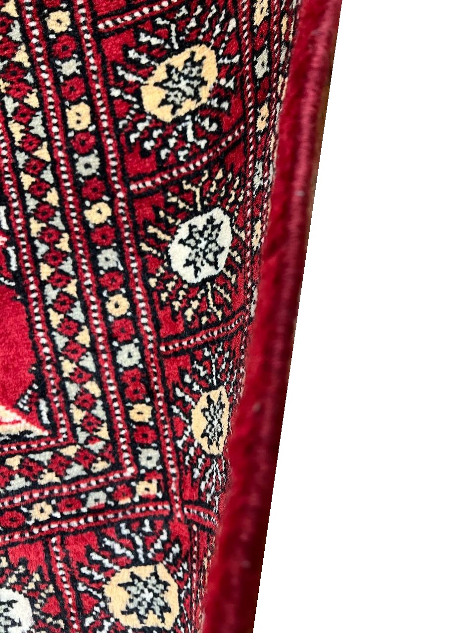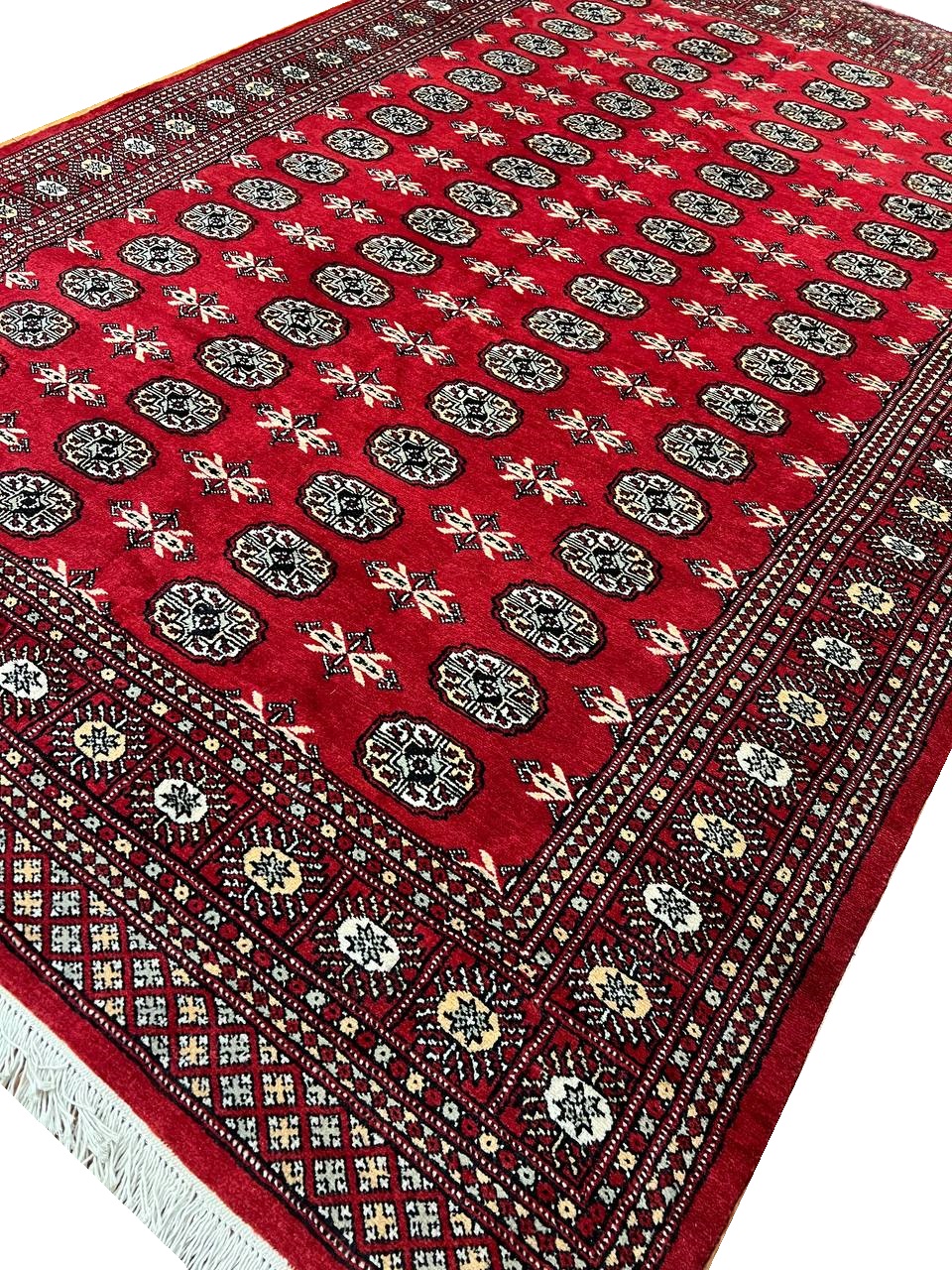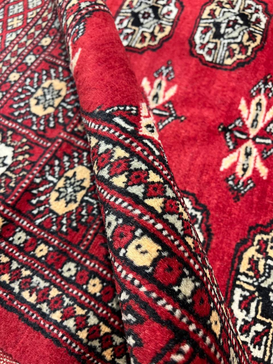 Bokhara Rugs are classic Turkoman designs originally created by nomadic tribes in India. Bokhara Rugs are among the most popular handmade rugs widely produced in Pakistan, India & Afghanistan. There foundation and heavy pile consist of wool, and have a soft luxurious feel. There unique designs consist of repeating geometric designs and vary from one tribe to another. Designs are commonly dark blue/navy, black, brown, or red with ivory accents.