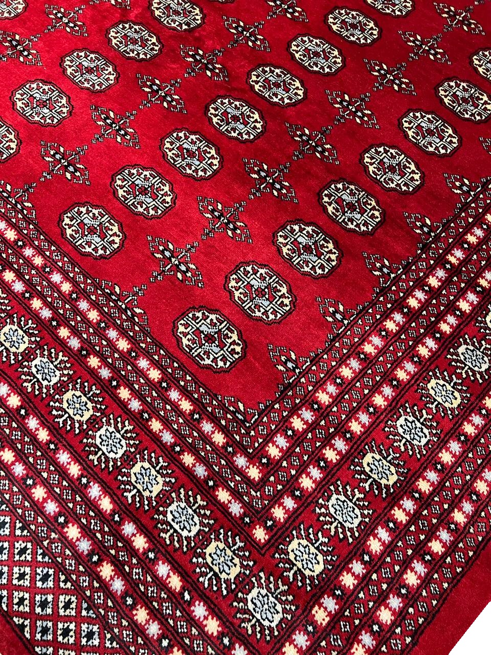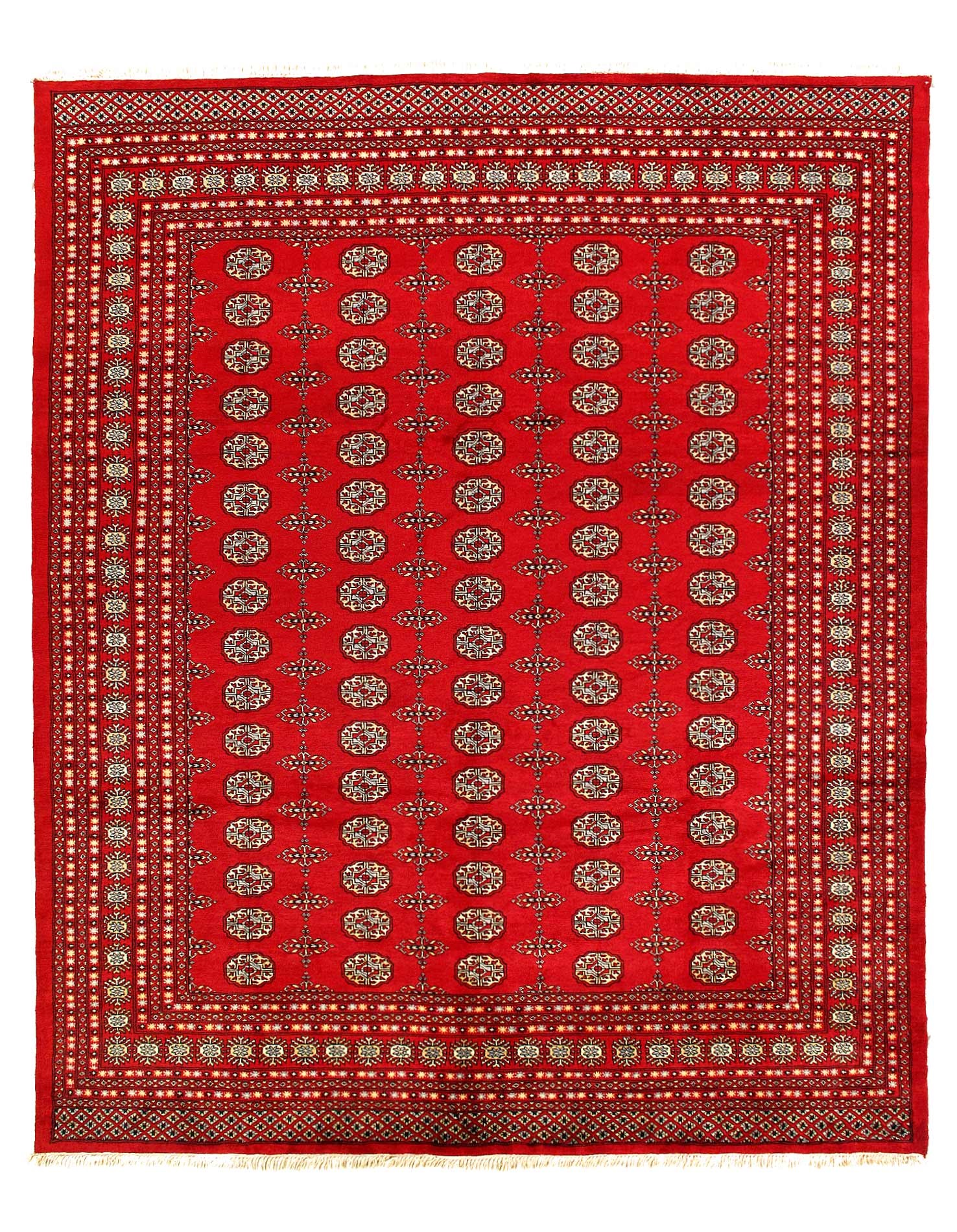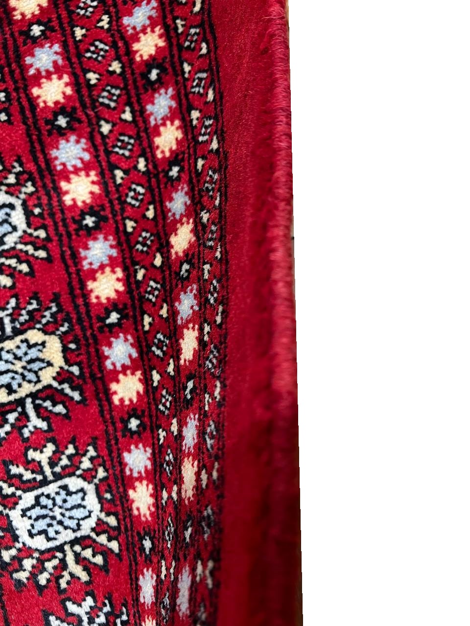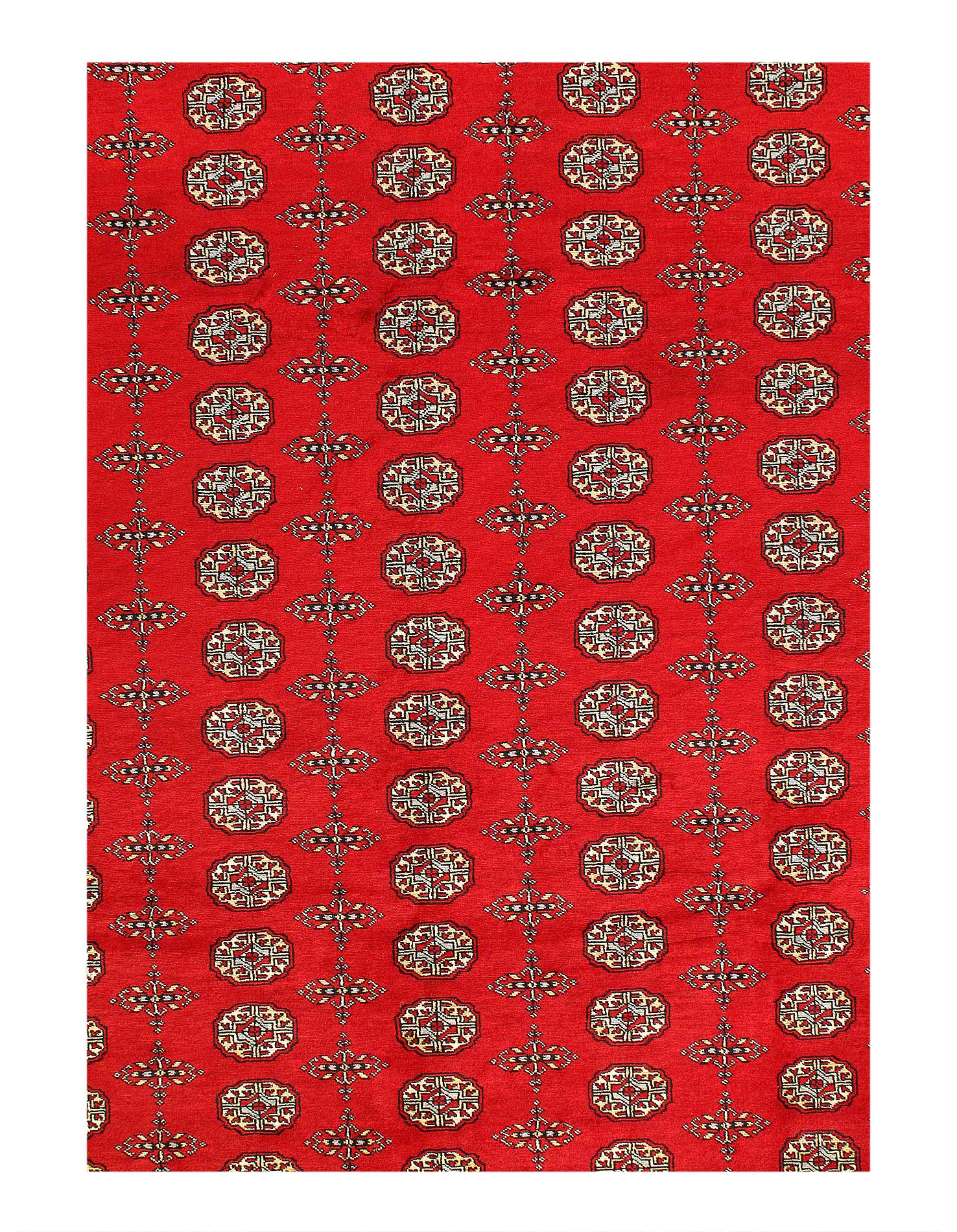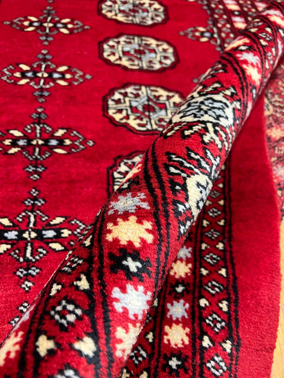 Bokhara Rugs are classic Turkoman designs originally created by nomadic tribes in India. Bokhara Rugs are among the most popular handmade rugs widely produced in Pakistan, India & Afghanistan. There foundation and heavy pile consist of wool, and have a soft luxurious feel. There unique designs consist of repeating geometric designs and vary from one tribe to another. Designs are commonly dark blue/navy, black, brown, or red with ivory accents.