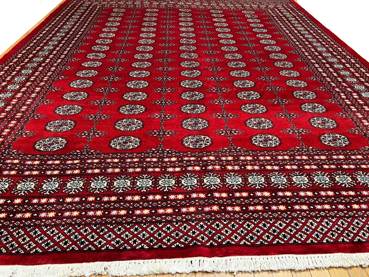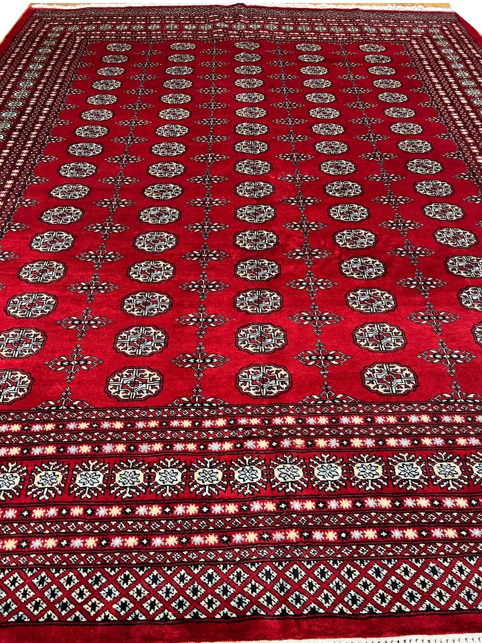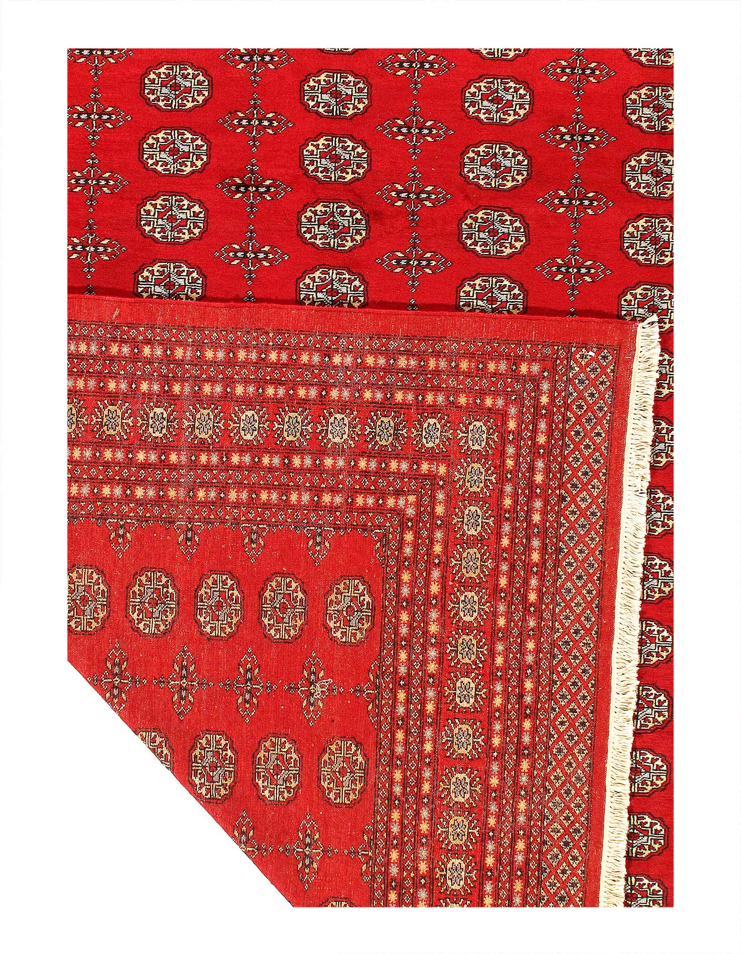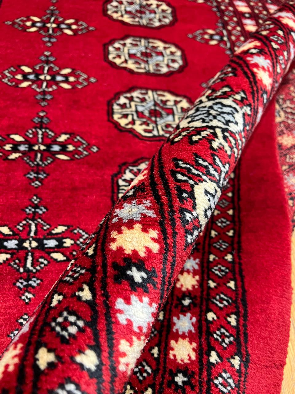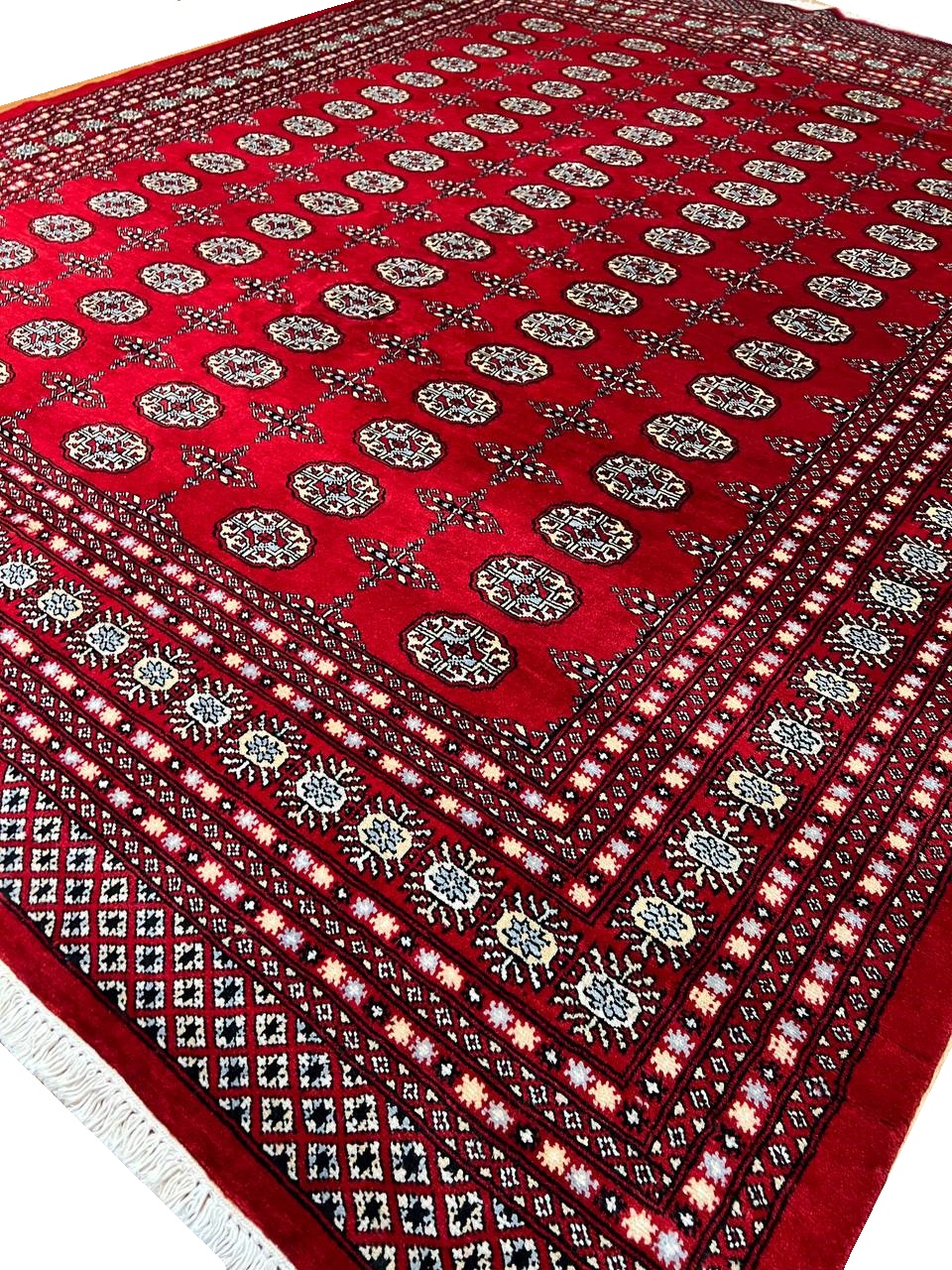 Bokhara Rugs are classic Turkoman designs originally created by nomadic tribes in India. Bokhara Rugs are among the most popular handmade rugs widely produced in Pakistan, India & Afghanistan. There foundation and heavy pile consist of wool, and have a soft luxurious feel. There unique designs consist of repeating geometric designs and vary from one tribe to another. Designs are commonly dark blue/navy, black, brown, or red with ivory accents.