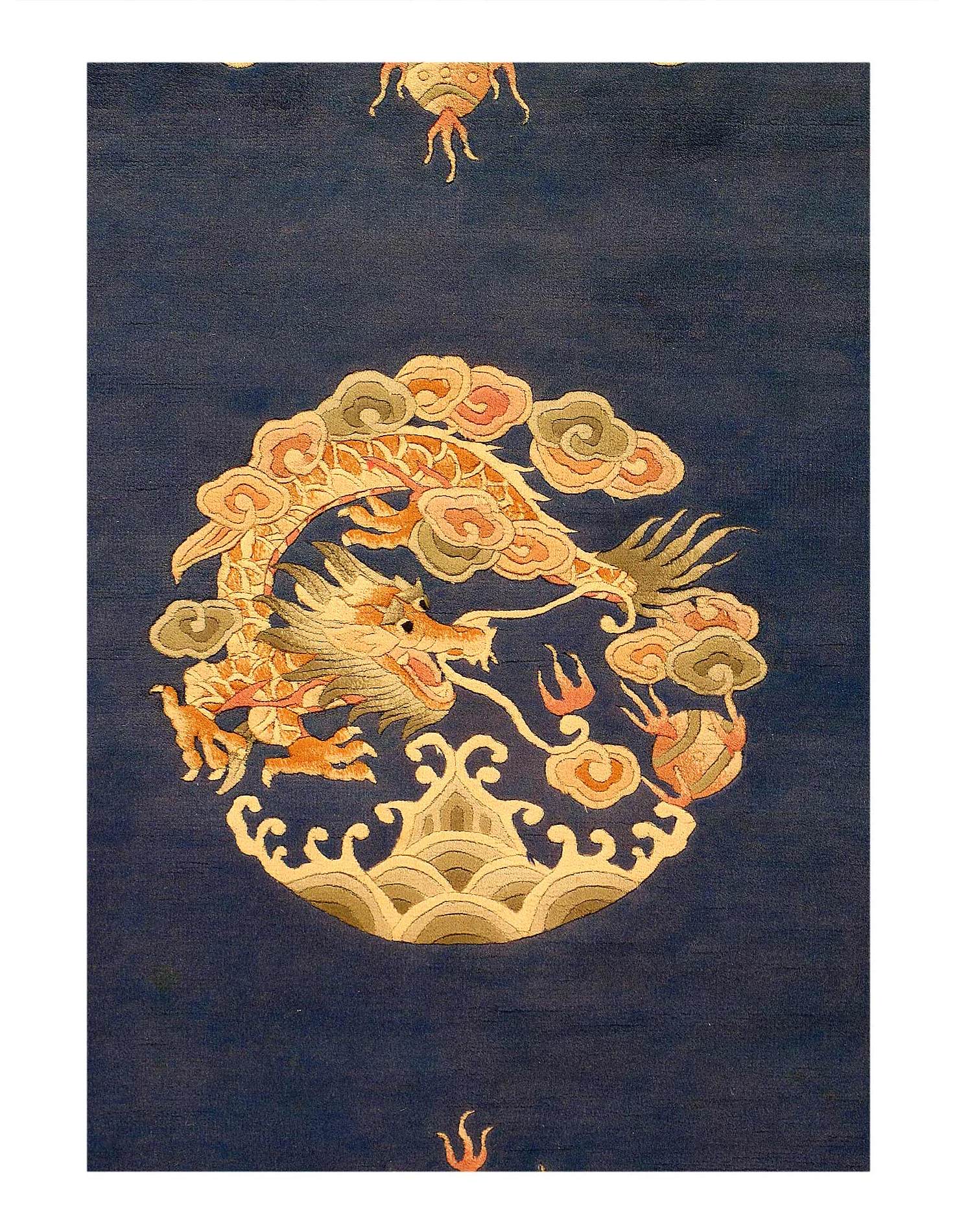 Gorgeous And Extremely Artistic Antique Chinese Two Claw Dragon Design Shabby Elegance Rug, Circa Date: 1960 - A beautiful array of Two clawed Chinese dragons are gracefully flying across the expanse of this breathtaking antique Chinese rug. This is a fascinating and highly artistic antique rug was woven in China around the 1960’s.