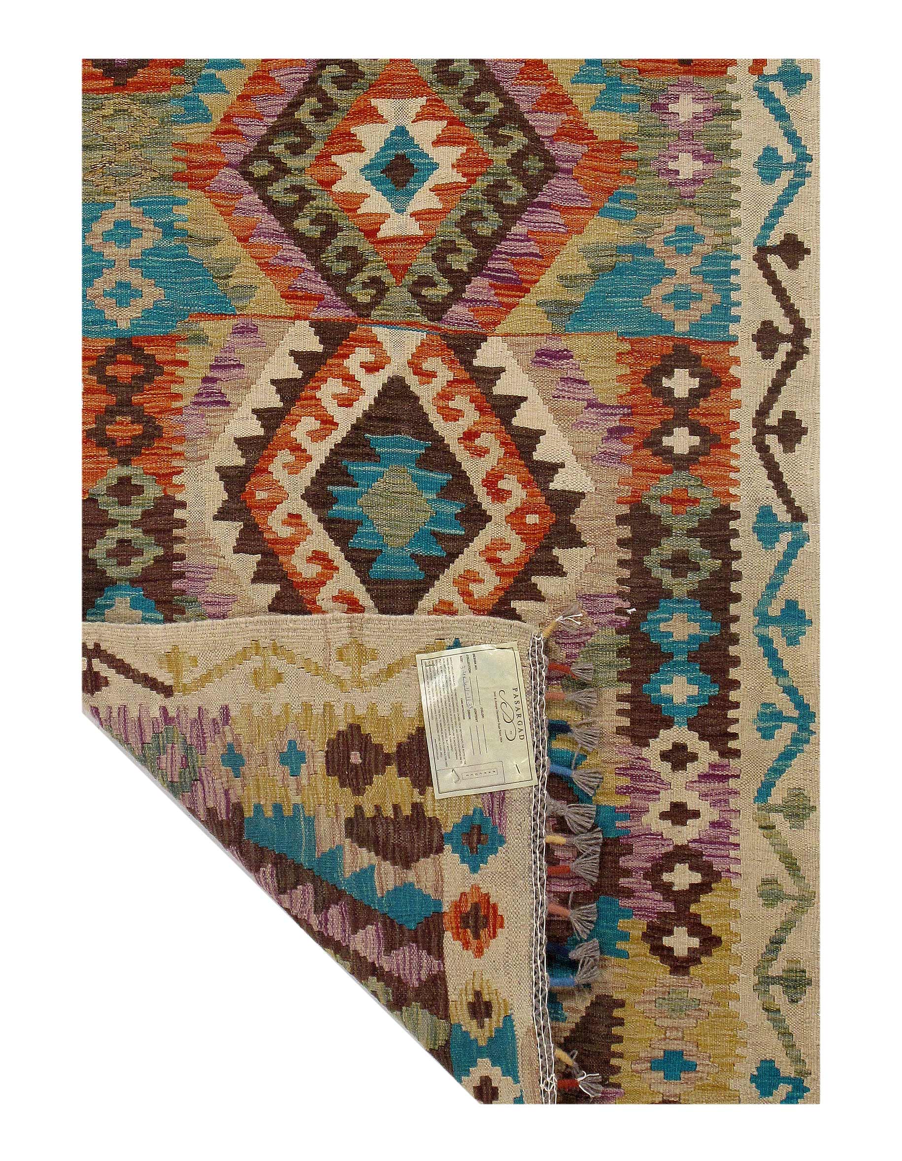 Add a touch of elegance to your home with this casual chic hand woven Kilim wool rug. Constructed on a loom by Nomad turkman people with hand spun wool and 100% natural Vegetable dyes this beautiful rug is known for its beautiful repetitive geometric pattern with naturalistic floral and traditional patterns. The contemporary fashion palette produces bold, sharp patterns that are ingeniously versatile as the pattern is same on the front and back. This double-sided rug is designed to be used both ways being one side has a light shade of color, rather the other side has brighter colors and can be used to preference. This beautiful rug is made by individual short strands of different color being knotted onto the warps and held together by pressing the wefts tightly. The design is made by interweaving the variously colored wefts and warps. Kilims are known to be one of a kind rug due to its durability and versatility.