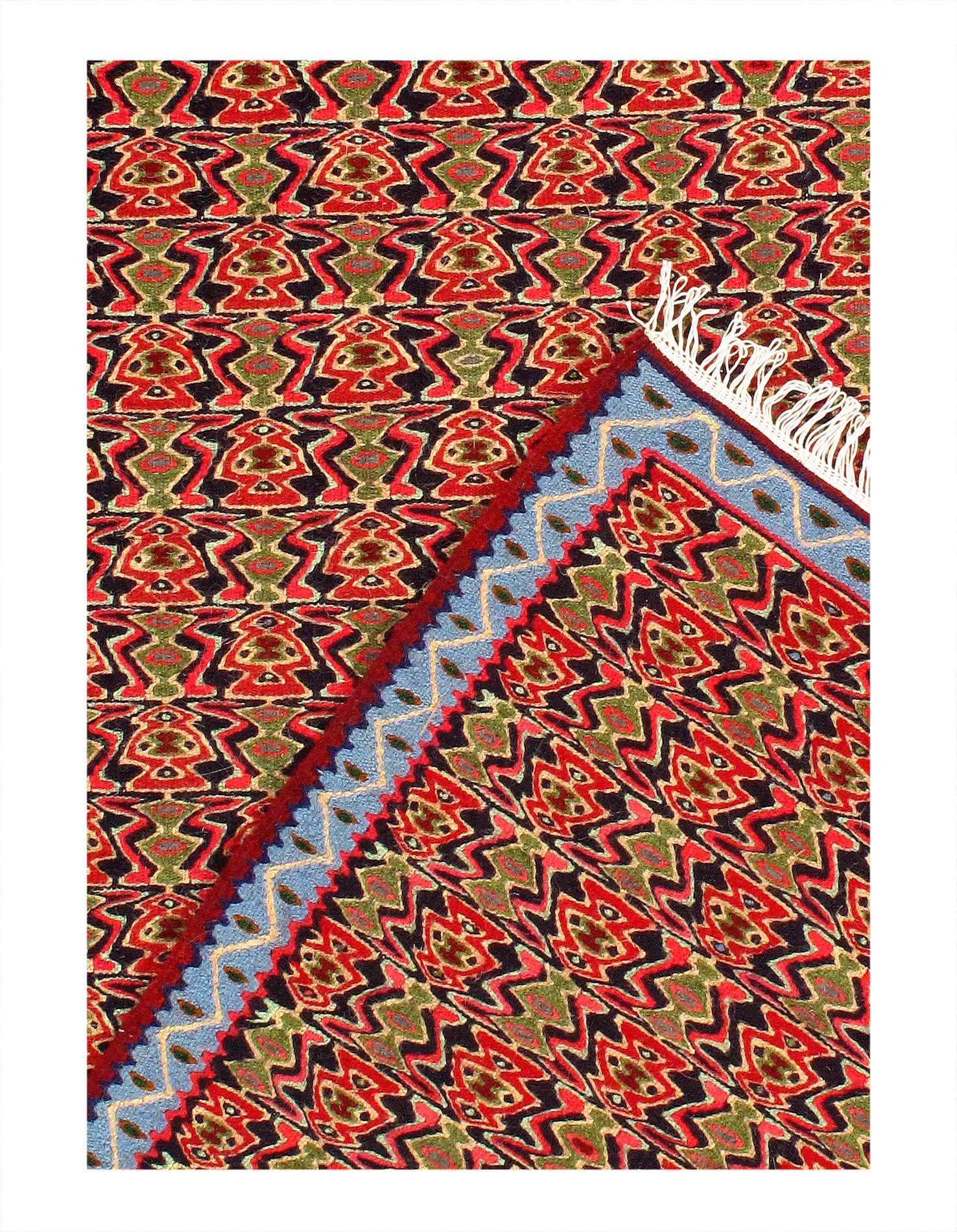 Add a touch of elegance to your home with this casual chic hand woven Kilim wool rug. Constructed on a loom by Nomad turkman people with hand spun wool and 100% natural Vegetable dyes this beautiful rug is known for its beautiful repetitive geometric pattern with naturalistic floral and traditional patterns. The contemporary fashion palette produces bold, sharp patterns that are ingeniously versatile as the pattern is same on the front and back. This double-sided rug is designed to be used both ways being one side has a light shade of color, rather the other side has brighter colors and can be used to preference. This beautiful rug is made by individual short strands of different color being knotted onto the warps and held together by pressing the wefts tightly. The design is made by interweaving the variously colored wefts and warps. Kilims are known to be one of a kind rug due to its durability and versatility.#D14527