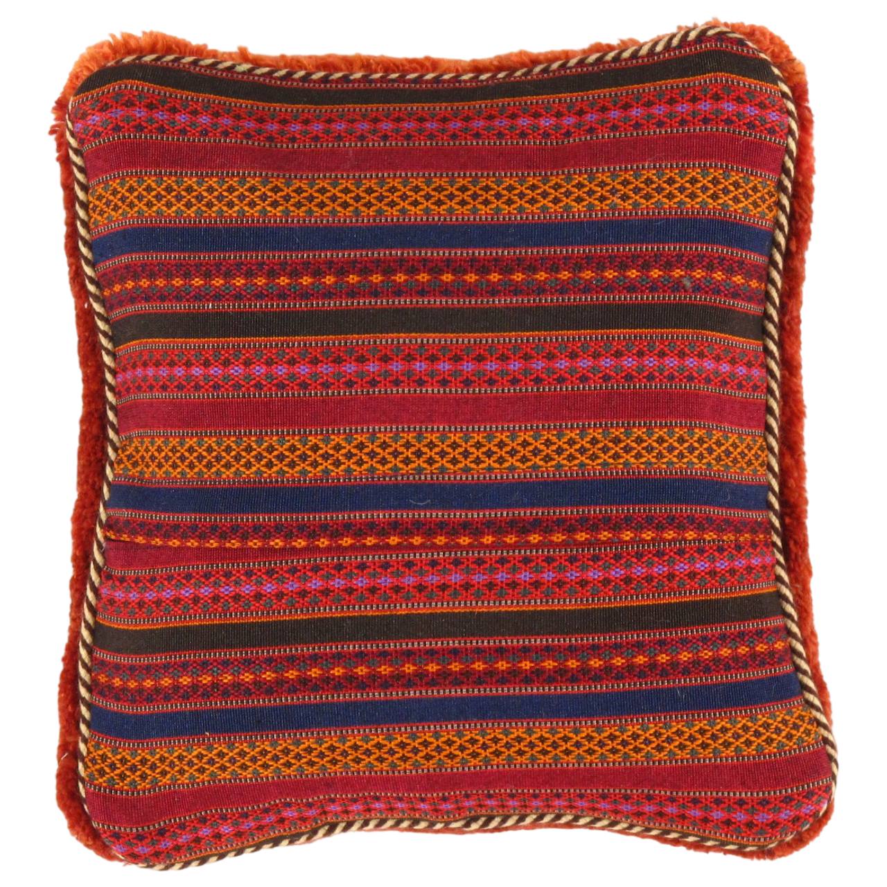 The word “Gabbeh” literally translates to “in the rough,” and it is an accurate description of this style of Persian rug. Gabbeh carpets are woven on makeshift ground looms constructed both of materials that are kept and hauled for long distances by the nomadic tribel, and also of materials that are found at each site where the tribe sets up camp. Due to the fact that part of the loom must be found at each site, a wide variety is introduced. Thus, these rugs are usually somewhat irregular in shape. But, for what they lack in perfectly uniform shape they more than make up for in character, durability and uniqueness.This Gabbeh pillow is made of high-quality LAMBS WOOL The piece was crafted with good workmanship.