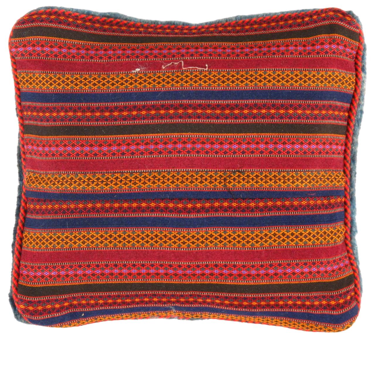 The word “Gabbeh” literally translates to “in the rough,” and it is an accurate description of this style of Persian rug. Gabbeh carpets are woven on makeshift ground looms constructed both of materials that are kept and hauled for long distances by the nomadic tribel, and also of materials that are found at each site where the tribe sets up camp. Due to the fact that part of the loom must be found at each site, a wide variety is introduced. Thus, these rugs are usually somewhat irregular in shape. But, for what they lack in perfectly uniform shape they more than make up for in character, durability and uniqueness.This Gabbeh pillow is made of high-quality LAMBS WOOL The piece was crafted with good workmanship