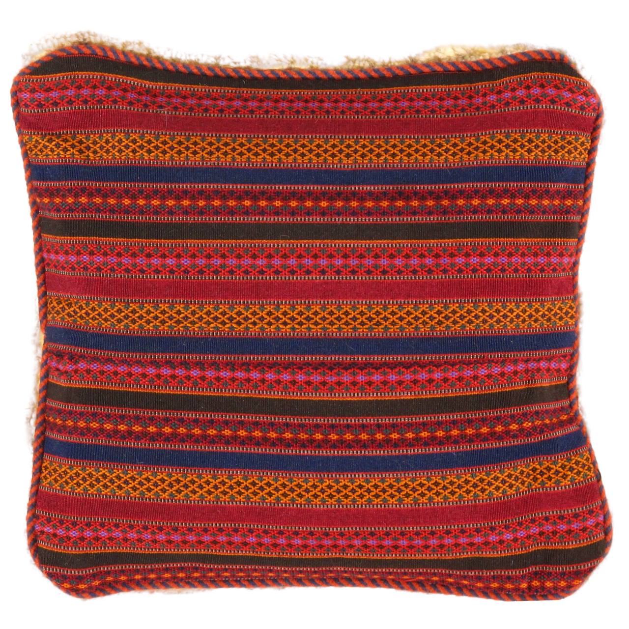 The word “Gabbeh” literally translates to “in the rough,” and it is an accurate description of this style of Persian rug. Gabbeh carpets are woven on makeshift ground looms constructed both of materials that are kept and hauled for long distances by the nomadic tribel, and also of materials that are found at each site where the tribe sets up camp. Due to the fact that part of the loom must be found at each site, a wide variety is introduced. Thus, these rugs are usually somewhat irregular in shape. But, for what they lack in perfectly uniform shape they more than make up for in character, durability and uniqueness.This Gabbeh pillow is made of high-quality LAMBS WOOL The piece was crafted with good workmanship.