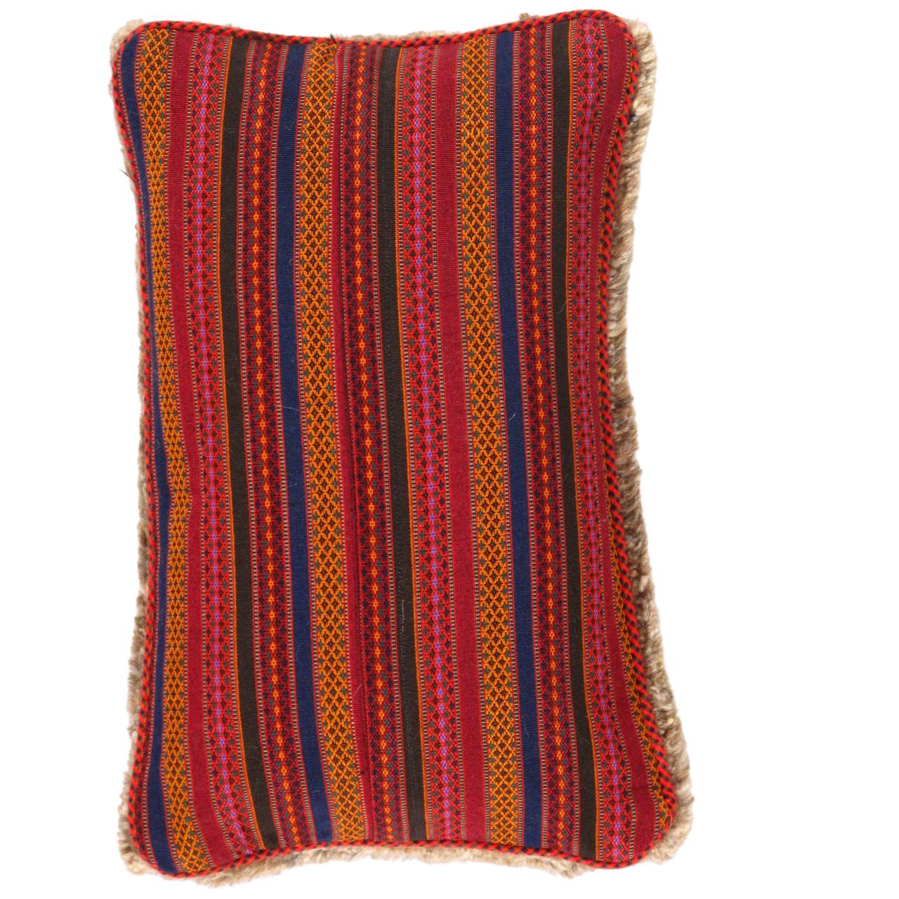 The word “Gabbeh” literally translates to “in the rough,” and it is an accurate description of this style of Persian rug. Gabbeh carpets are woven on makeshift ground looms constructed both of materials that are kept and hauled for long distances by the nomadic tribel, and also of materials that are found at each site where the tribe sets up camp. Due to the fact that part of the loom must be found at each site, a wide variety is introduced. Thus, these rugs are usually somewhat irregular in shape. But, for what they lack in perfectly uniform shape they more than make up for in character, durability and uniqueness.This Gabbeh pillow is made of high-quality LAMBS WOOL The piece was crafted with good workmanship.