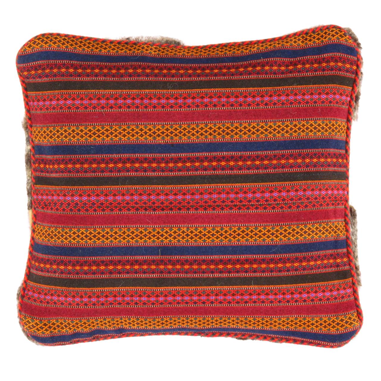 The word “Gabbeh” literally translates to “in the rough,” and it is an accurate description of this style of Persian rug. Gabbeh carpets are woven on makeshift ground looms constructed both of materials that are kept and hauled for long distances by the nomadic tribel, and also of materials that are found at each site where the tribe sets up camp. Due to the fact that part of the loom must be found at each site, a wide variety is introduced. Thus, these rugs are usually somewhat irregular in shape. But, for what they lack in perfectly uniform shape they more than make up for in character, durability and uniqueness.This Gabbeh pillow is made of high-quality LAMBS WOOL The piece was crafted with good workmanship.