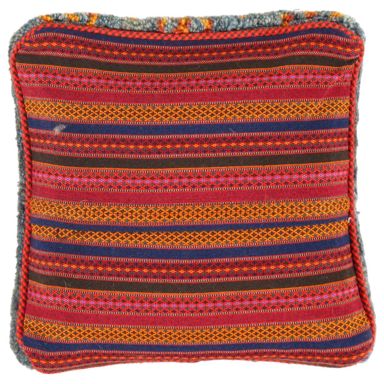 The word “Gabbeh” literally translates to “in the rough,” and it is an accurate description of this style of Persian rug. Gabbeh carpets are woven on makeshift ground looms constructed both of materials that are kept and hauled for long distances by the nomadic tribel, and also of materials that are found at each site where the tribe sets up camp. Due to the fact that part of the loom must be found at each site, a wide variety is introduced. Thus, these rugs are usually somewhat irregular in shape. But, for what they lack in perfectly uniform shape they more than make up for in character, durability and uniqueness.This Gabbeh pillow is made of high-quality LAMBS WOOL The piece was crafted with good workmanship