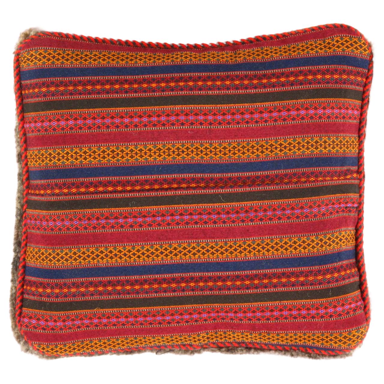 The word “Gabbeh” literally translates to “in the rough,” and it is an accurate description of this style of Persian rug. Gabbeh carpets are woven on makeshift ground looms constructed both of materials that are kept and hauled for long distances by the nomadic tribel, and also of materials that are found at each site where the tribe sets up camp. Due to the fact that part of the loom must be found at each site, a wide variety is introduced. Thus, these rugs are usually somewhat irregular in shape. But, for what they lack in perfectly uniform shape they more than make up for in character, durability and uniqueness.This Gabbeh pillow is made of high-quality LAMBS WOOL The piece was crafted with good workmanship