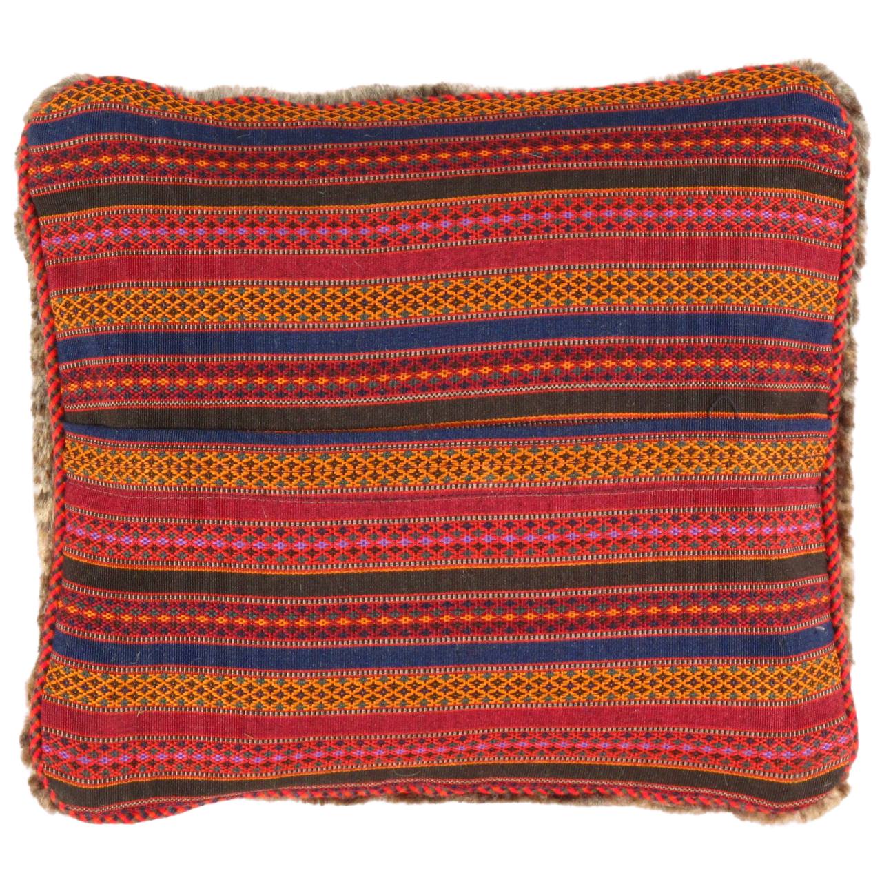The word “Gabbeh” literally translates to “in the rough,” and it is an accurate description of this style of Persian rug. Gabbeh carpets are woven on makeshift ground looms constructed both of materials that are kept and hauled for long distances by the nomadic tribel, and also of materials that are found at each site where the tribe sets up camp. Due to the fact that part of the loom must be found at each site, a wide variety is introduced. Thus, these rugs are usually somewhat irregular in shape. But, for what they lack in perfectly uniform shape they more than make up for in character, durability and uniqueness.This Gabbeh pillow is made of high-quality LAMBS WOOL The piece was crafted with good workmanship.