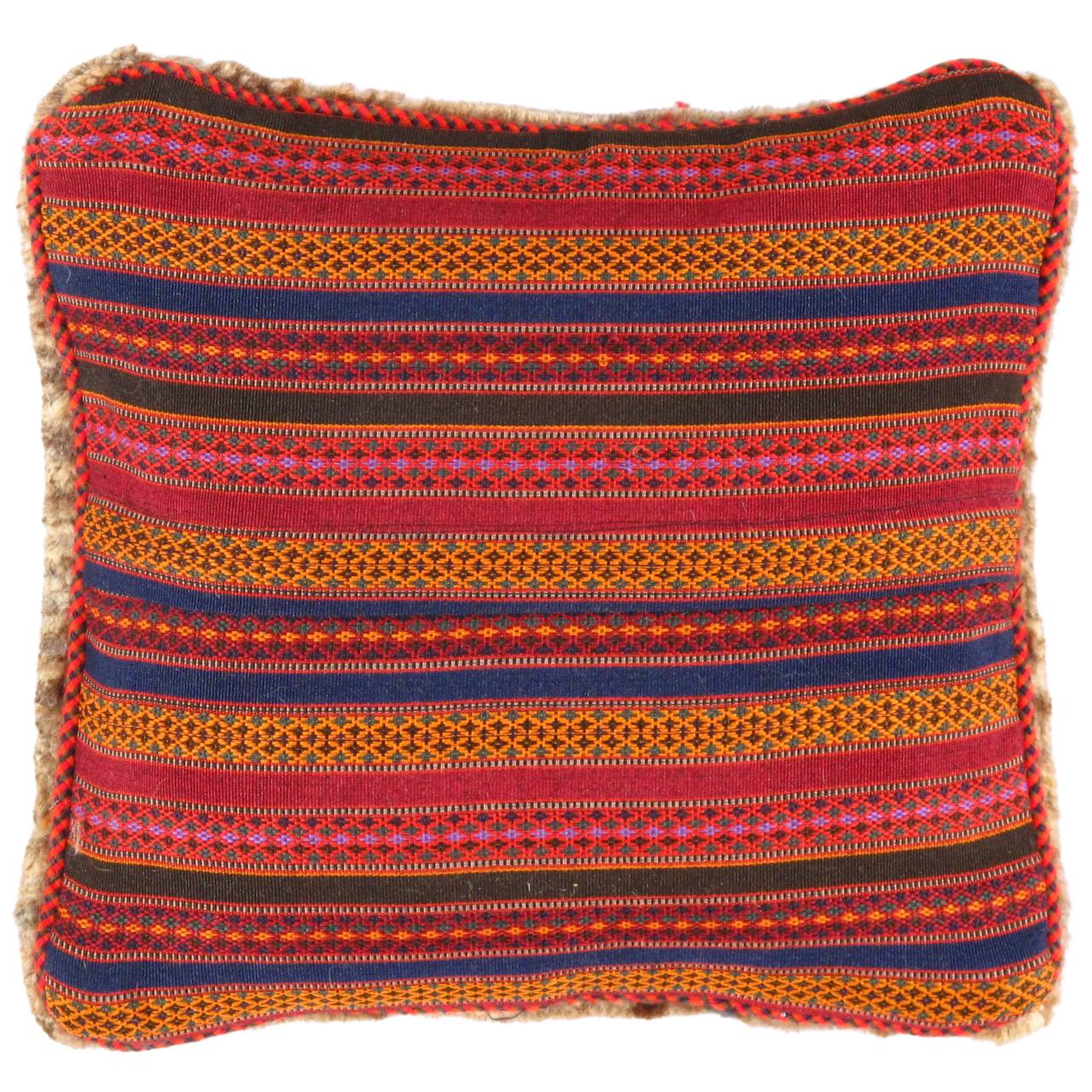 The word “Gabbeh” literally translates to “in the rough,” and it is an accurate description of this style of Persian rug. Gabbeh carpets are woven on makeshift ground looms constructed both of materials that are kept and hauled for long distances by the nomadic tribel, and also of materials that are found at each site where the tribe sets up camp. Due to the fact that part of the loom must be found at each site, a wide variety is introduced. Thus, these rugs are usually somewhat irregular in shape. But, for what they lack in perfectly uniform shape they more than make up for in character, durability and uniqueness.This Gabbeh pillow is made of high-quality LAMBS WOOL The piece was crafted with good workmanship.