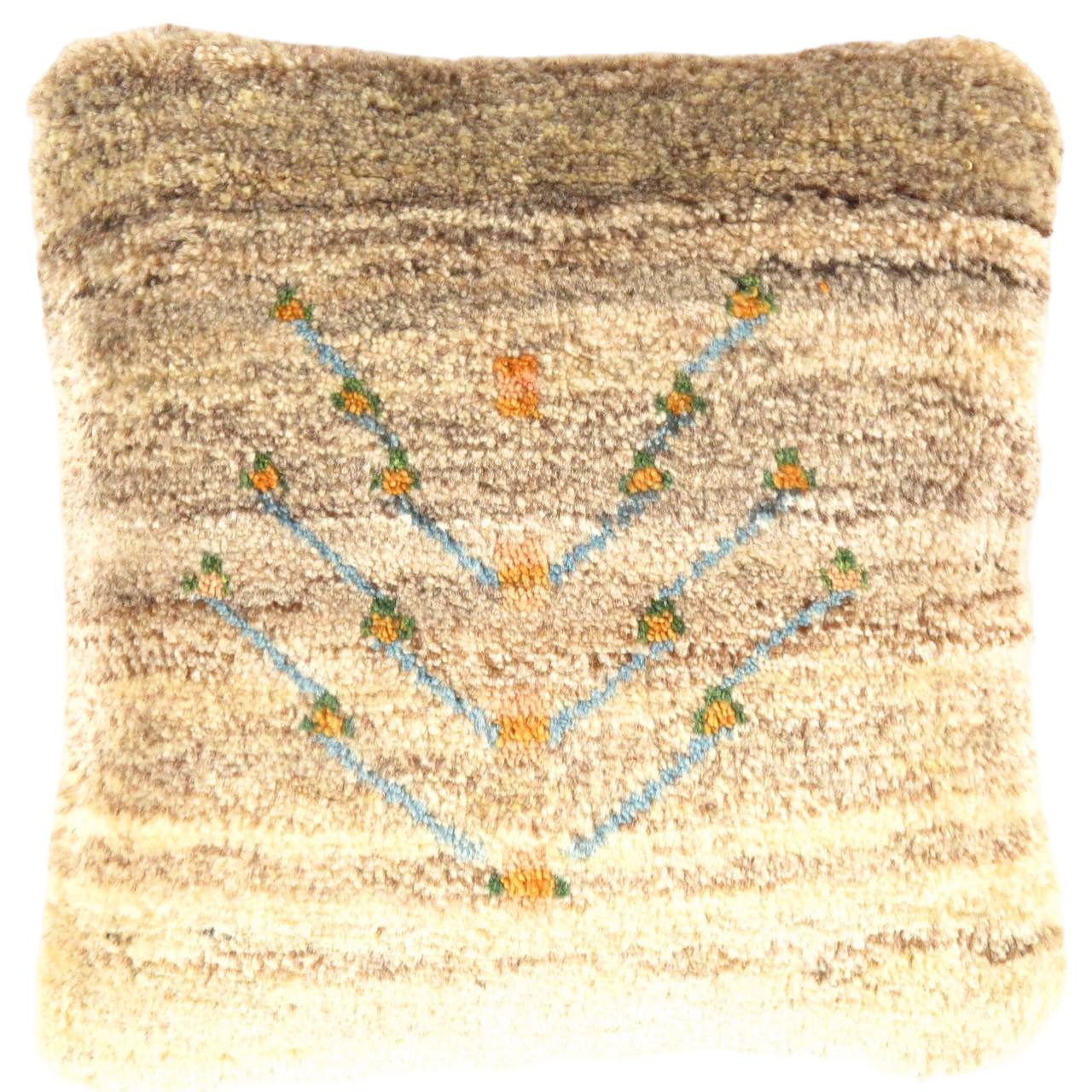 The word “Gabbeh” literally translates to “in the rough,” and it is an accurate description of this style of Persian rug. Gabbeh carpets are woven on makeshift ground looms constructed both of materials that are kept and hauled for long distances by the nomadic tribel, and also of materials that are found at each site where the tribe sets up camp. Due to the fact that part of the loom must be found at each site, a wide variety is introduced. Thus, these rugs are usually somewhat irregular in shape. But, for what they lack in perfectly uniform shape they more than make up for in character, durability and uniqueness.This Gabbeh pillow is made of high-quality LAMBS WOOL The piece was crafted with good workmanship.