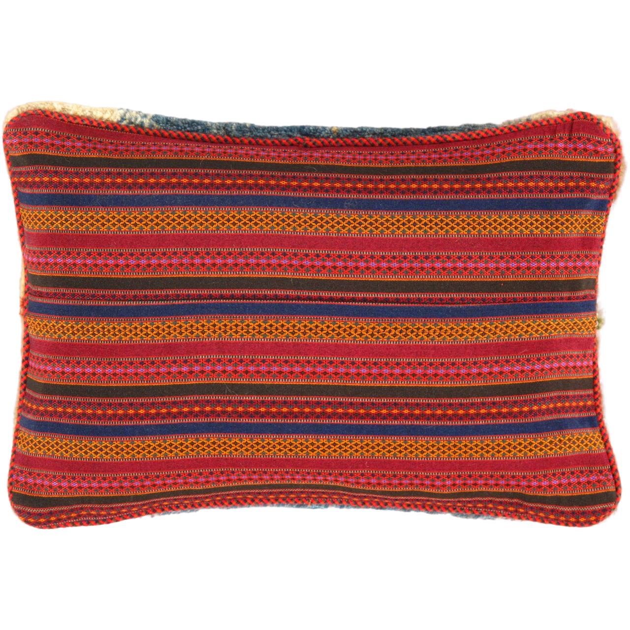 The word “Gabbeh” literally translates to “in the rough,” and it is an accurate description of this style of Persian rug. Gabbeh carpets are woven on makeshift ground looms constructed both of materials that are kept and hauled for long distances by the nomadic tribel, and also of materials that are found at each site where the tribe sets up camp. Due to the fact that part of the loom must be found at each site, a wide variety is introduced. Thus, these rugs are usually somewhat irregular in shape. But, for what they lack in perfectly uniform shape they more than make up for in character, durability and uniqueness.This Gabbeh pillow is made of high-quality LAMBS WOOL The piece was crafted with good workmanship.