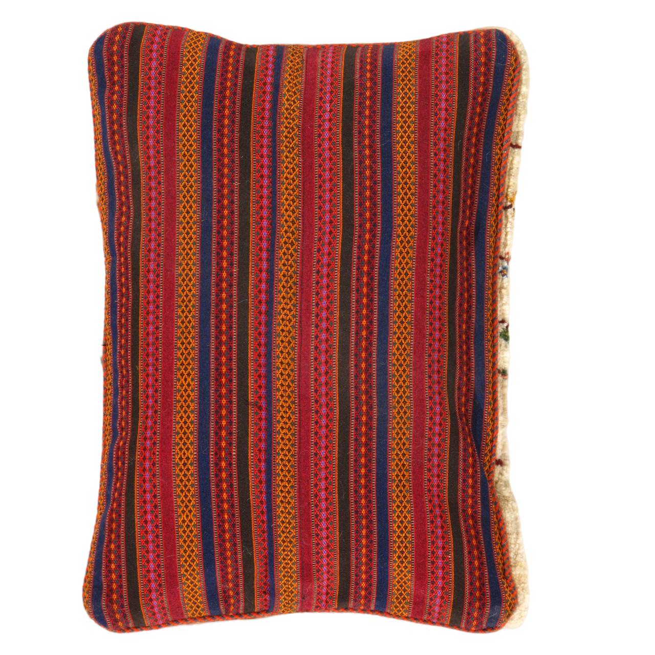 The word “Gabbeh” literally translates to “in the rough,” and it is an accurate description of this style of Persian rug. Gabbeh carpets are woven on makeshift ground looms constructed both of materials that are kept and hauled for long distances by the nomadic tribel, and also of materials that are found at each site where the tribe sets up camp. Due to the fact that part of the loom must be found at each site, a wide variety is introduced. Thus, these rugs are usually somewhat irregular in shape. But, for what they lack in perfectly uniform shape they more than make up for in character, durability and uniqueness.This Gabbeh pillow is made of high-quality LAMBS WOOL The piece was crafted with good workmanship.