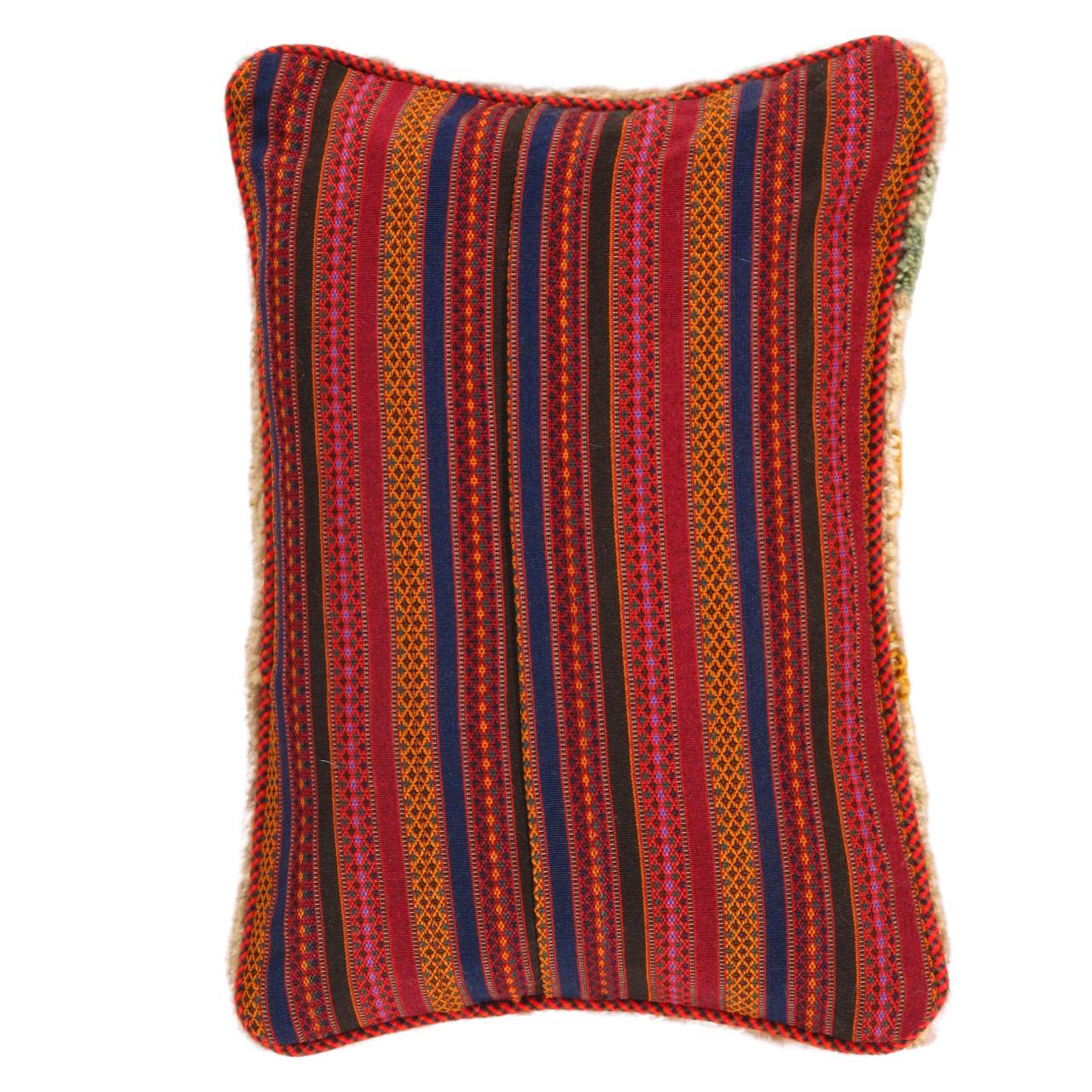 The word “Gabbeh” literally translates to “in the rough,” and it is an accurate description of this style of Persian rug. Gabbeh carpets are woven on makeshift ground looms constructed both of materials that are kept and hauled for long distances by the nomadic tribel, and also of materials that are found at each site where the tribe sets up camp. Due to the fact that part of the loom must be found at each site, a wide variety is introduced. Thus, these rugs are usually somewhat irregular in shape. But, for what they lack in perfectly uniform shape they more than make up for in character, durability and uniqueness.This Gabbeh pillow is made of high-quality LAMBS WOOL The piece was crafted with good workmanship.