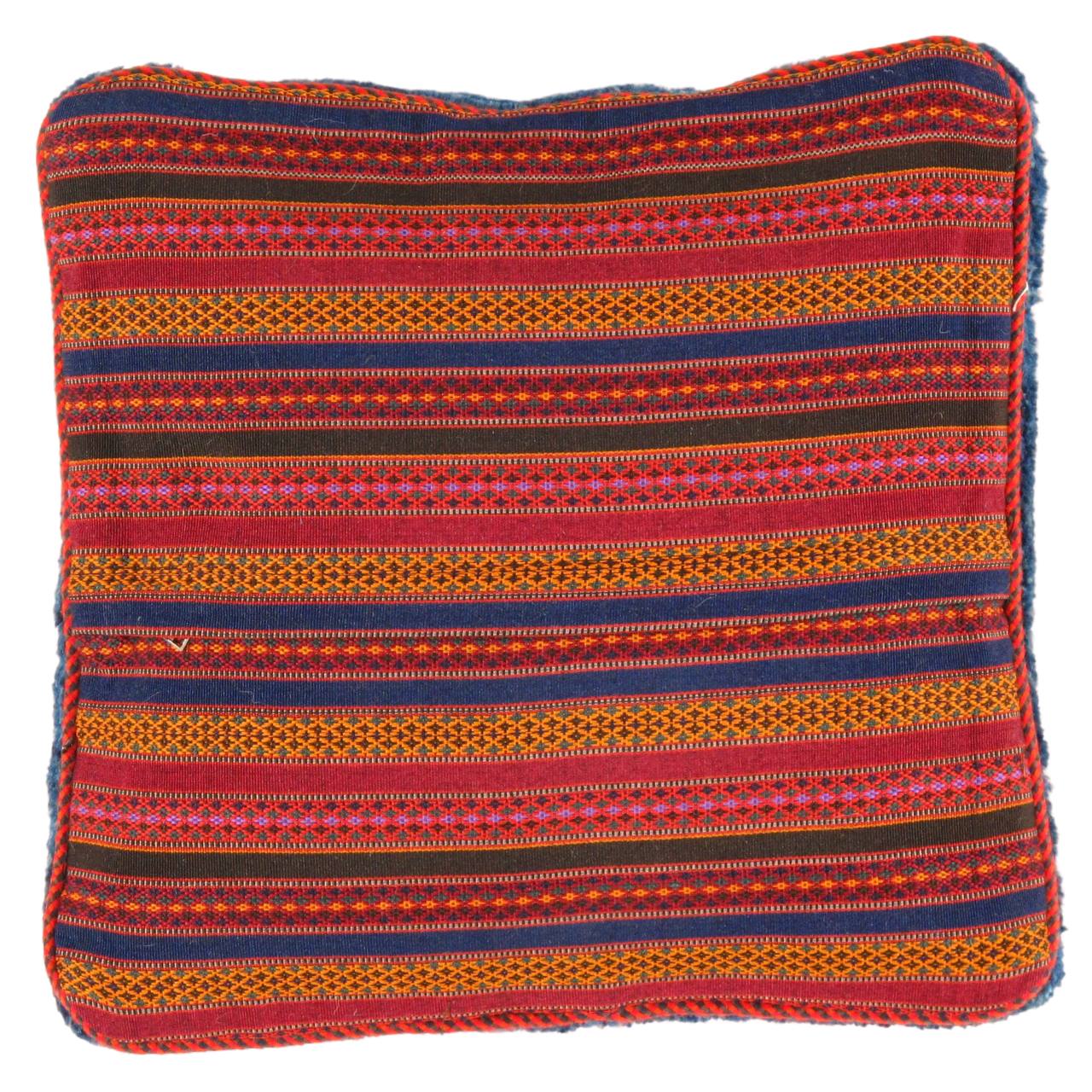 The word “Gabbeh” literally translates to “in the rough,” and it is an accurate description of this style of Persian rug. Gabbeh carpets are woven on makeshift ground looms constructed both of materials that are kept and hauled for long distances by the nomadic tribel, and also of materials that are found at each site where the tribe sets up camp. Due to the fact that part of the loom must be found at each site, a wide variety is introduced. Thus, these rugs are usually somewhat irregular in shape. But, for what they lack in perfectly uniform shape they more than make up for in character, durability and uniqueness.This Gabbeh pillow is made of high-quality LAMBS WOOL The piece was crafted with good workmanship.