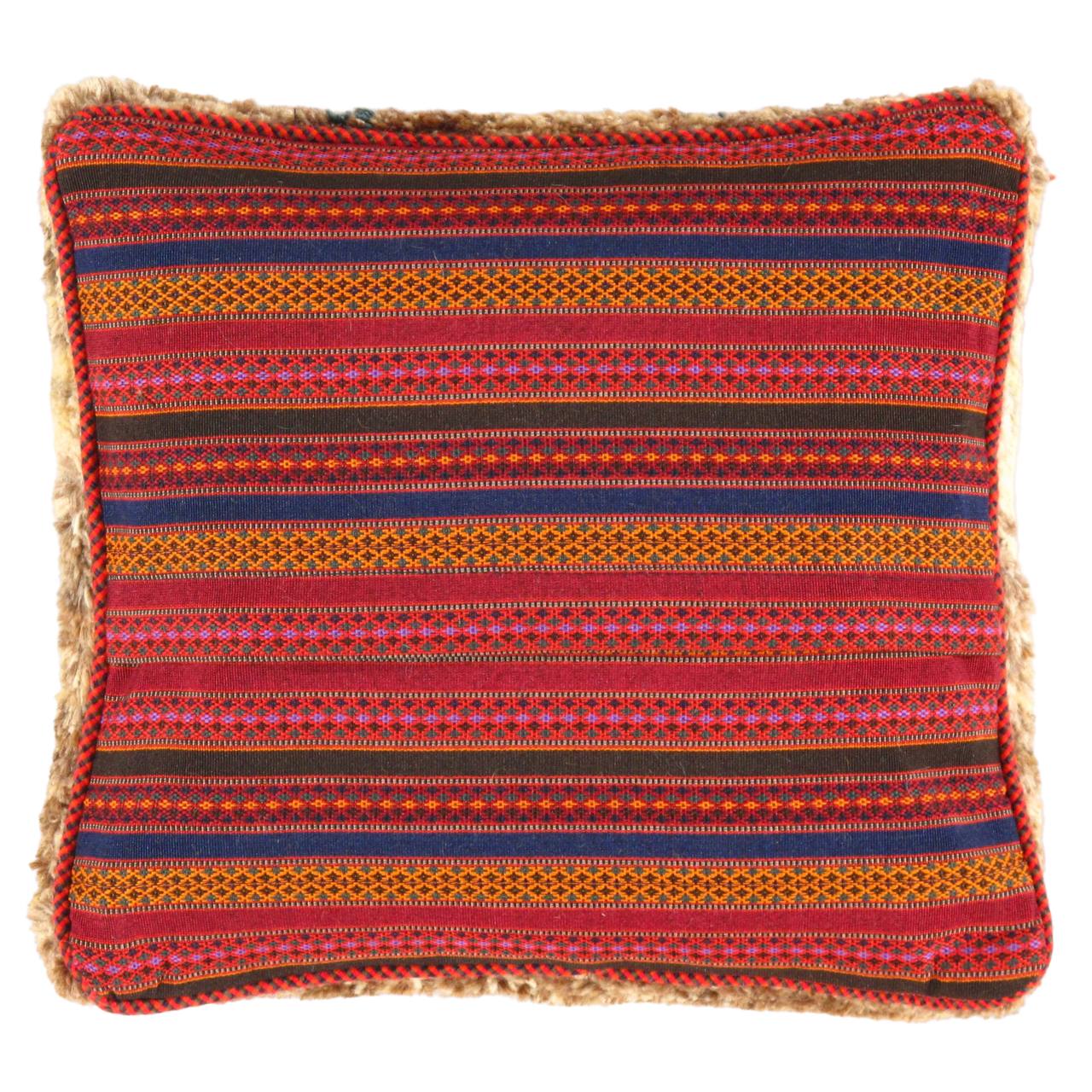The word “Gabbeh” literally translates to “in the rough,” and it is an accurate description of this style of Persian rug. Gabbeh carpets are woven on makeshift ground looms constructed both of materials that are kept and hauled for long distances by the nomadic tribel, and also of materials that are found at each site where the tribe sets up camp. Due to the fact that part of the loom must be found at each site, a wide variety is introduced. Thus, these rugs are usually somewhat irregular in shape. But, for what they lack in perfectly uniform shape they more than make up for in character, durability and uniqueness.This Gabbeh pillow is made of high-quality LAMBS WOOL The piece was crafted with good workmanship.