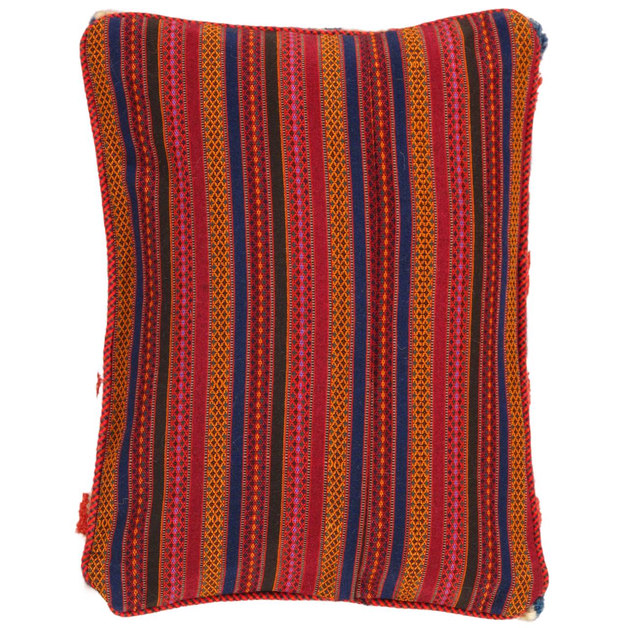 The word “Gabbeh” literally translates to “in the rough,” and it is an accurate description of this style of Persian rug. Gabbeh carpets are woven on makeshift ground looms constructed both of materials that are kept and hauled for long distances by the nomadic tribel, and also of materials that are found at each site where the tribe sets up camp. Due to the fact that part of the loom must be found at each site, a wide variety is introduced. Thus, these rugs are usually somewhat irregular in shape. But, for what they lack in perfectly uniform shape they more than make up for in character, durability and uniqueness.This Gabbeh pillow is made of high-quality LAMBS WOOL The piece was crafted with good workmanship.