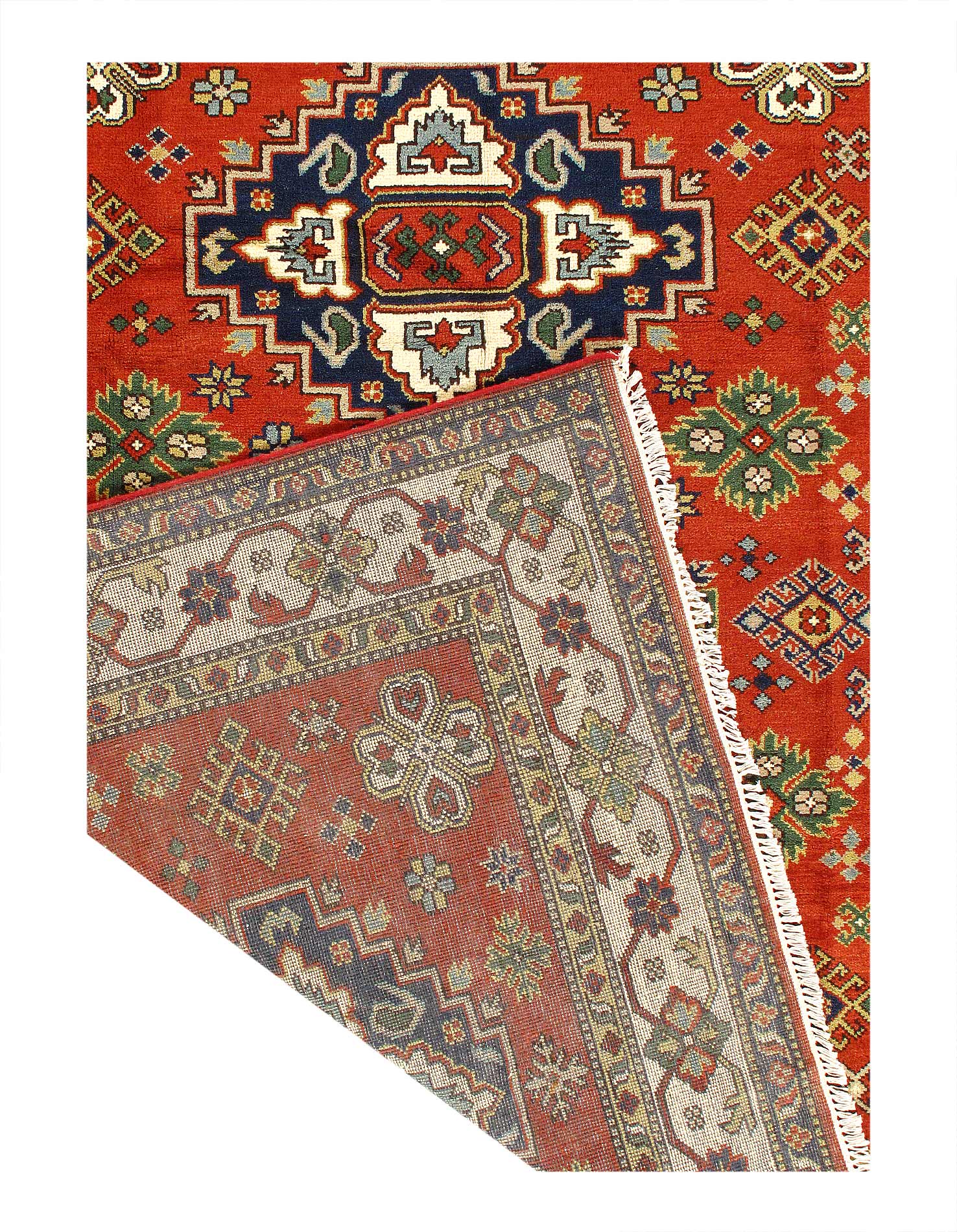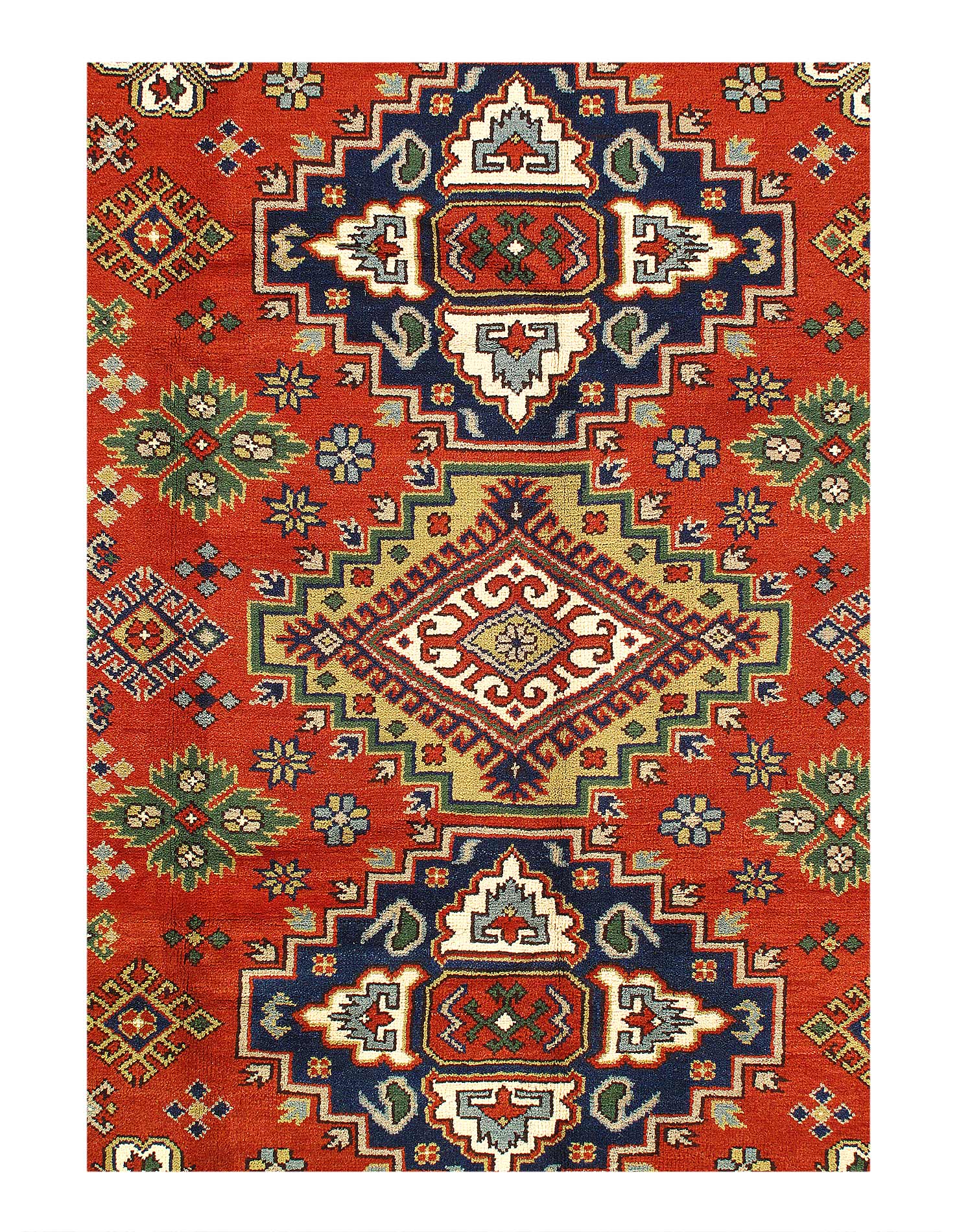 Beautiful Kazak rugs are characterized by their geometric designs. These Oriental rugs are newly-produced in Pakistan, and are inspired by older Russian and Caucasian rugs. The dominant colors are Red / Beige , blue /green The patterns are inspired by Russian geometric patterns and hand-spun wool used is made from natural vegetable dyes. They are made from high-quality wool, and when these hard wearing rugs are complete they are stone washed for an antique-effect finish.