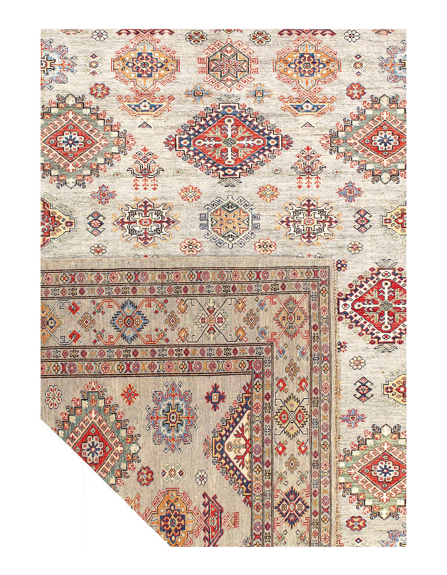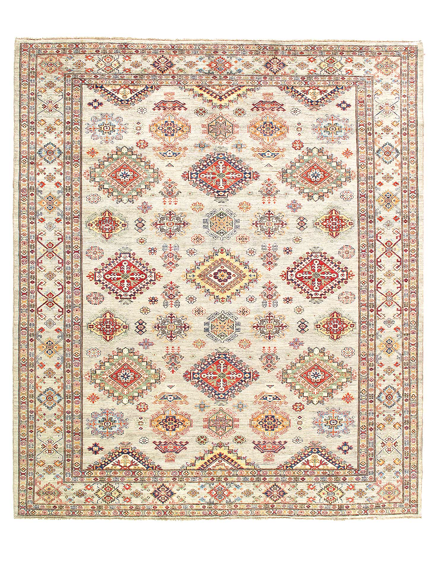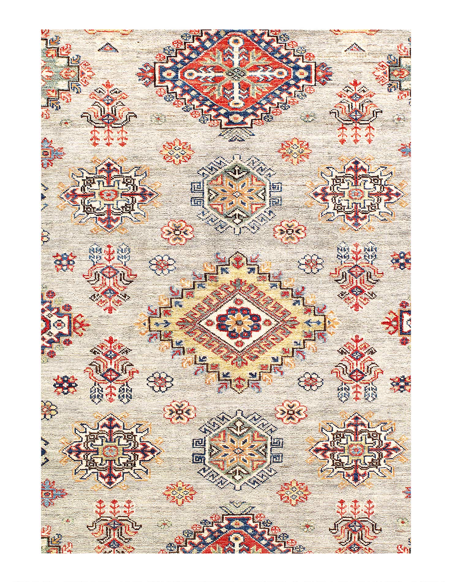 Kazak is a modern shape of old Caucasian rugs which strictly adheres to traditional design elements of the Caucasus. It has elements such as the stepped hooked polygons, geometrical medallions and rosettes, presented in more stylized manner and with a new dimension. Natural dyes produce soft luminous shades and abrashes causing a beautiful sheen. Handspun wool yarn is normally used in the variety of vibrant warm colors. Kazaks rugs in our collection are all fine quality pieces from Pakistan made with Ghazni handspun wool and natural dyes.