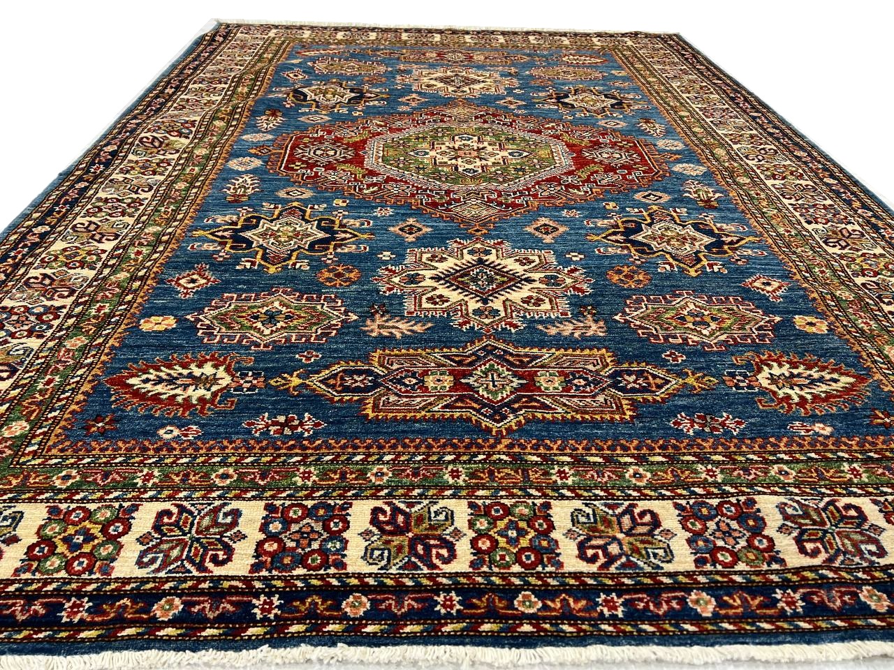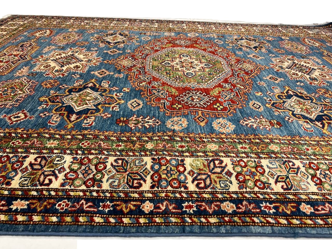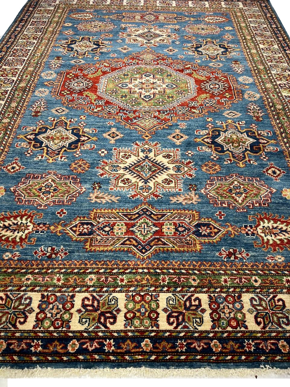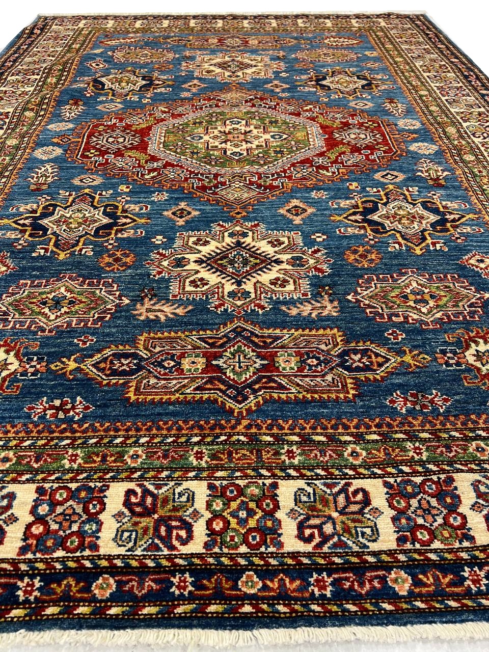 Kazak is a modern shape of old Caucasian rugs which strictly adheres to traditional design elements of the Caucasus. It has elements such as the stepped hooked polygons, geometrical medallions and rosettes, presented in more stylized manner and with a new dimension. Natural dyes produce soft luminous shades and abrashes causing a beautiful sheen. Handspun wool yarn is normally used in the variety of vibrant warm colors. Kazaks rugs in our collection are all fine quality pieces from Pakistan made with Ghazni handspun wool and natural dyes.