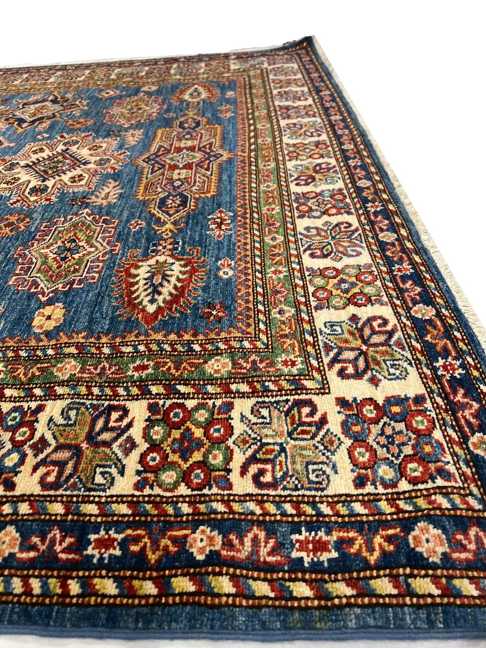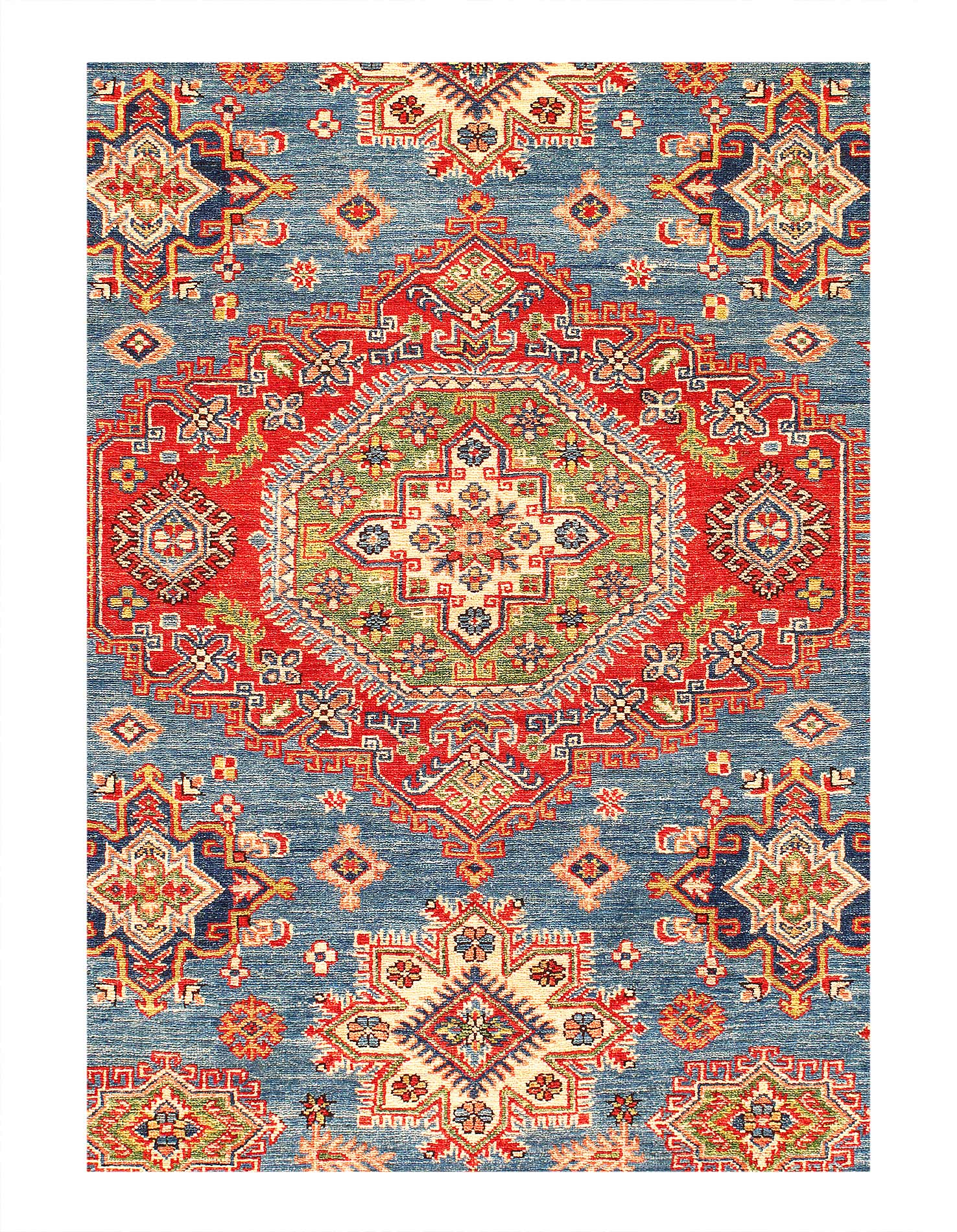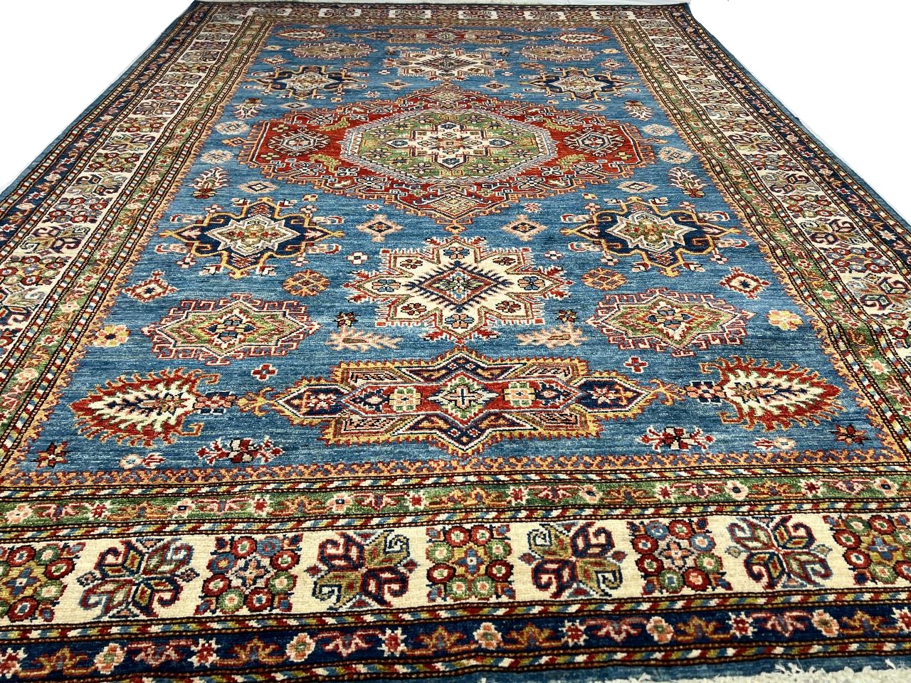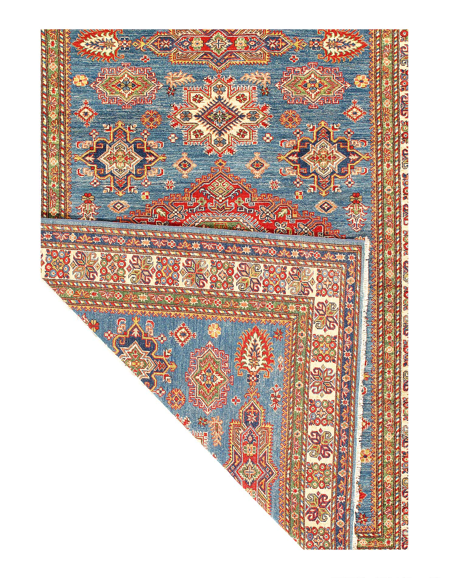 Kazak is a modern shape of old Caucasian rugs which strictly adheres to traditional design elements of the Caucasus. It has elements such as the stepped hooked polygons, geometrical medallions and rosettes, presented in more stylized manner and with a new dimension. Natural dyes produce soft luminous shades and abrashes causing a beautiful sheen. Handspun wool yarn is normally used in the variety of vibrant warm colors. Kazaks rugs in our collection are all fine quality pieces from Pakistan made with Ghazni handspun wool and natural dyes.