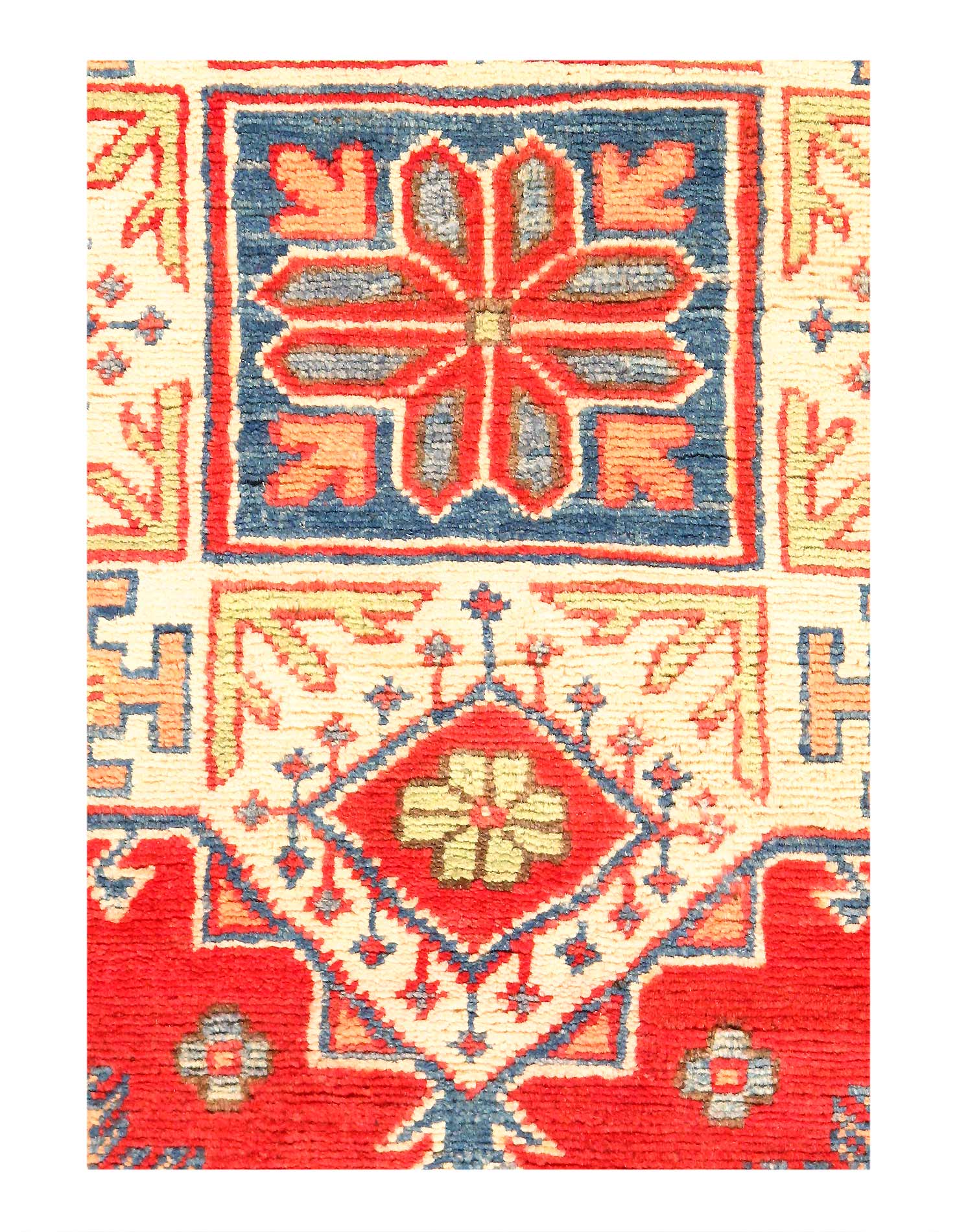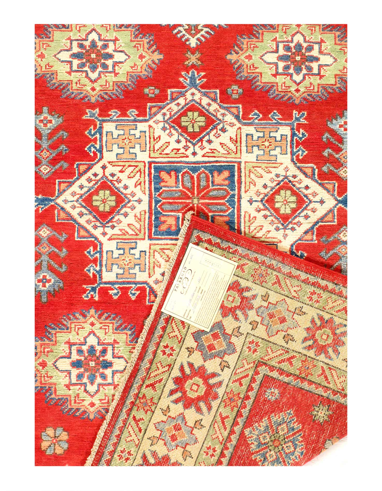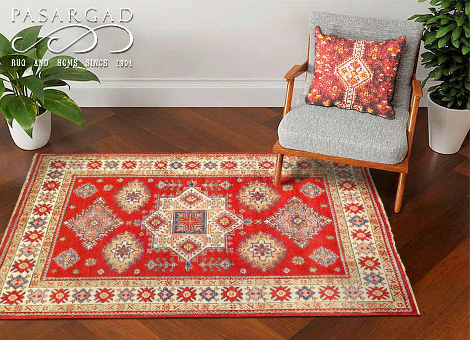 Original Super Kazak Rug. Handmade Hand-knotted,Very Practical for High Traffic,Hand-Spun Lamb's Wool on a Cotton Foundation,Vegetable Dyed,This rug is handmade from 100-percent premium, hand-spun wool, and employ ancient pot-dying techniques to give them their authentic look.Kazak is a modern shape of old Caucasian rugs which strictly adheres to traditional design elements of the Caucasus. It has elements such as the stepped hooked polygons, geometrical medallions and rosettes, presented in more stylized manner and with a new dimension. Natural dyes produce soft luminous shades and abrashes causing a beautiful sheen. Hand spun wool yarn is normally used in the variety of vibrant warm colors. Kazaks rugs in our collection are all fine quality pieces from Pakistan made with Ghazni hand spun wool and natural dyes