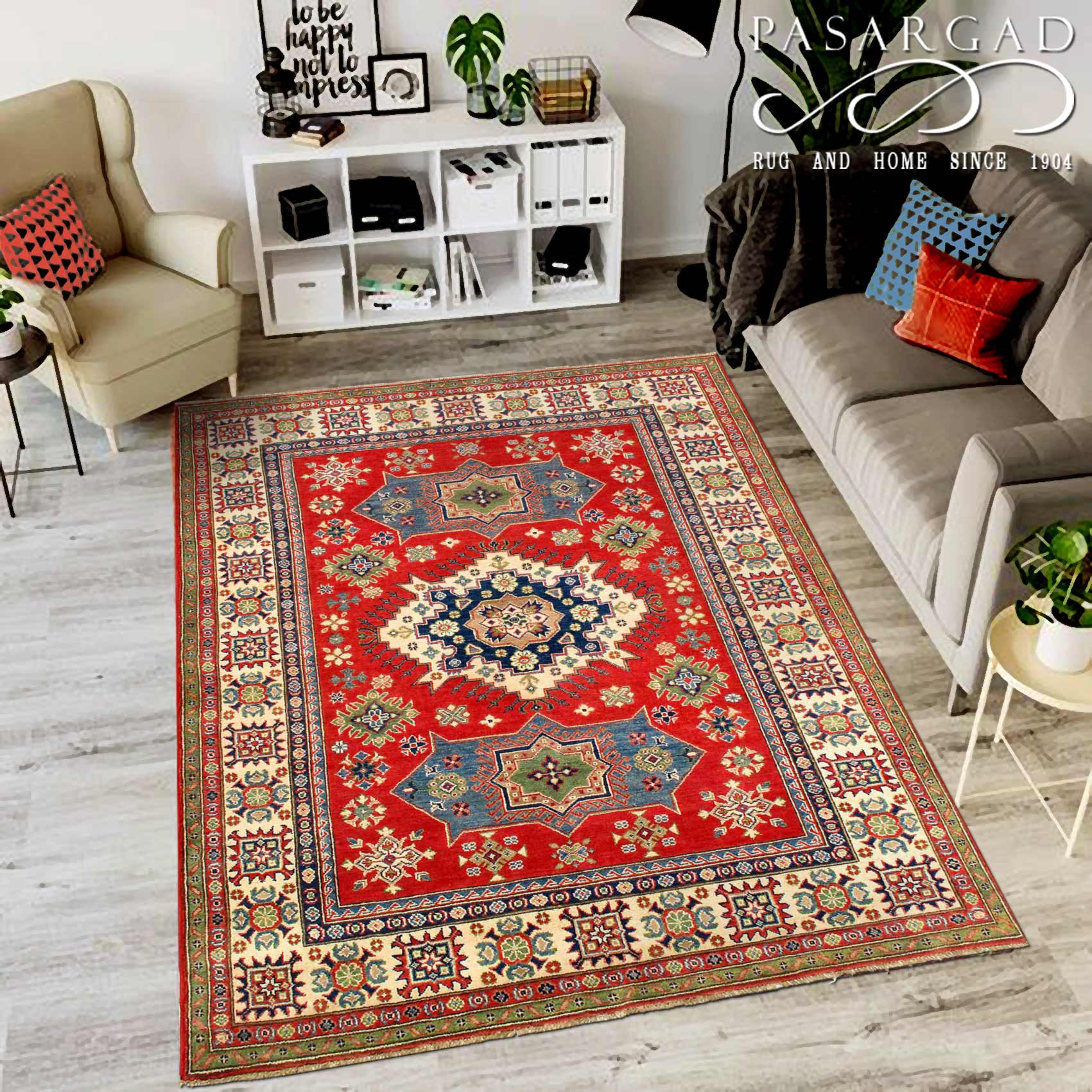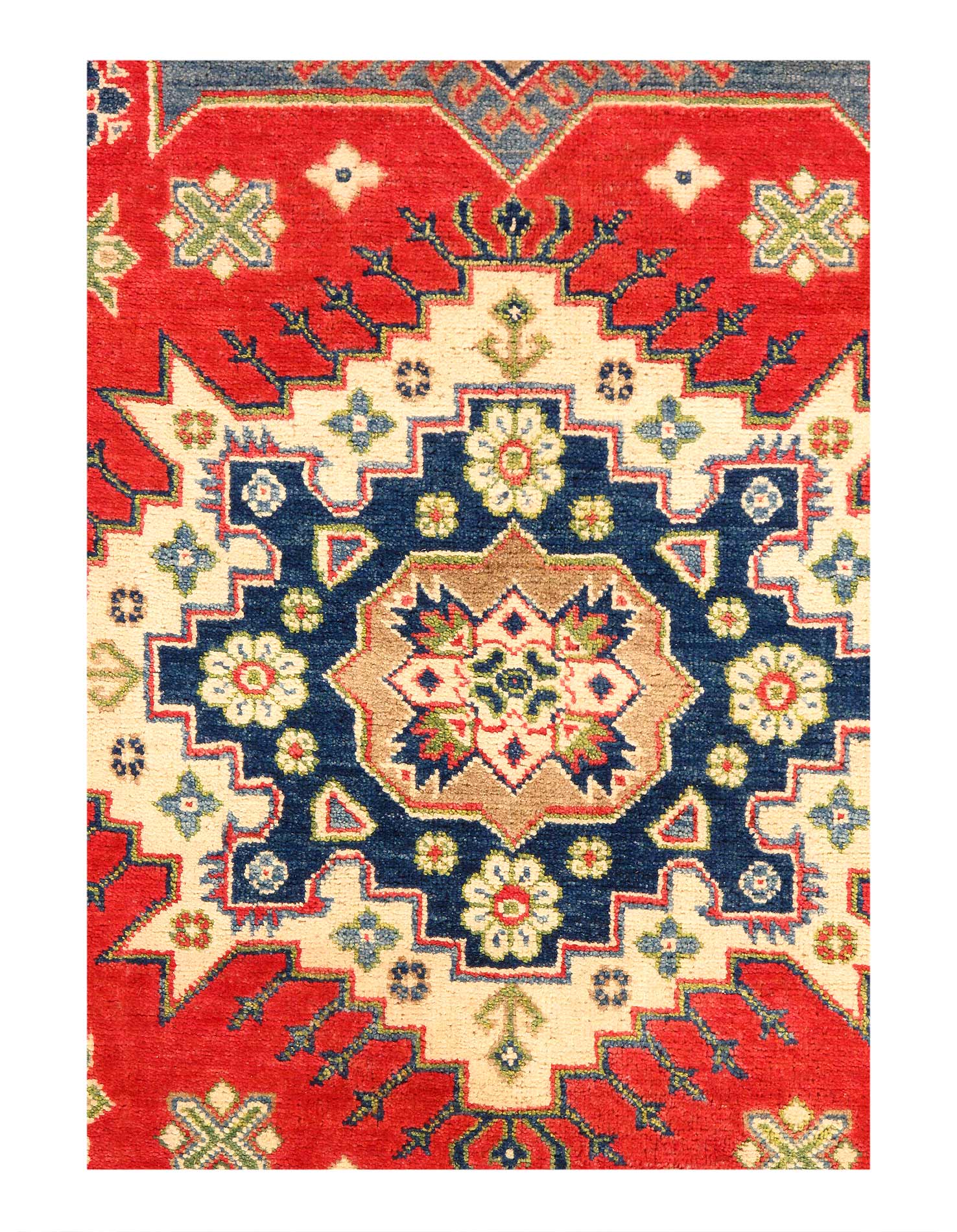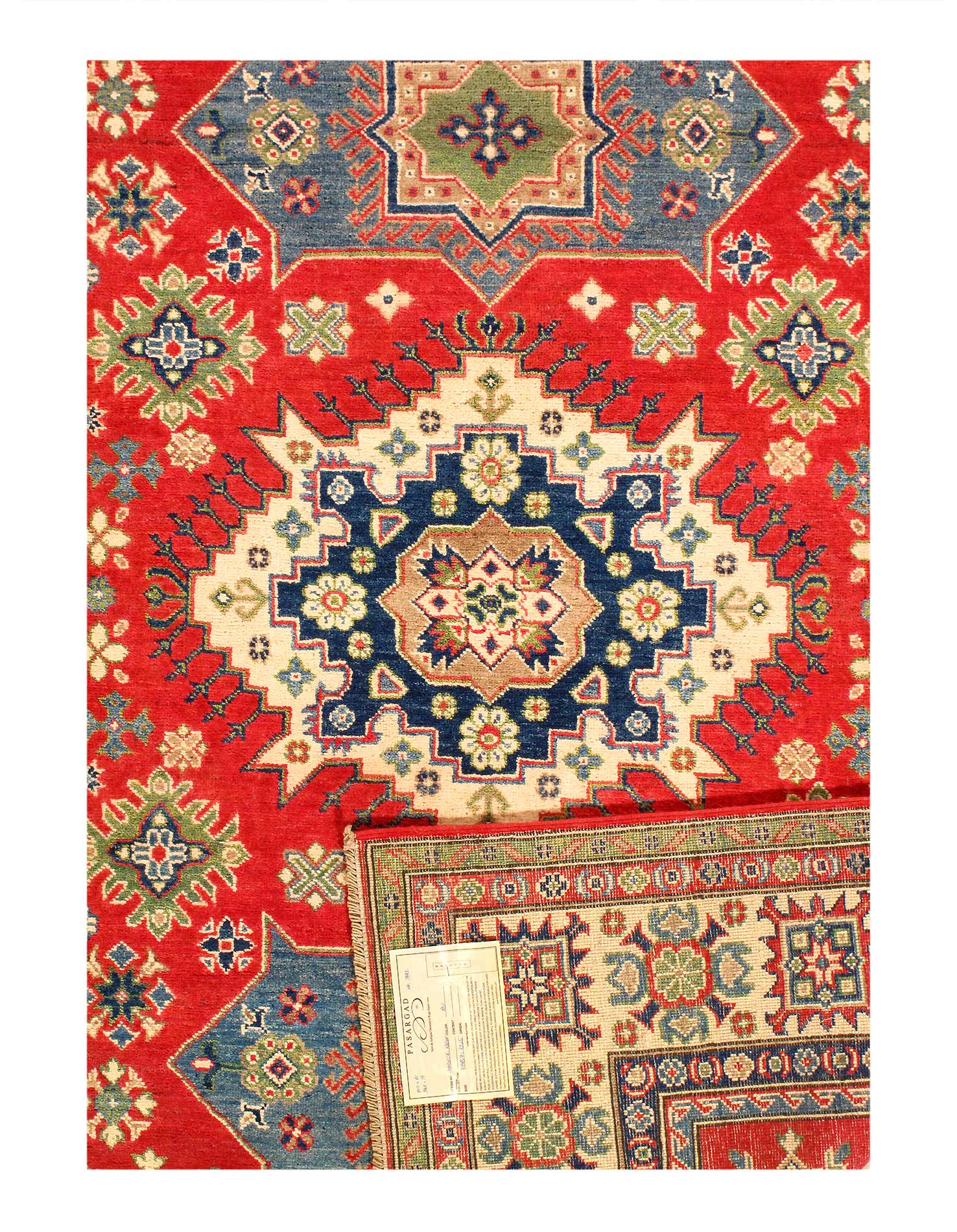 Original Super Kazak Rug. Handmade Hand-knotted,Very Practical for High Traffic,Hand-Spun Lamb's Wool on a Cotton Foundation,Vegetable Dyed,This rug is handmade from 100-percent premium, hand-spun wool, and employ ancient pot-dying techniques to give them their authentic look.Kazak is a modern shape of old Caucasian rugs which strictly adheres to traditional design elements of the Caucasus. It has elements such as the stepped hooked polygons, geometrical medallions and rosettes, presented in more stylized manner and with a new dimension. Natural dyes produce soft luminous shades and abrashes causing a beautiful sheen. Hand spun wool yarn is normally used in the variety of vibrant warm colors. Kazaks rugs in our collection are all fine quality pieces from Pakistan made with Ghazni hand spun wool and natural dyes