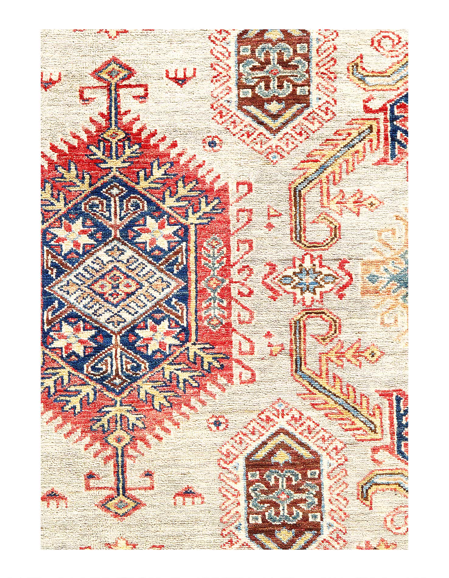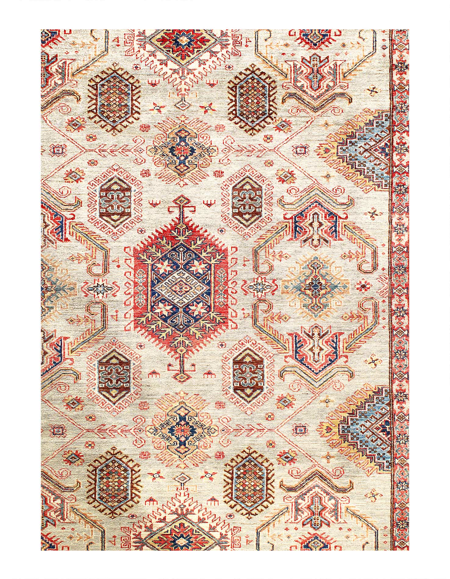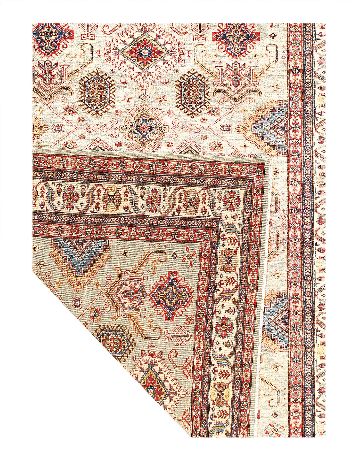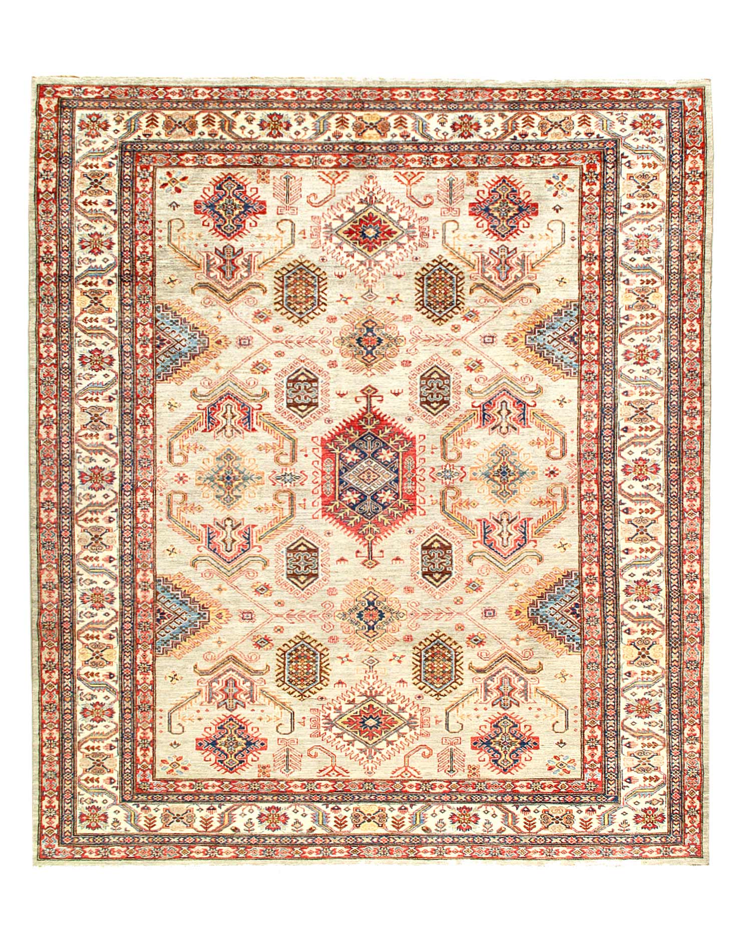 Kazak is a modern shape of old Caucasian rugs which strictly adheres to traditional design elements of the Caucasus. It has elements such as the stepped hooked polygons, geometrical medallions and rosettes, presented in more stylized manner and with a new dimension. Natural dyes produce soft luminous shades and abrashes causing a beautiful sheen. Handspun wool yarn is normally used in the variety of vibrant warm colors. Kazaks rugs in our collection are all fine quality pieces from Pakistan made with Ghazni handspun wool and natural dyes.