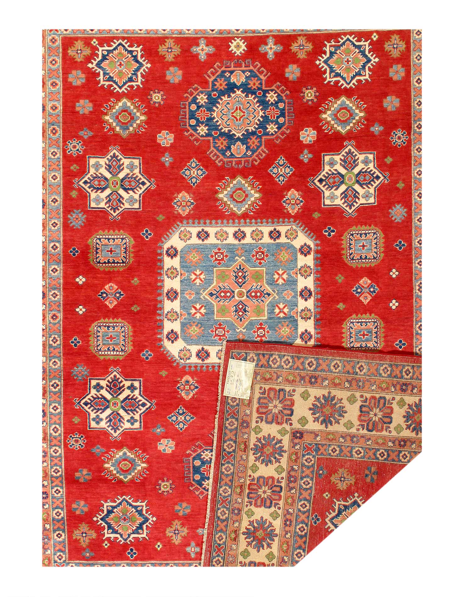 Original Super Kazak Rug. Handmade Hand-knotted,Very Practical for High Traffic,Hand-Spun Lamb's Wool on a Cotton Foundation,Vegetable Dyed,This rug is handmade from 100-percent premium, hand-spun wool, and employ ancient pot-dying techniques to give them their authentic look.Kazak is a modern shape of old Caucasian rugs which strictly adheres to traditional design elements of the Caucasus. It has elements such as the stepped hooked polygons, geometrical medallions and rosettes, presented in more stylized manner and with a new dimension. Natural dyes produce soft luminous shades and abrashes causing a beautiful sheen. Hand spun wool yarn is normally used in the variety of vibrant warm colors. Kazaks rugs in our collection are all fine quality pieces from Pakistan made with Ghazni hand spun wool and natural dyes