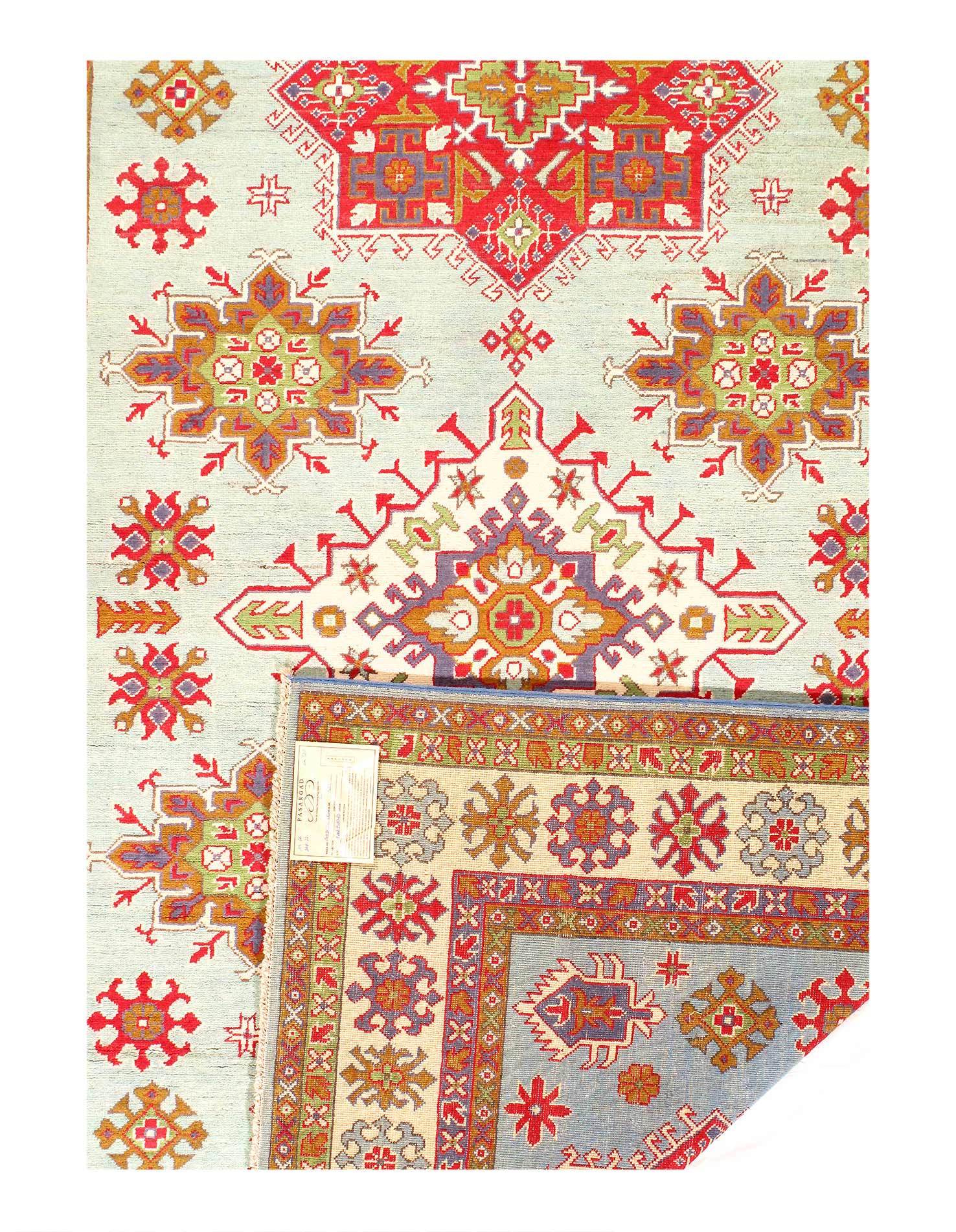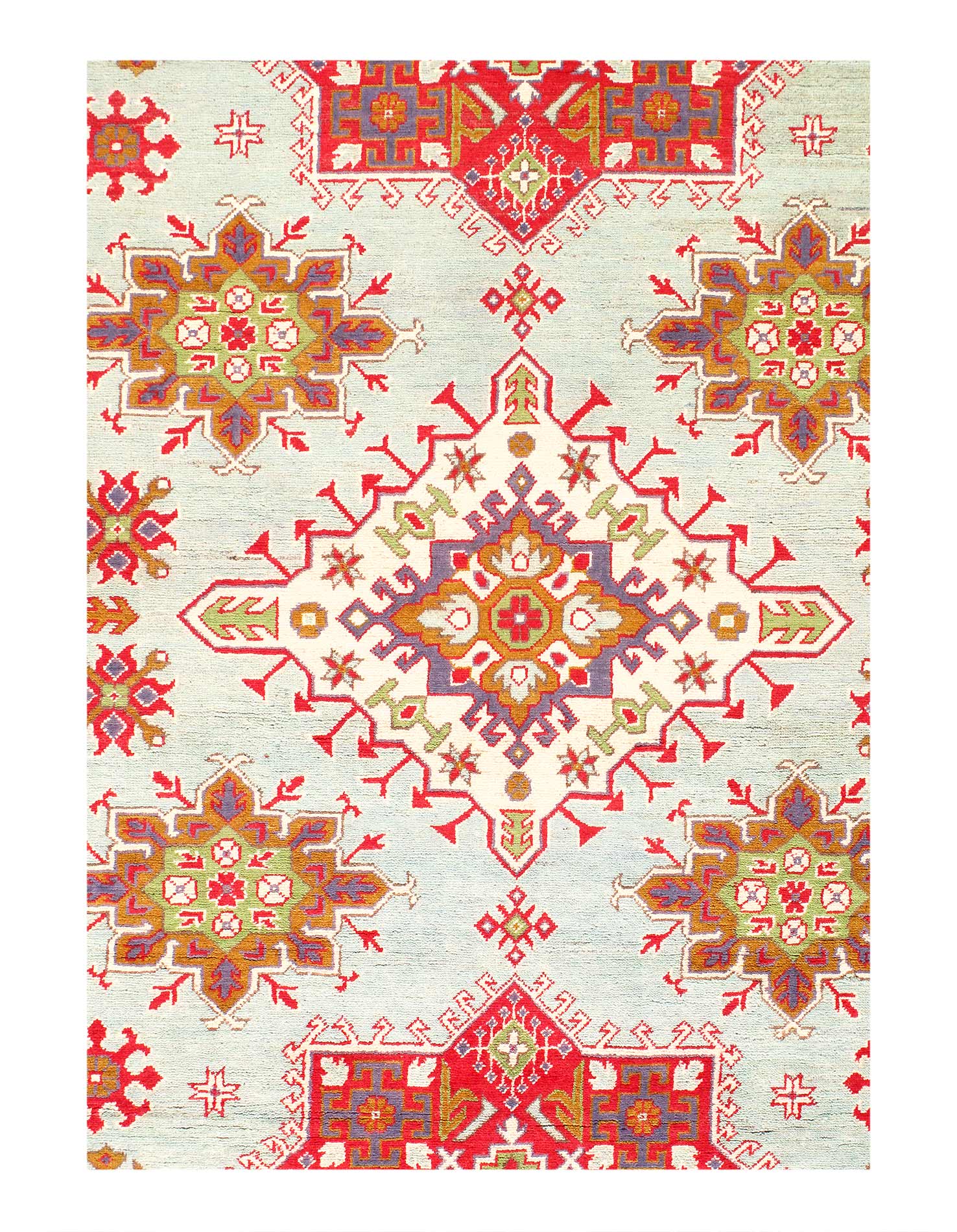 Kazak is a modern shape of old Caucasian rugs which strictly adheres to traditional design elements of the Caucasus. It has elements such as the stepped hooked polygons, geometrical medallions and rosettes, presented in more stylized manner and with a new dimension. Natural dyes produce soft luminous shades and abrashes causing a beautiful sheen. Handspun wool yarn is normally used in the variety of vibrant warm colors. Kazaks rugs in our collection are all fine quality pieces from Pakistan made with Ghazni handspun wool and natural dyes.