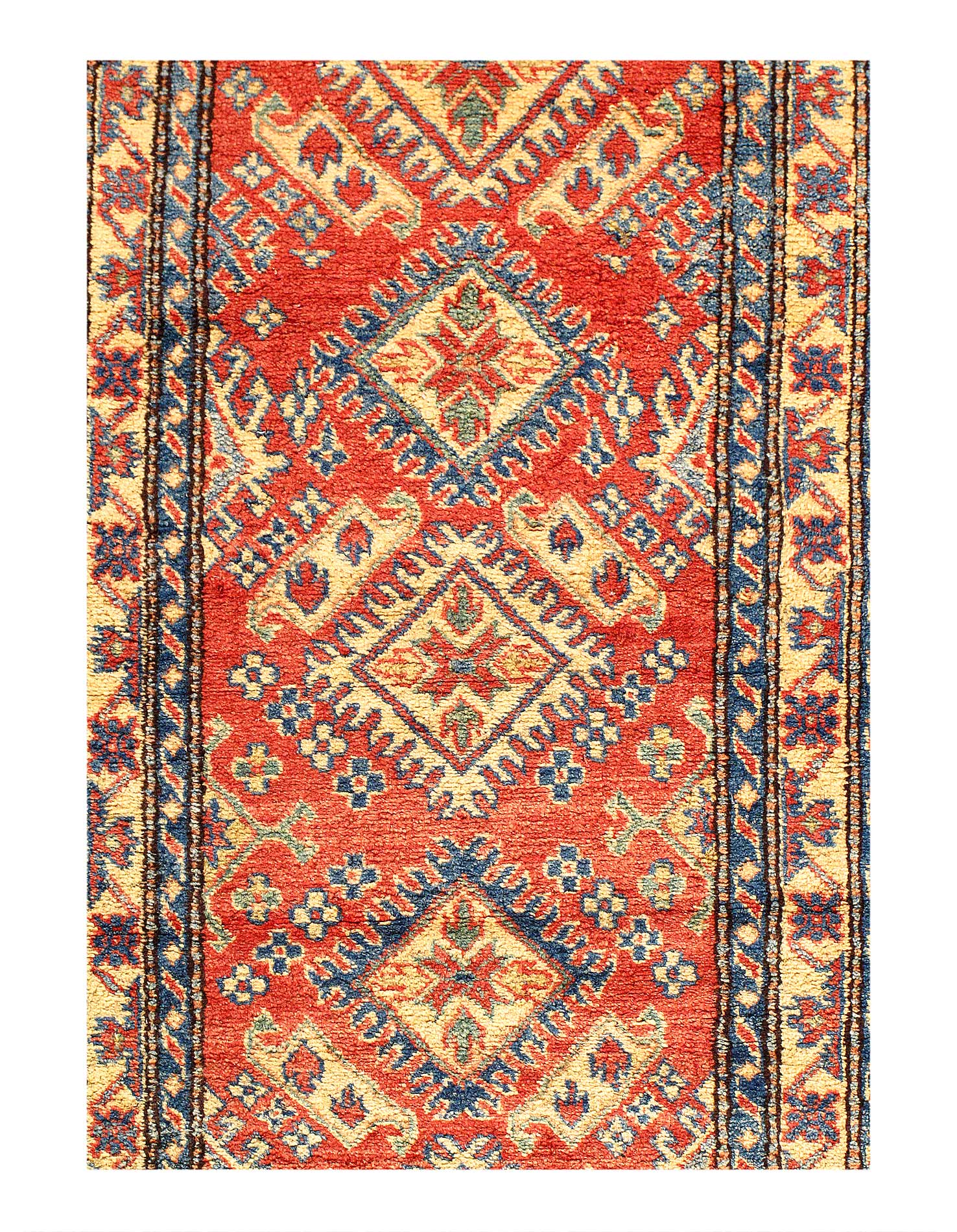 Vegetable Dyed,This rug is handmade from 100-percent premium, hand-spun wool, and employ ancient pot-dying techniques to give them their authentic look.This rug is handmade from 100-percent premium, hand-spun wool, and employ ancient pot-dying techniques to give them their authentic look.Kazak is a modern shape of old Caucasian rugs which strictly adheres to traditional design elements of the Caucasus. It has elements such as the stepped hooked polygons, geometrical medallions and rosettes, presented in more stylized manner and with a new dimension. Natural dyes produce soft luminous shades and abrashes causing a beautiful sheen. Hand spun wool yarn is normally used in the variety of vibrant warm colors. Kazaks rugs in our collection are all fine quality pieces from Pakistan made with Ghazni handspun wool and natural dyes.