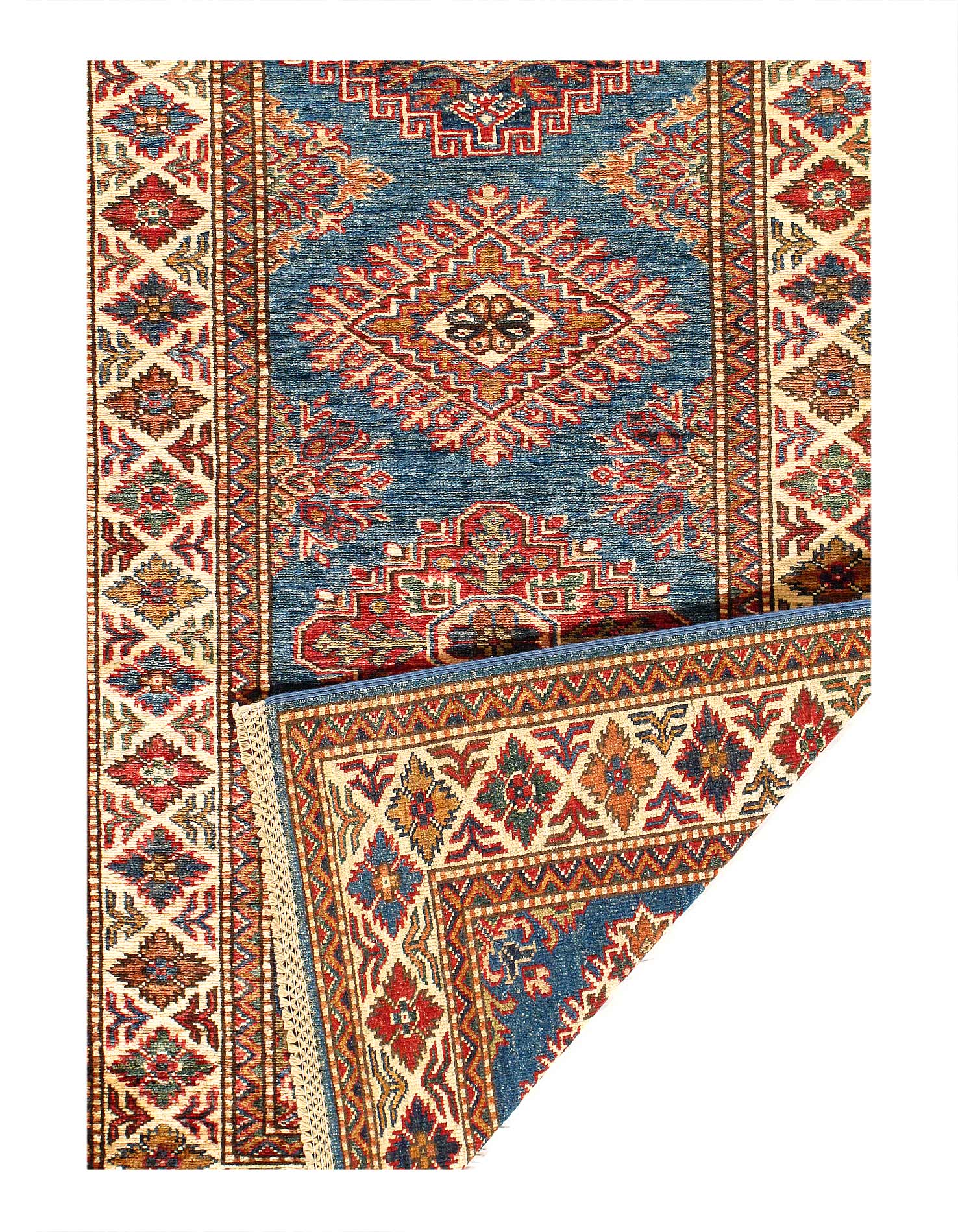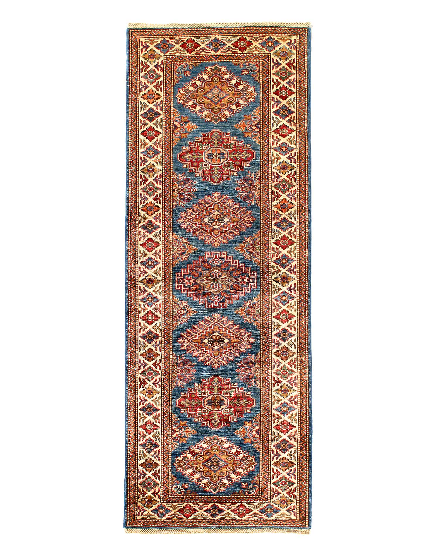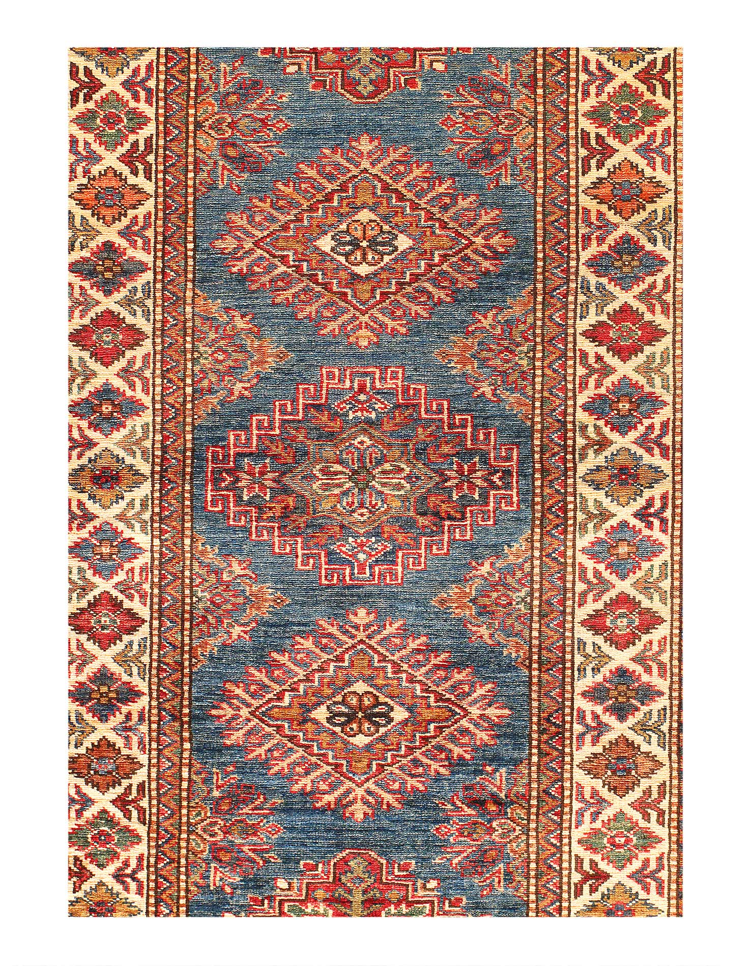 Kazak is a modern shape of old Caucasian rugs which strictly adheres to traditional design elements of the Caucasus. It has elements such as the stepped hooked polygons, geometrical medallions and rosettes, presented in more stylized manner and with a new dimension. Natural dyes produce soft luminous shades and abrashes causing a beautiful sheen. Handspun wool yarn is normally used in the variety of vibrant warm colors. Kazaks rugs in our collection are all fine quality pieces from Pakistan made with Ghazni handspun wool and natural dyes.