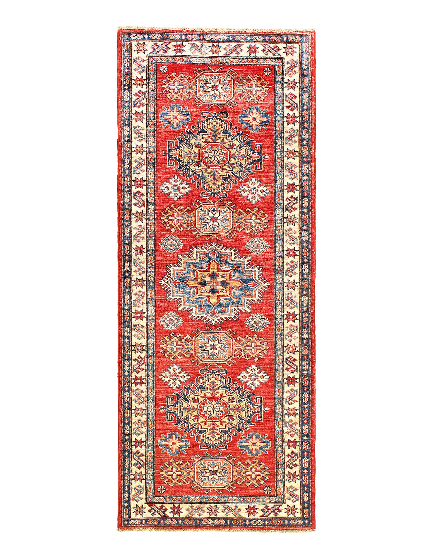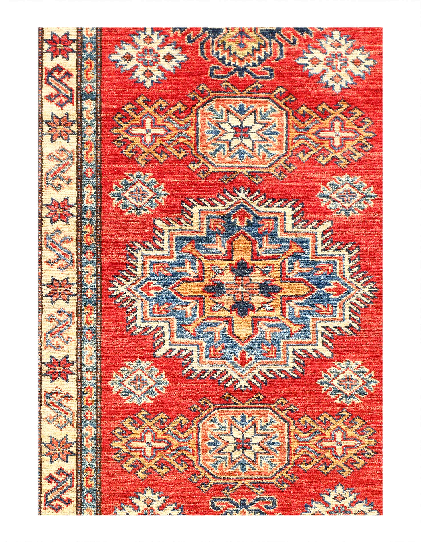 Kazak is a modern shape of old Caucasian rugs which strictly adheres to traditional design elements of the Caucasus. It has elements such as the stepped hooked polygons, geometrical medallions and rosettes, presented in more stylized manner and with a new dimension. Natural dyes produce soft luminous shades and abrashes causing a beautiful sheen. Handspun wool yarn is normally used in the variety of vibrant warm colors. Kazaks rugs in our collection are all fine quality pieces from Pakistan made with Ghazni handspun wool and natural dyes.