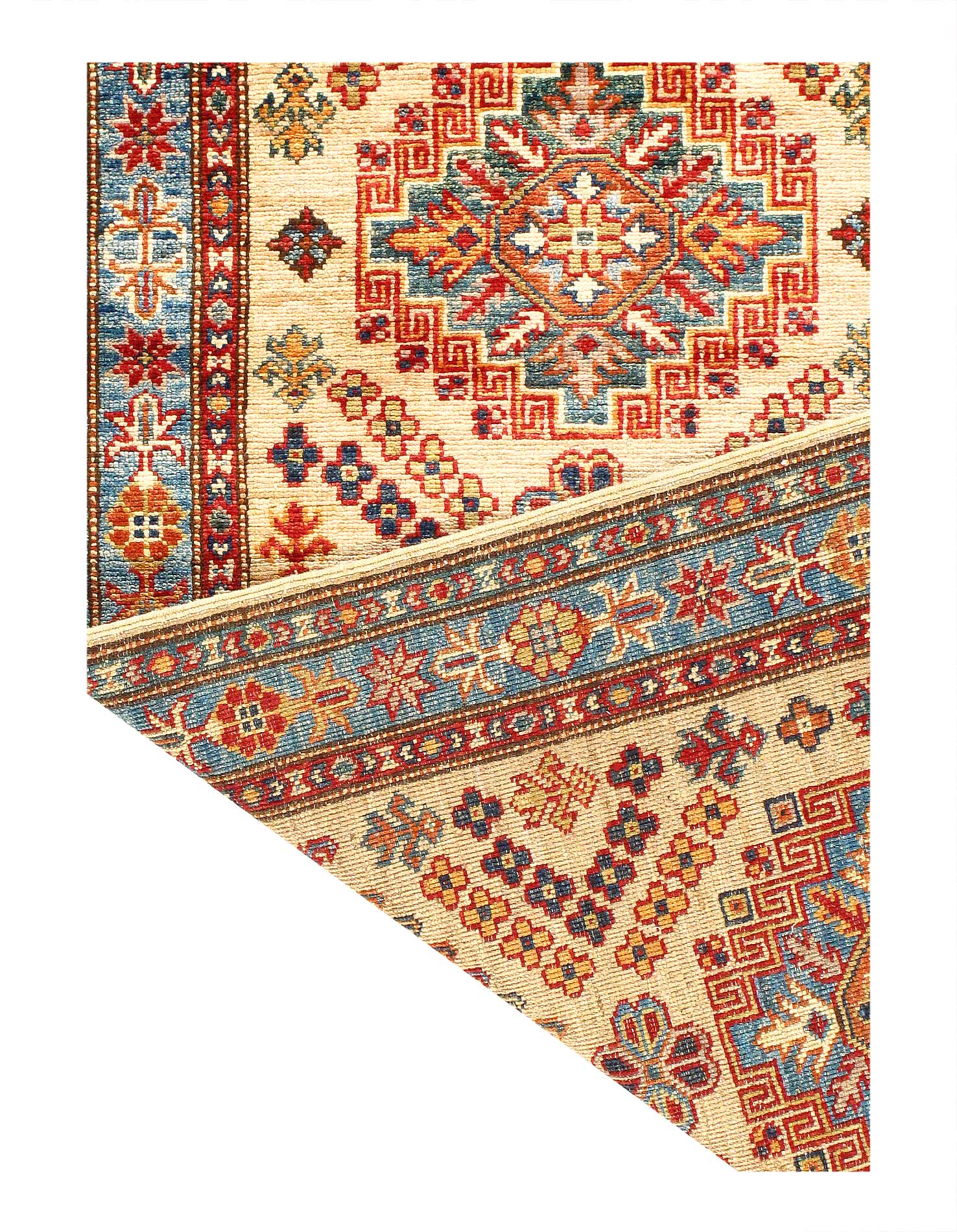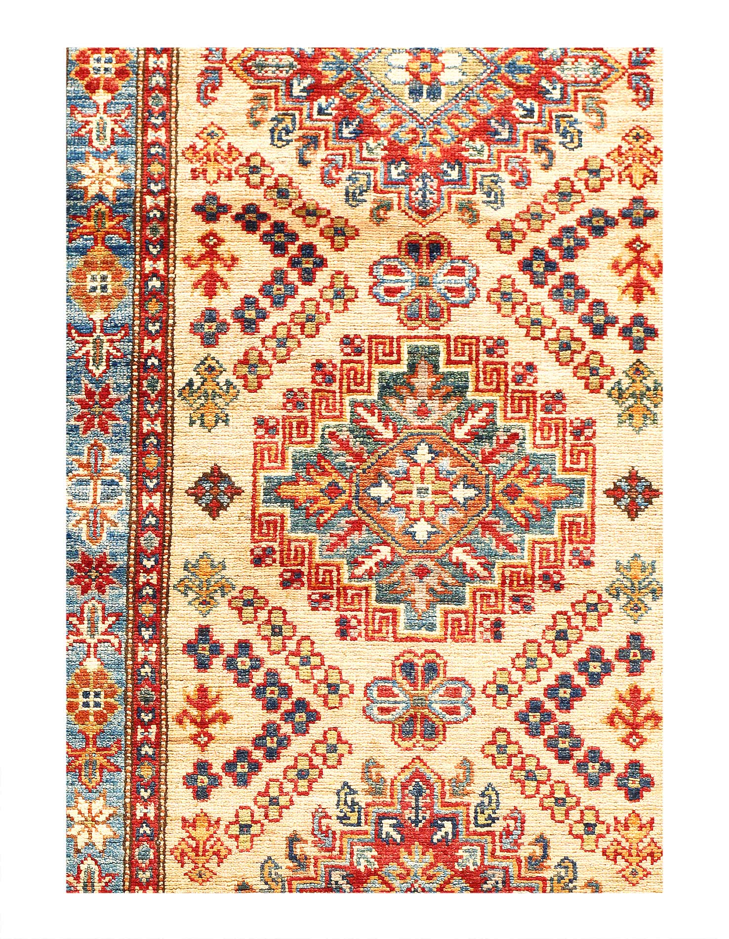 Kazak is a modern shape of old Caucasian rugs which strictly adheres to traditional design elements of the Caucasus. It has elements such as the stepped hooked polygons, geometrical medallions and rosettes, presented in more stylized manner and with a new dimension. Natural dyes produce soft luminous shades and abrashes causing a beautiful sheen. Handspun wool yarn is normally used in the variety of vibrant warm colors. Kazaks rugs in our collection are all fine quality pieces from Pakistan made with Ghazni handspun wool and natural dyes.
