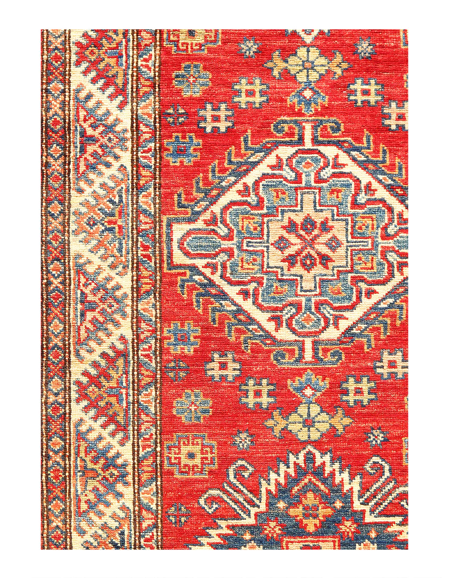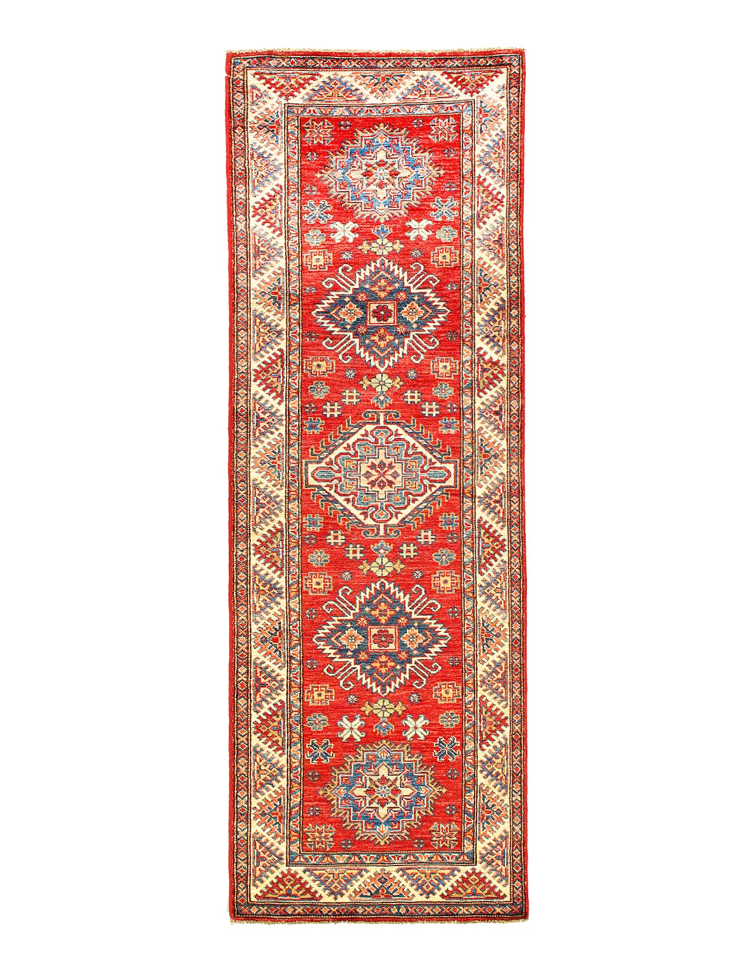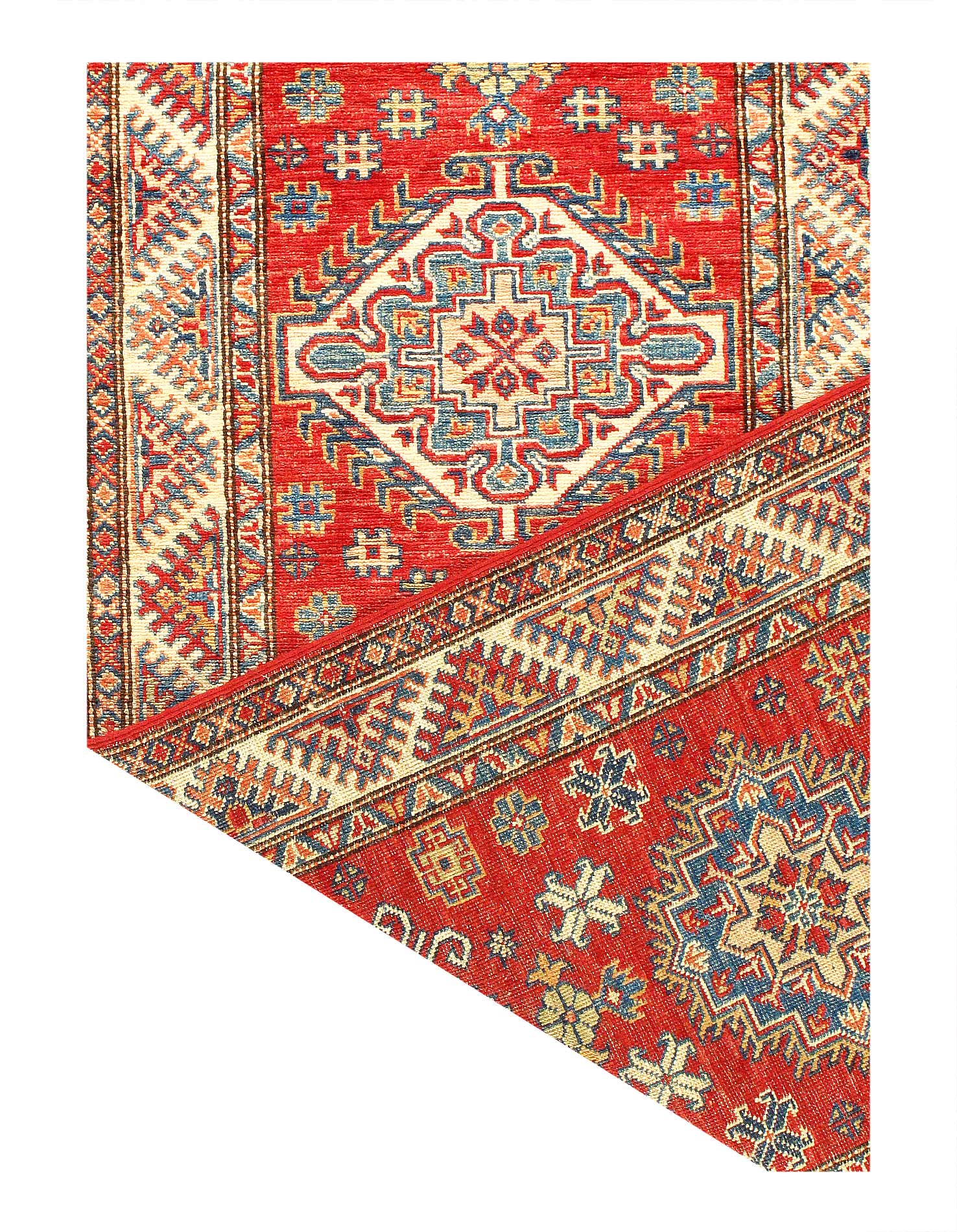 Kazak is a modern shape of old Caucasian rugs which strictly adheres to traditional design elements of the Caucasus. It has elements such as the stepped hooked polygons, geometrical medallions and rosettes, presented in more stylized manner and with a new dimension. Natural dyes produce soft luminous shades and abrashes causing a beautiful sheen. Handspun wool yarn is normally used in the variety of vibrant warm colors. Kazaks rugs in our collection are all fine quality pieces from Pakistan made with Ghazni handspun wool and natural dyes.
